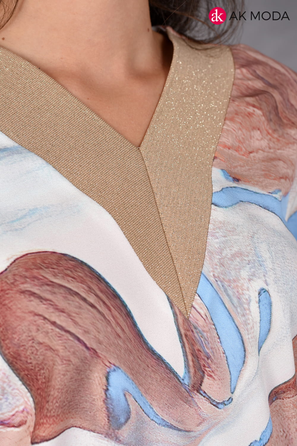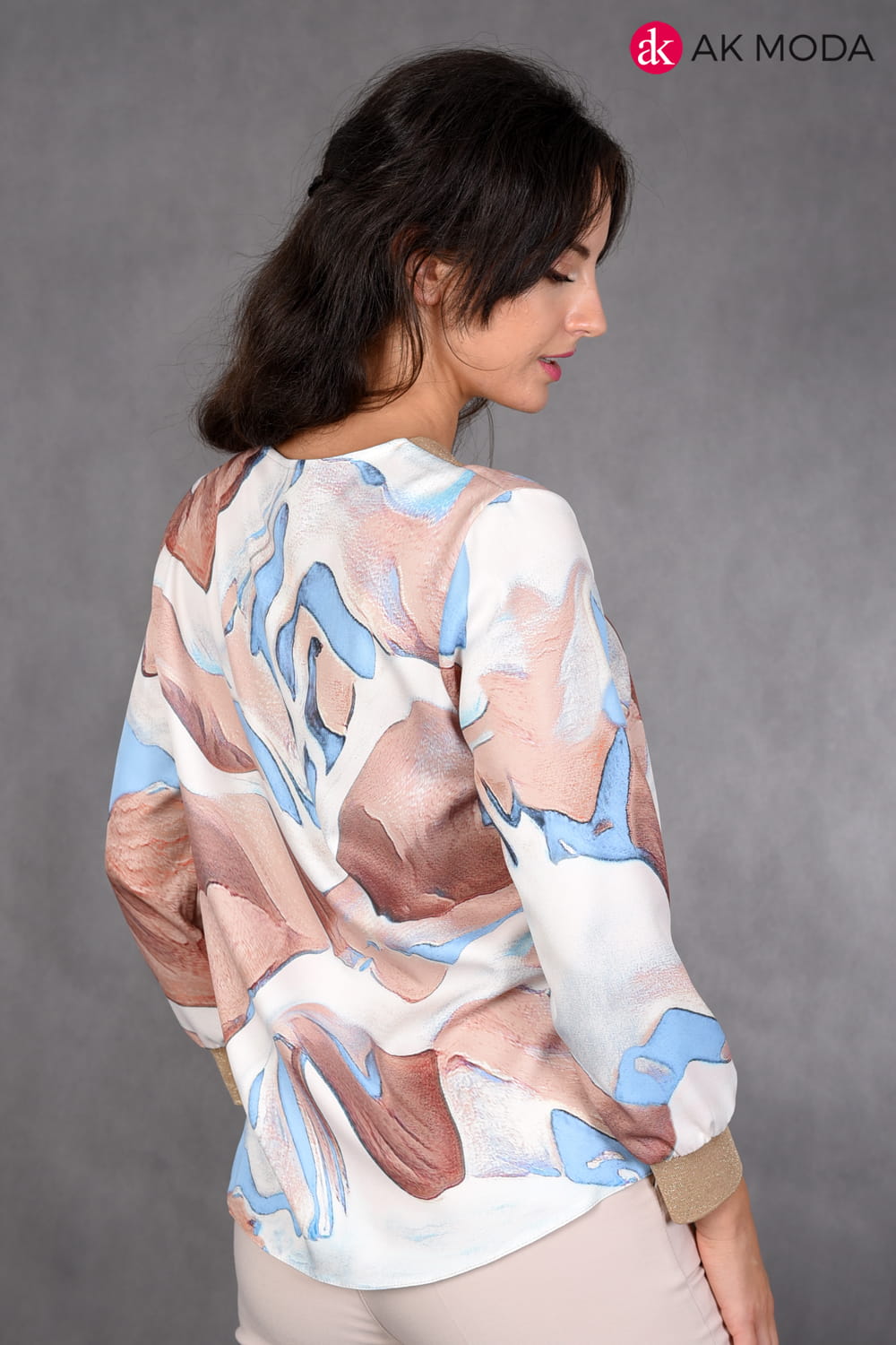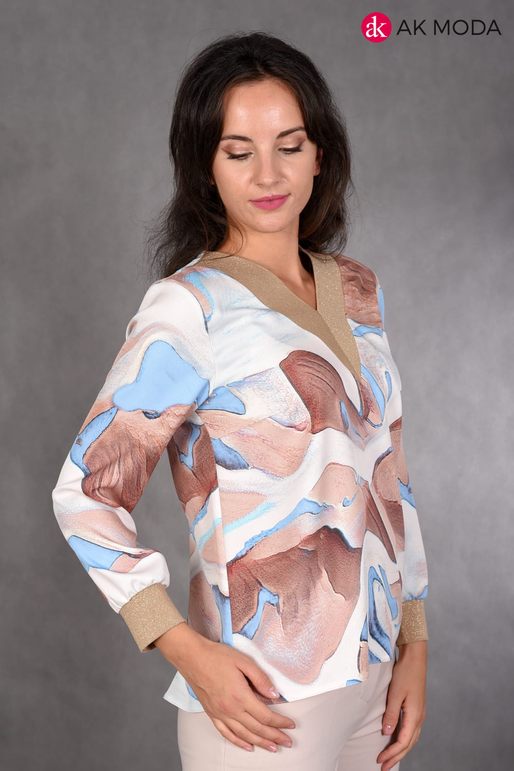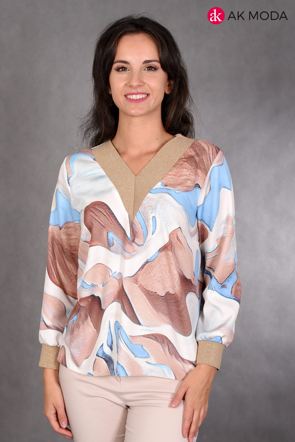 Bluzka w beżowo - niebieskie wzory z rękawem 3/4 i dekoltem w szpic. Rękawy i dekolt zakończone ozdobną szeroką listwą.