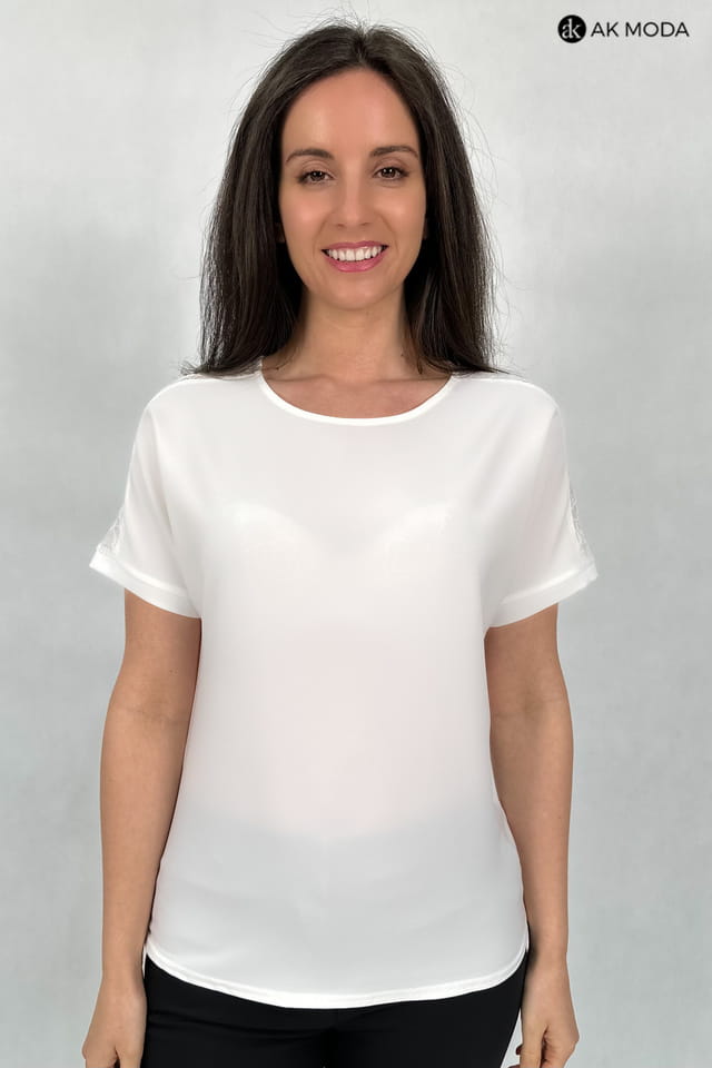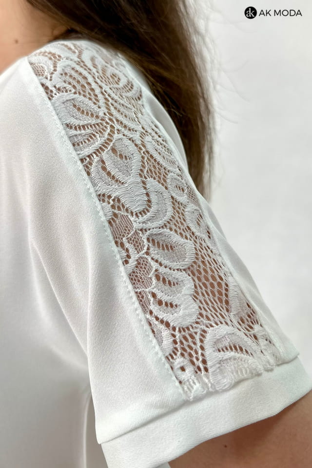 Śmietankowa bluzka z okrągłym dekoltem. Krótkie rękawy z koronkowymi wstawkami.