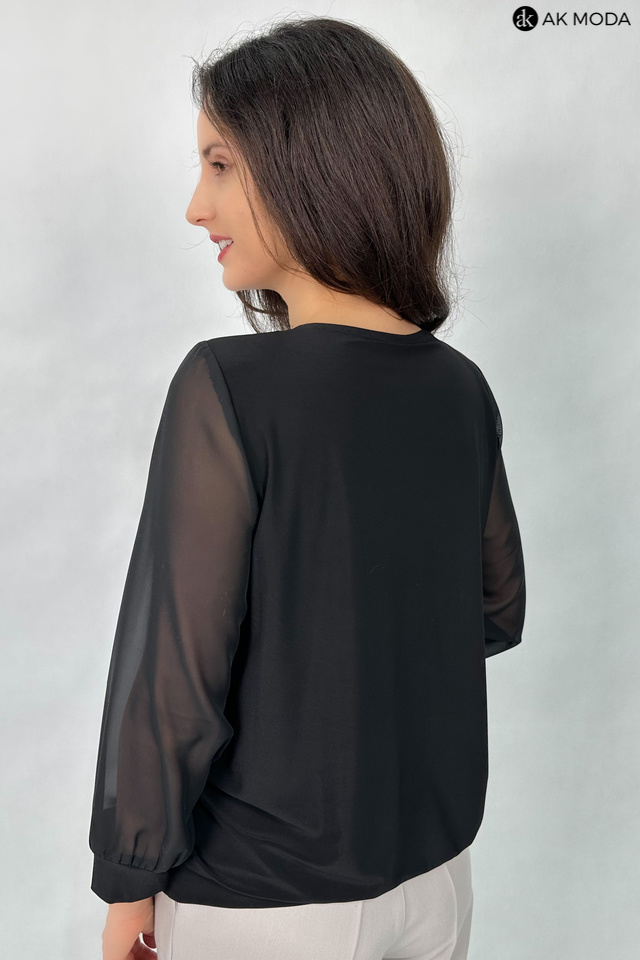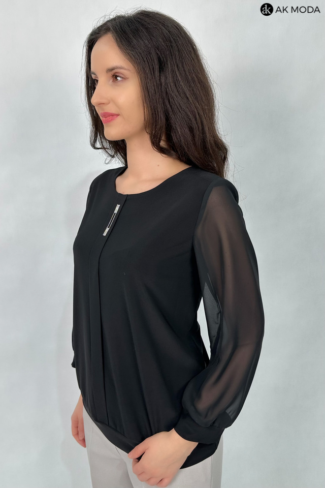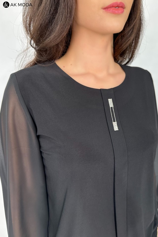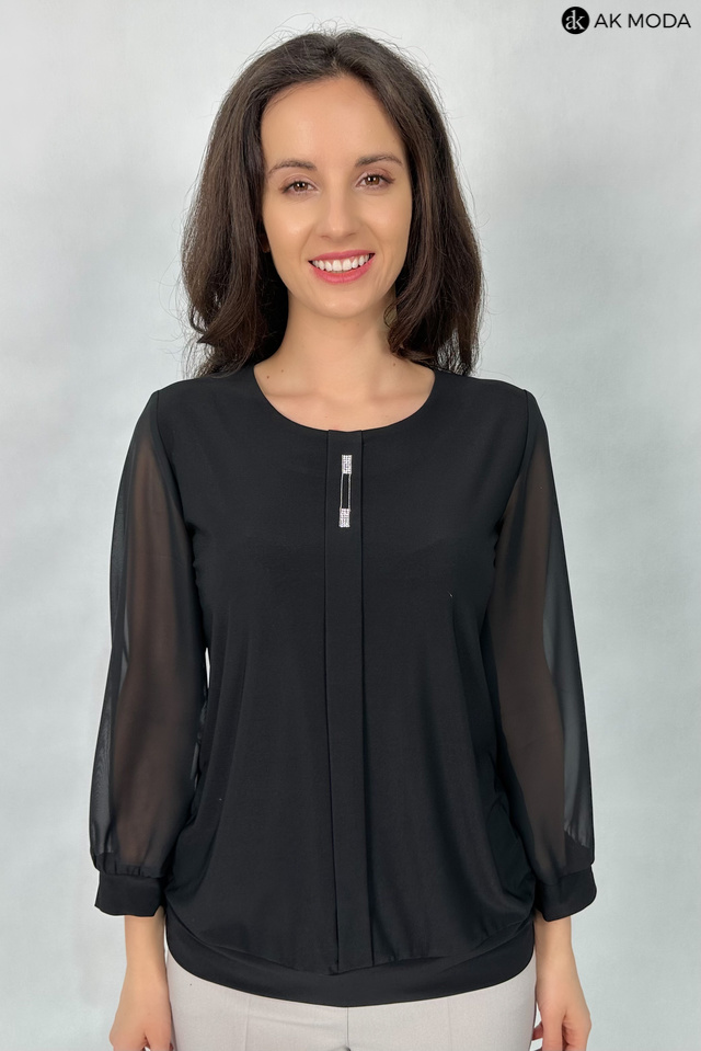 Elegancka bluzka w kolorze czarnym z plisą ozdobioną cyrkoniami. Dekolt okrągły, transparentne rękawy 3/4. Bluzka uszyta z elastycznego materiału.