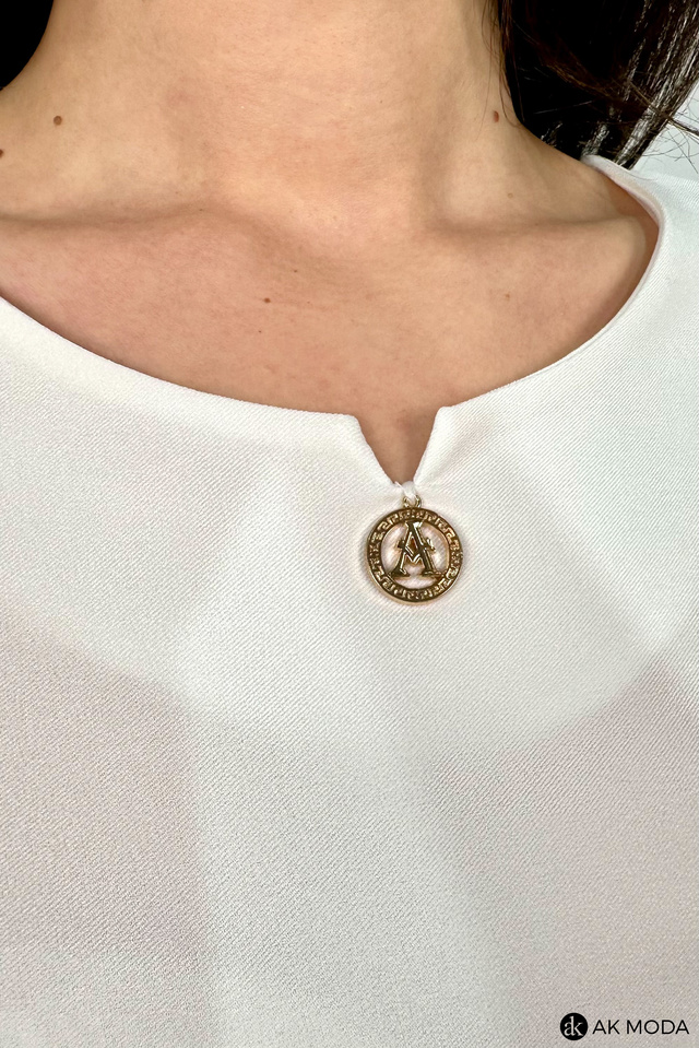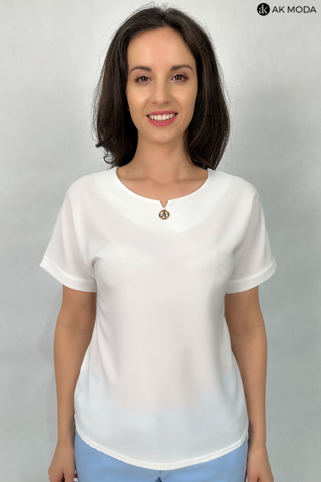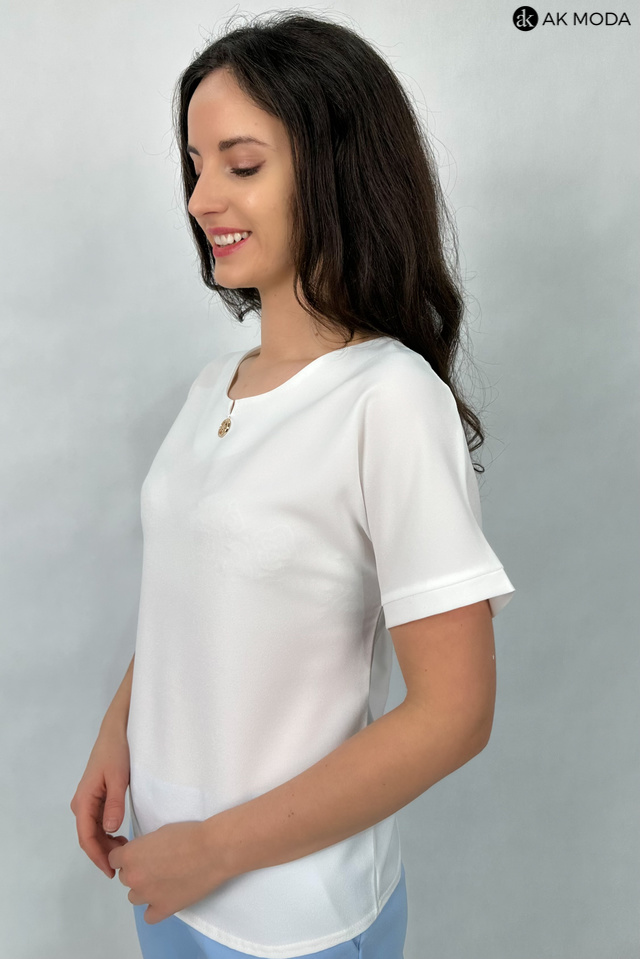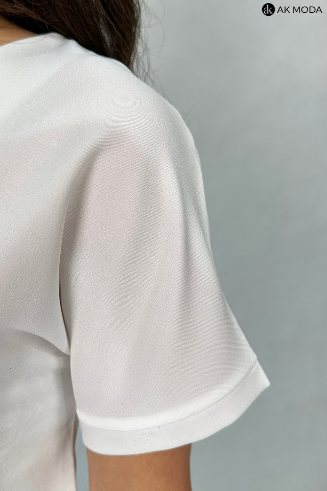 Elegancka bluzka w kolorze ecru. Dekolt okrągły z pęknięciem, krótkie, kimonowe rękawy.