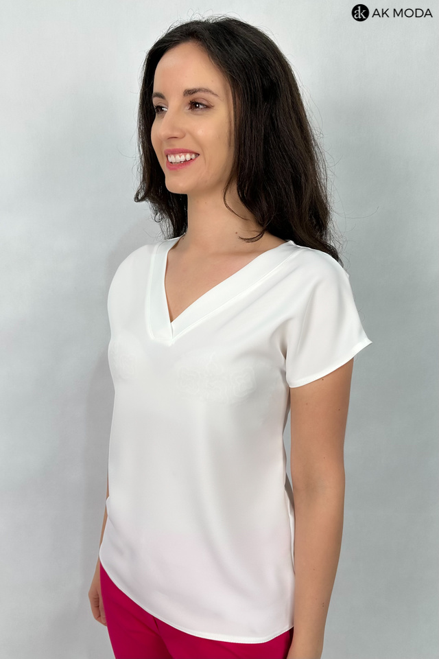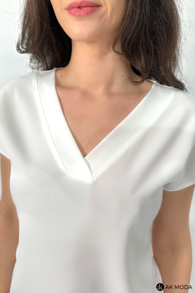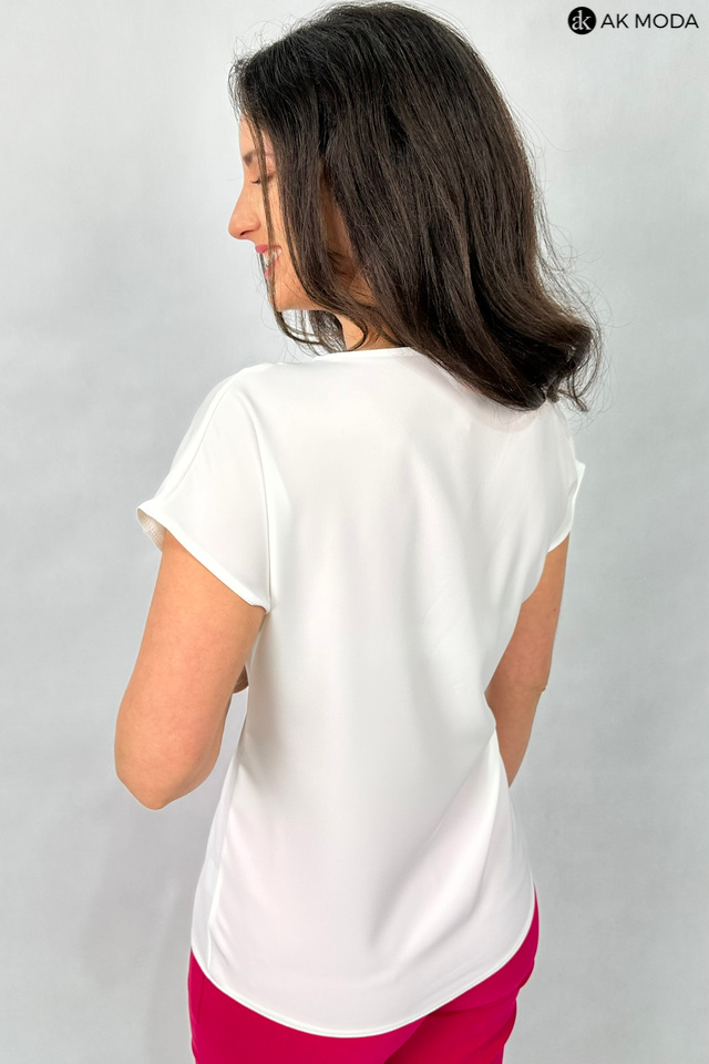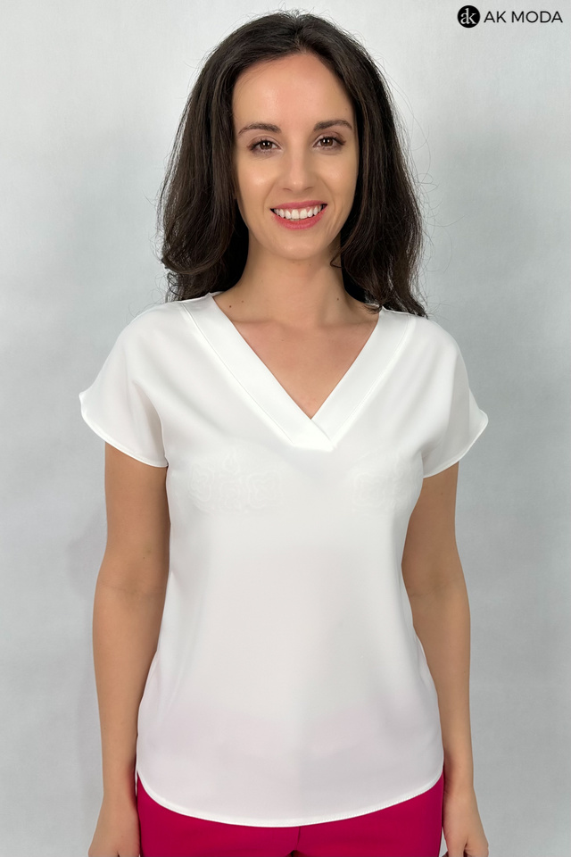 Elegancka bluzka w kolorze ecru z dekoltem w serek i krótkimi, kimonowymi rękawkami.