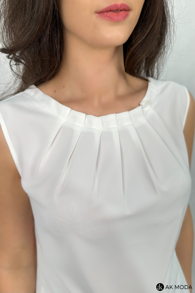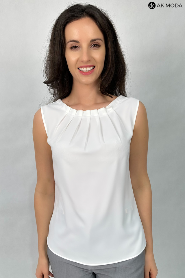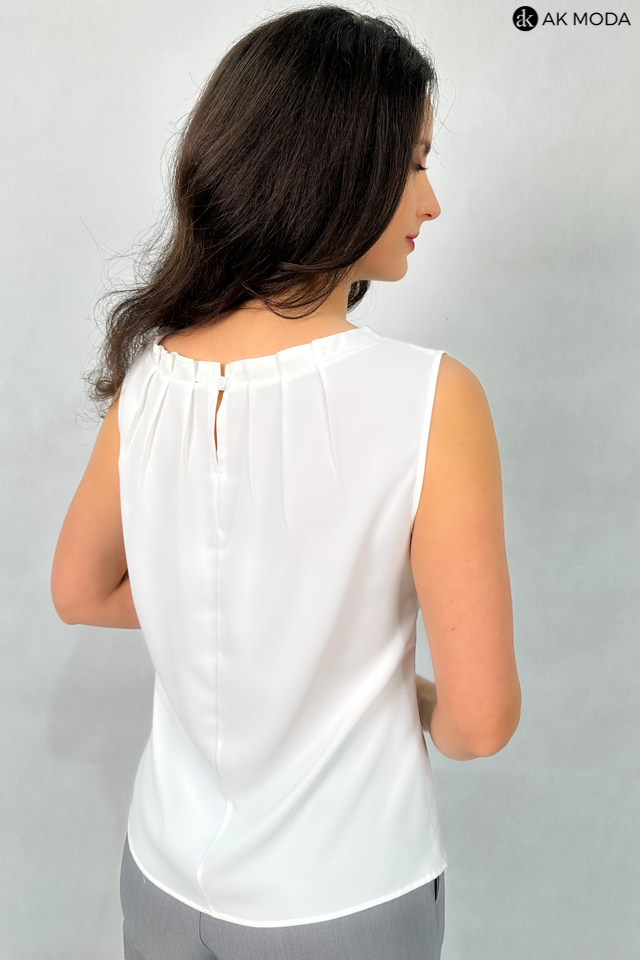 Elegancka, śmietankowa bluzka bez rękawów o prostym kroju, uszyta z lekkiego, delikatnie lejącego materiału. Przy dekolcie ozdobne zakładki.