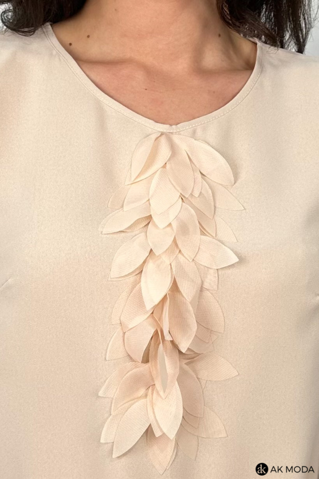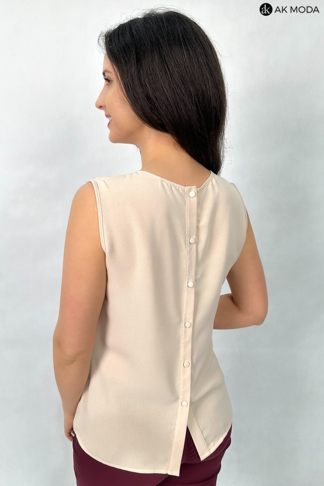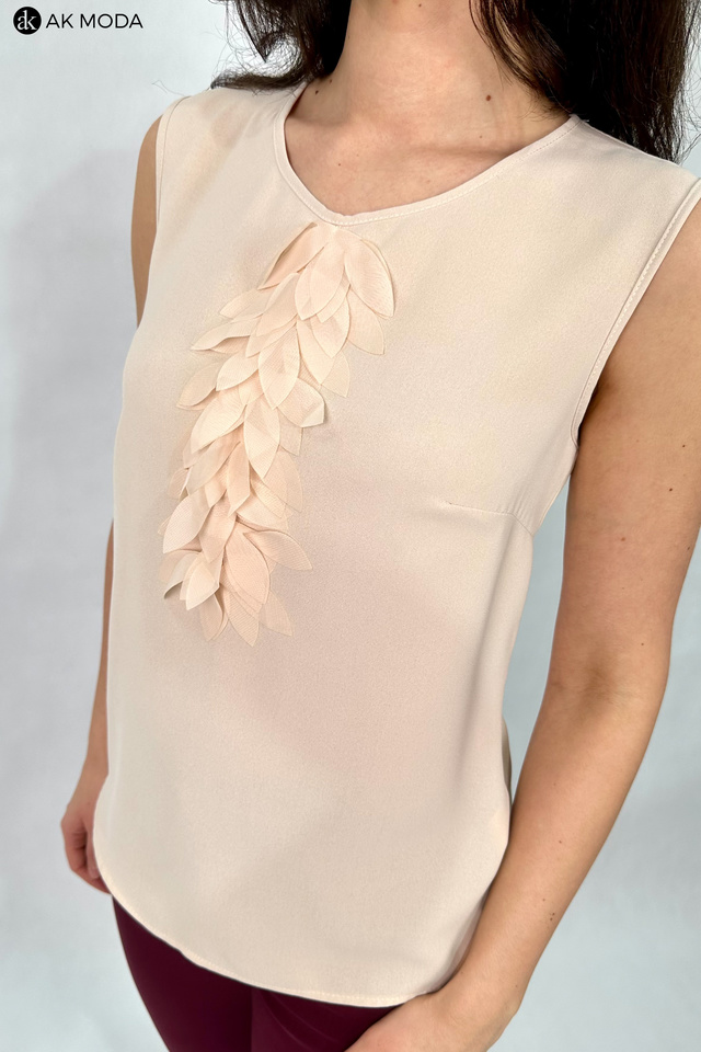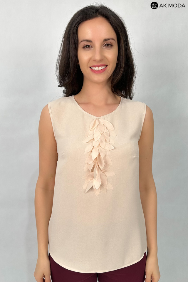 Elegancka, beżowa bluzka bez rękawów o prostym kroju, uszyta z lekkiego, delikatnie lejącego materiału. Przy dekolcie efektowna aplikacja z materiałowych płatków. Z tyłu zapinana na guziki na całej długości.