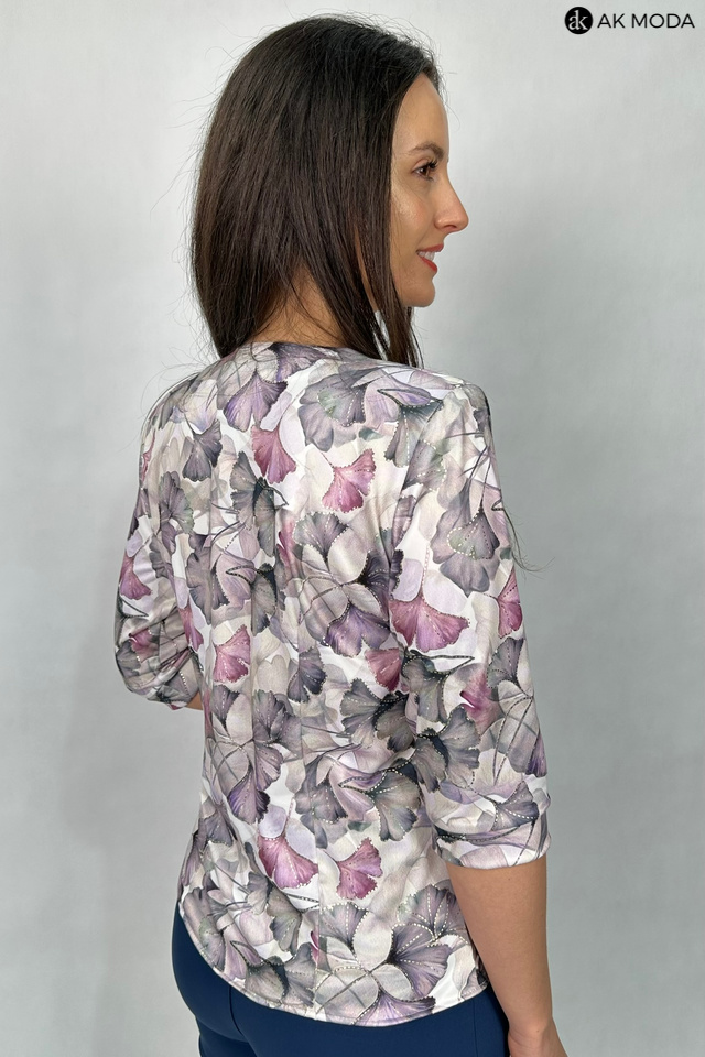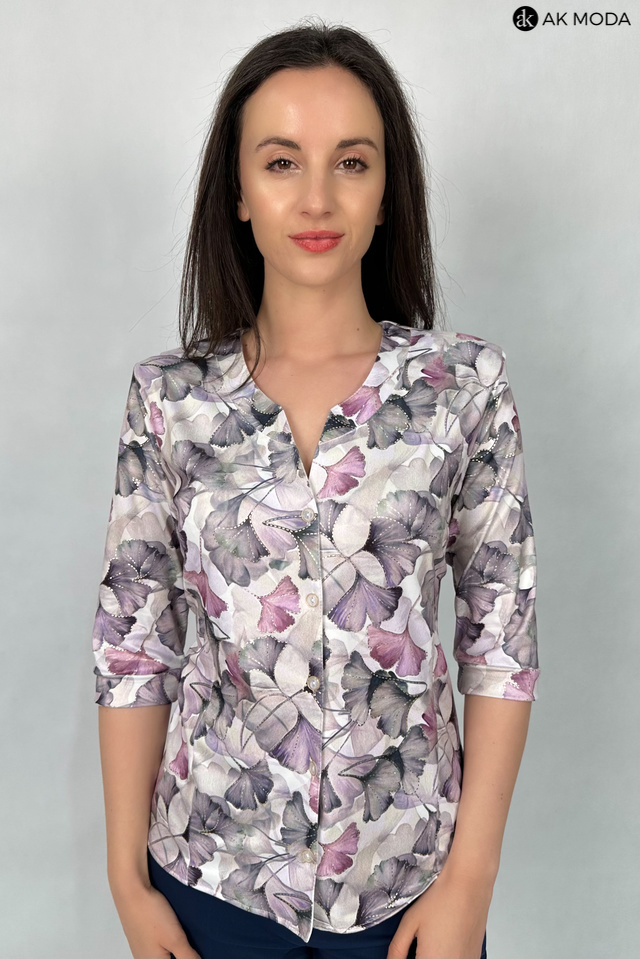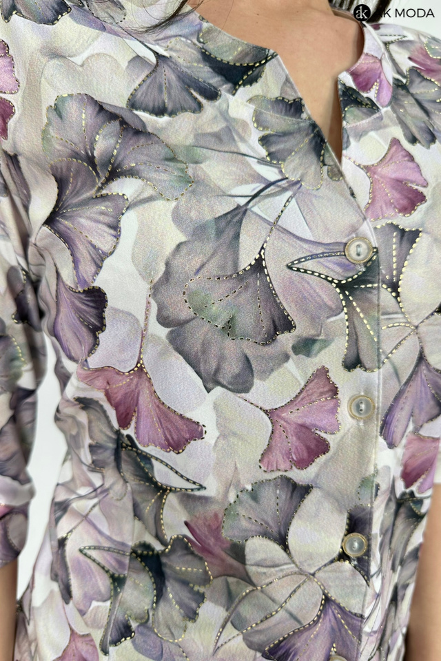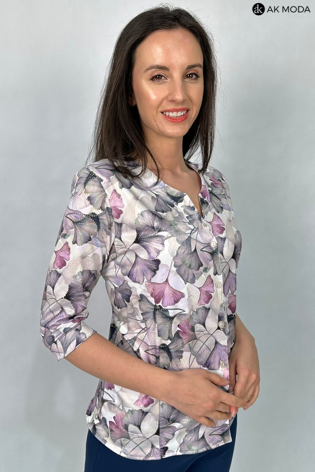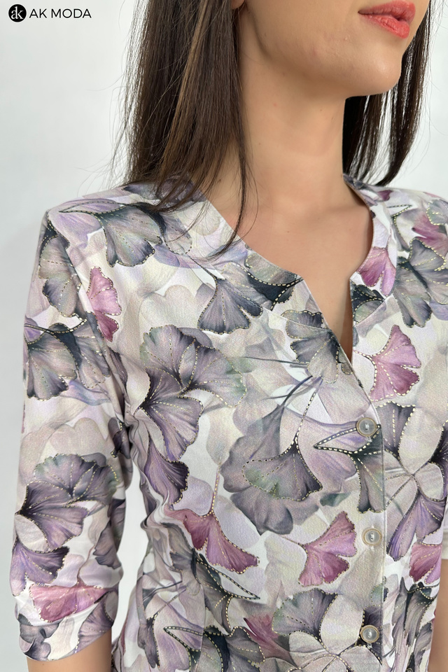 Elegancka bluzka z roślinnym printem i złotymi akcentami, uszyta z elastycznego materiału. Rękawy do łokcia, zapinanana na guziki na całej długości.