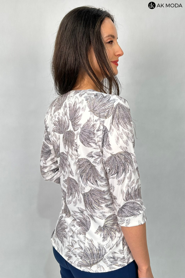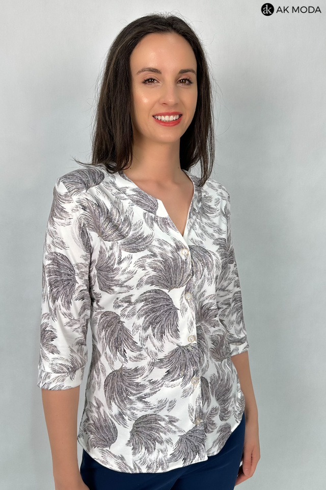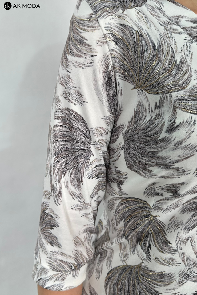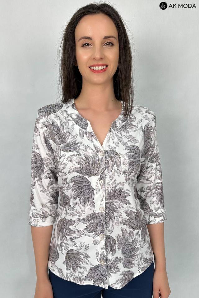 Elegancka bluzka w kolorze śmietankowym, z printem w odcieniach brązu i złotymi akcentami, uszyta z elastycznego materiału. Rękawy do łokcia, zapinanana na guziki na całej długości.
