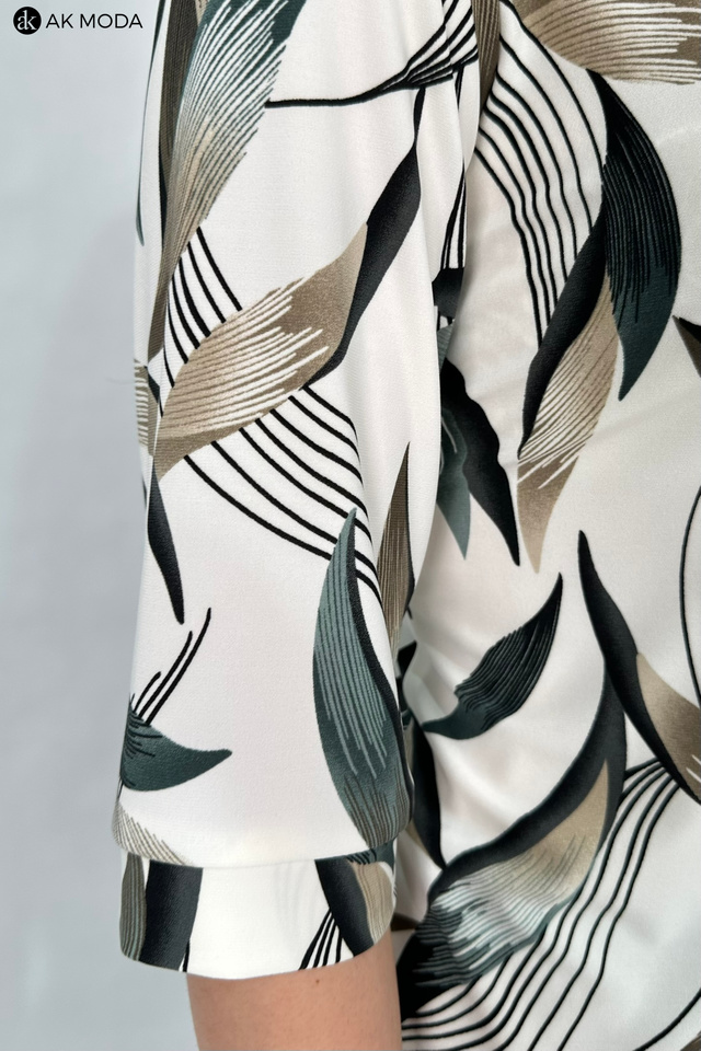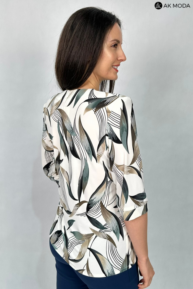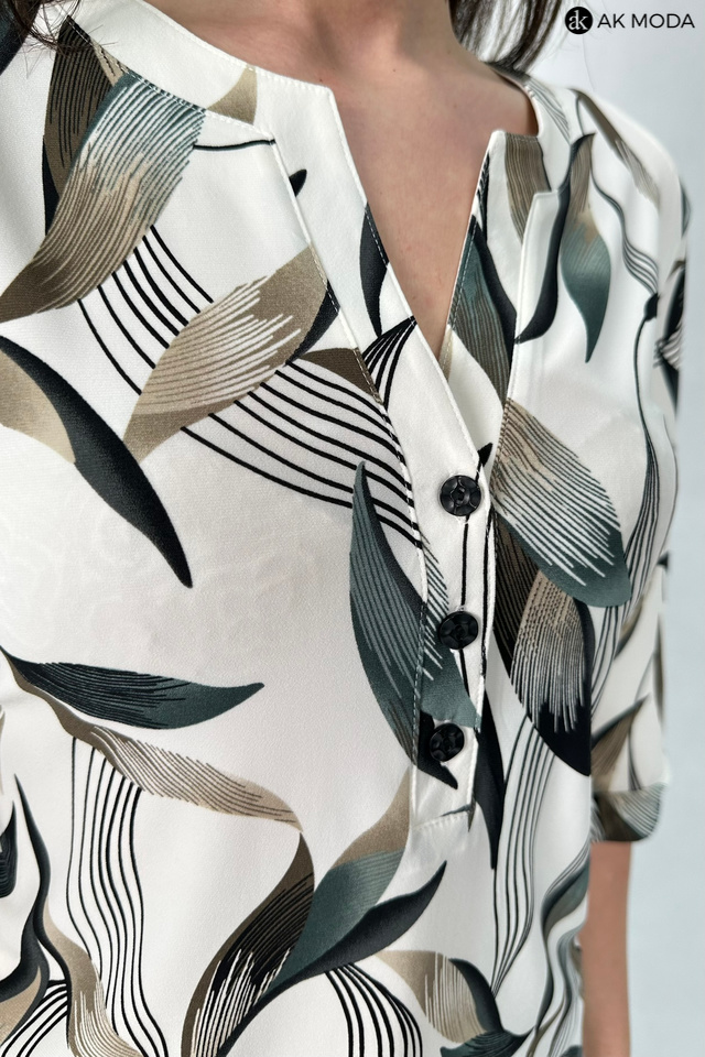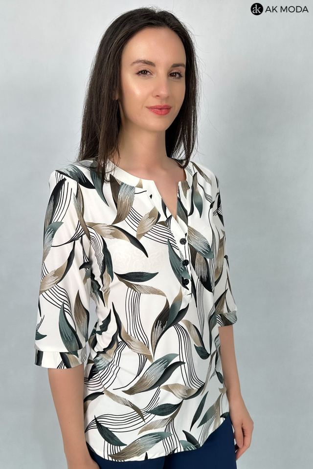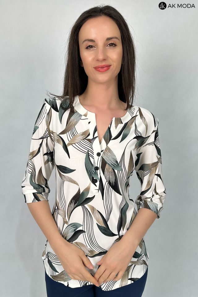 Bluzka w kolorze beżowym z zielono-brązowym wzorem, uszyta z elastycznego materiału. Dekolt ozdobiony guziczkami, rękawy do łokcia.