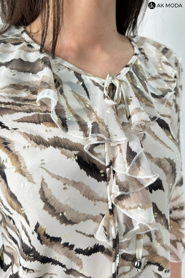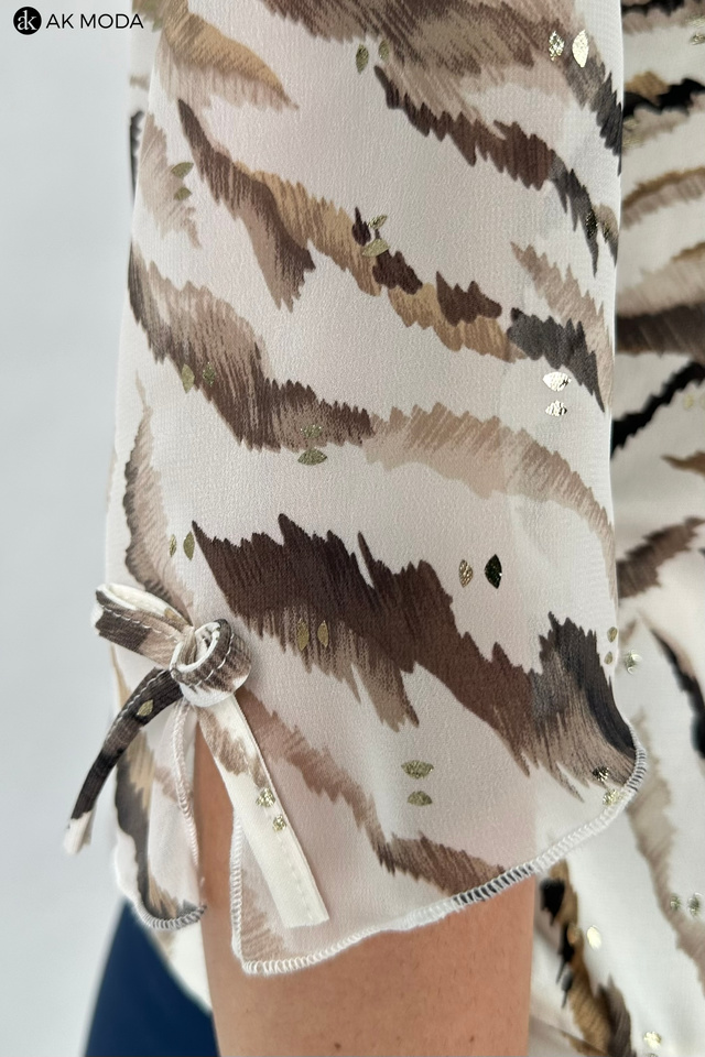 Elegancka bluzka utrzymana w beżowo-brązowej kolorystyce. Dekolt w szpic z wiązaniem i falbanką, transparentne rękawy do łokcia. Bluzka uszyta z elastycznego materiału.