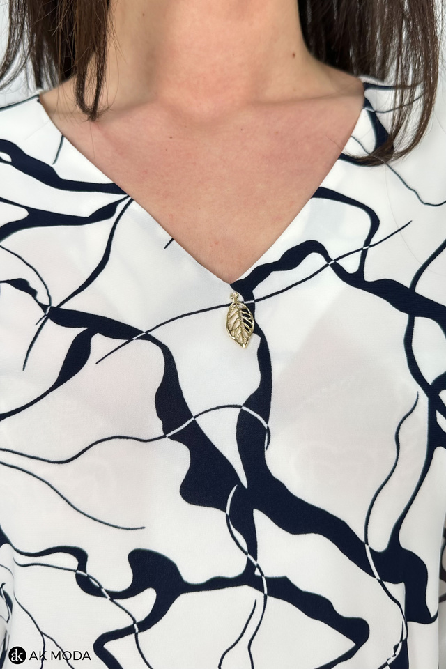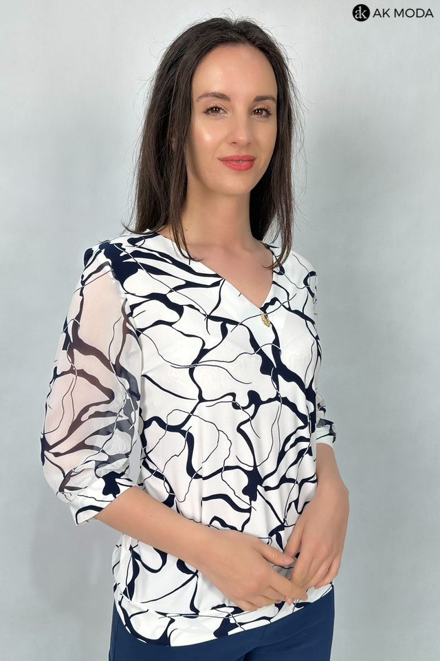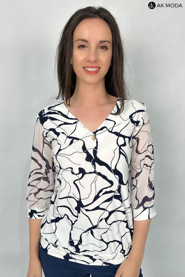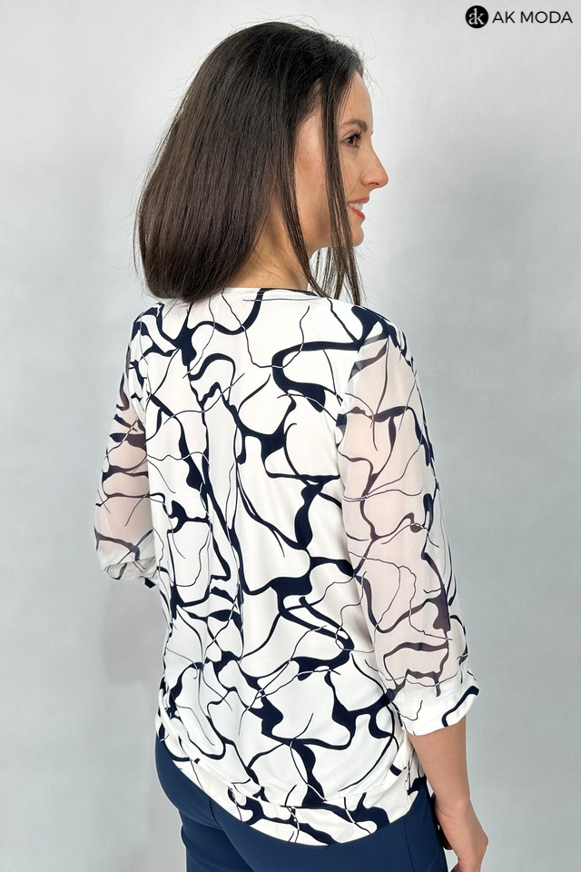 Elegancka bluzka w kolorze śmietankowym z granatowym wzorem. Dekolt w szpic, transparentne rękawy do łokcia. Bluzka uszyta z elastycznego materiału.