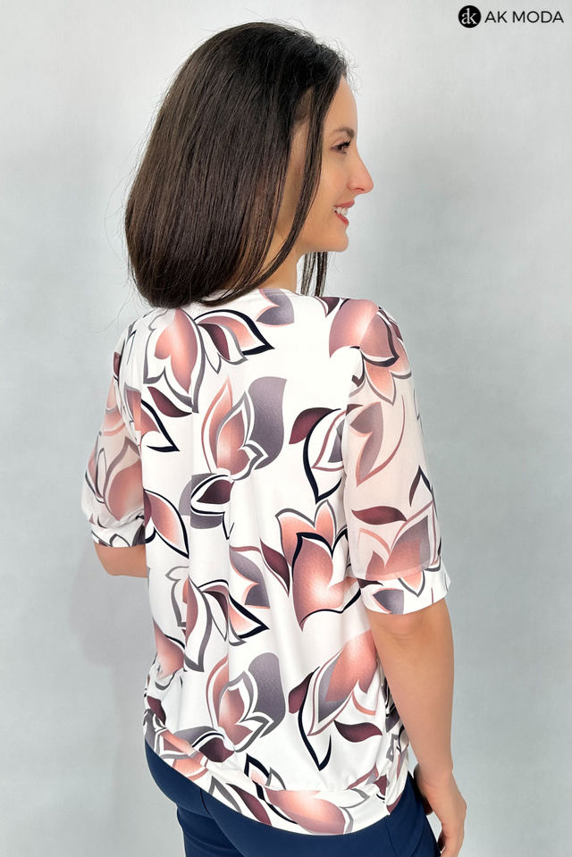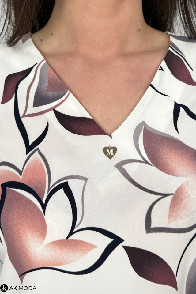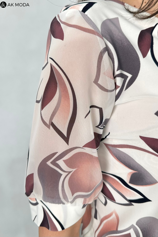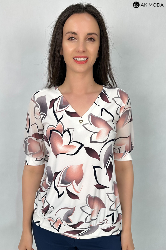 Elegancka bluzka w kolorze ecru z printem w odcieniach borda. Dekolt w szpic, krótkie, transparentne rękawy. Bluzka uszyta z elastycznego materiału.