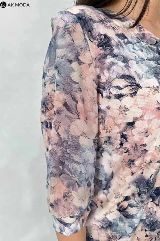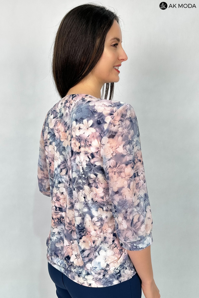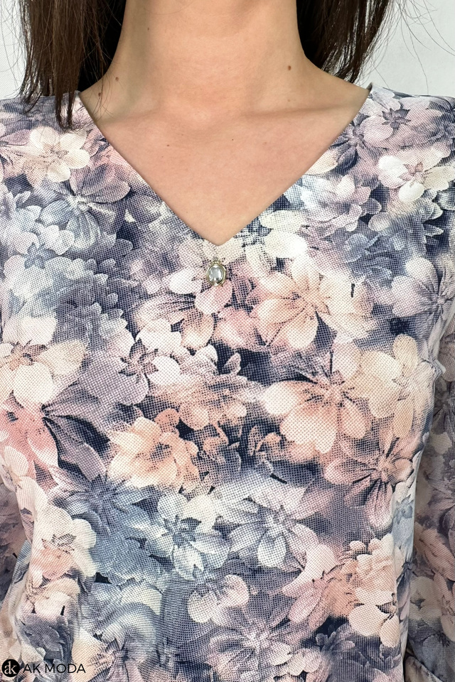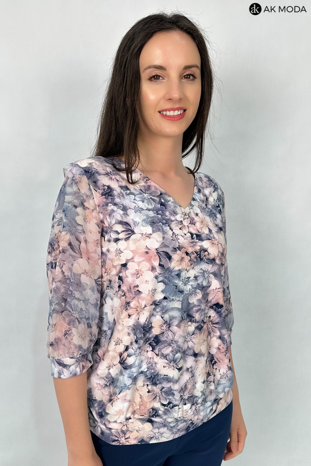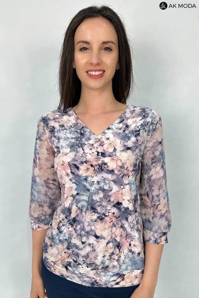 Elegancka bluzka z wielobarwnym kwiatowym wzorem. Dekolt w szpic, transparentne rękawy do łokcia. Bluzka uszyta z elastycznego materiału.