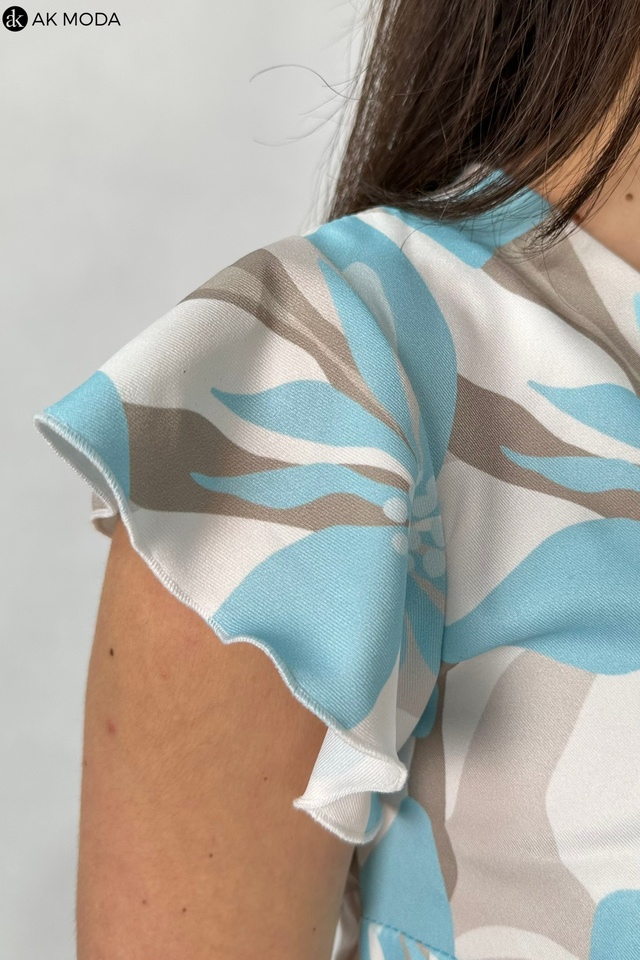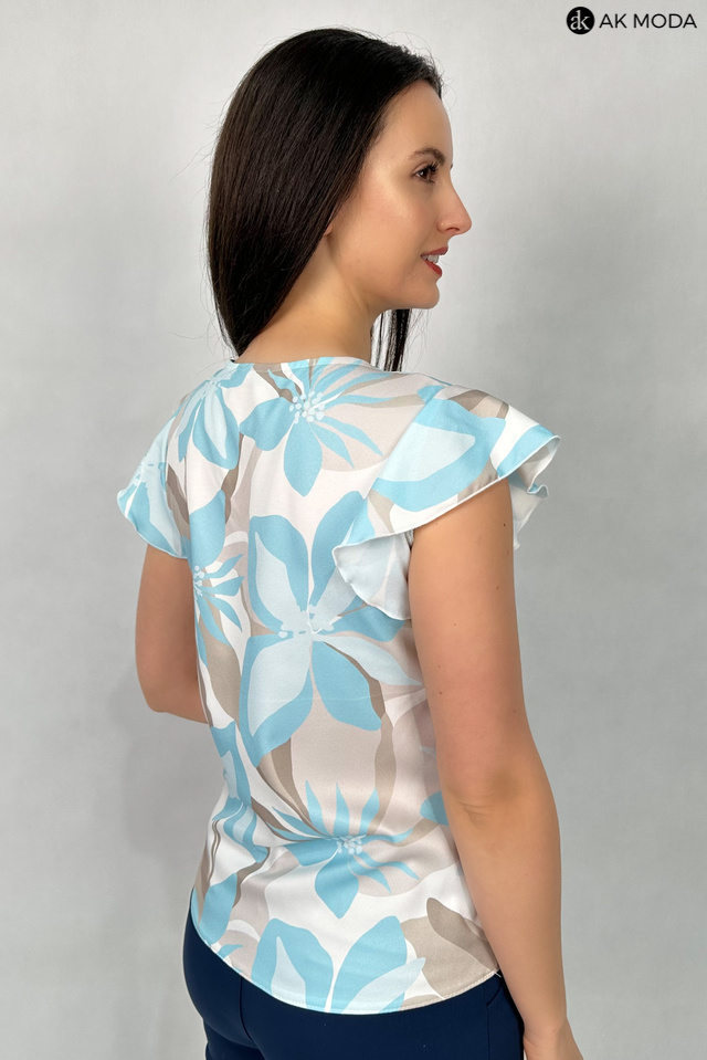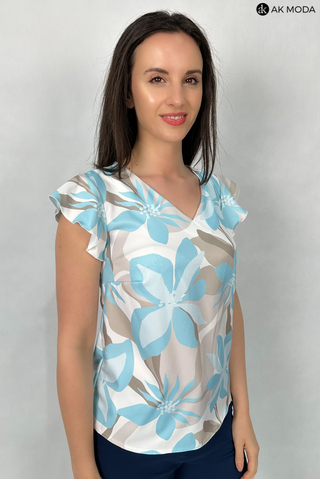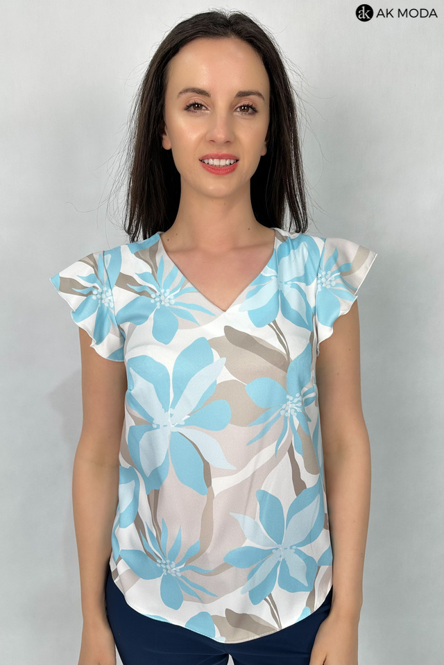 Elegancka bluzka w kolorze śmietankowym z kwiatowym printem w odcieniach brązu i błękitu . Dekolt w szpc, krótkie rękawy w formie falbanki.