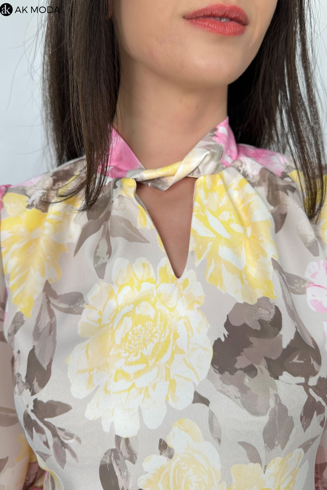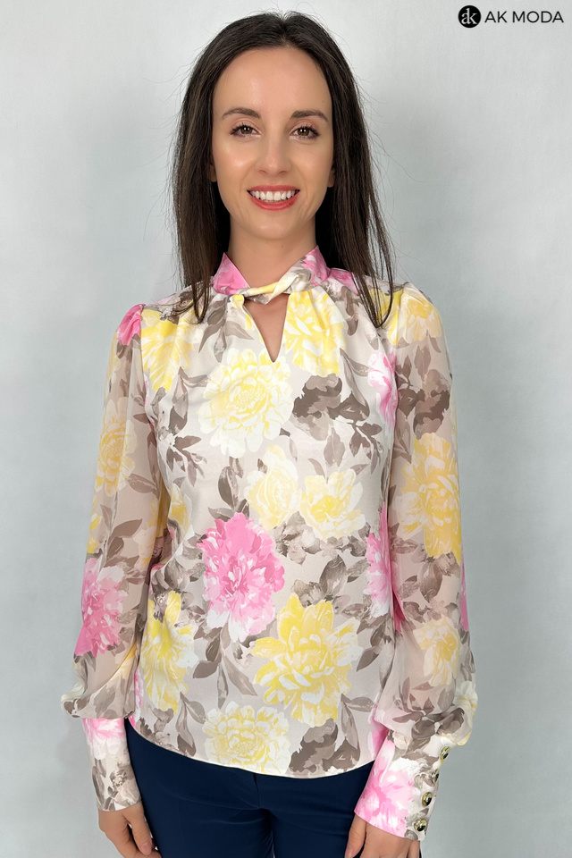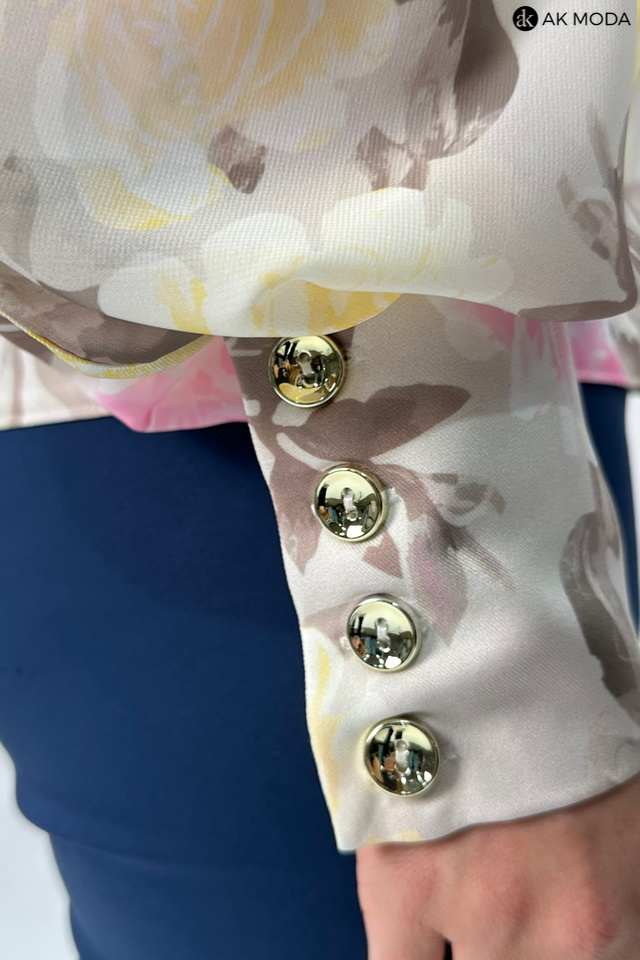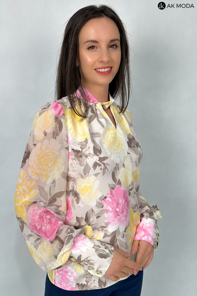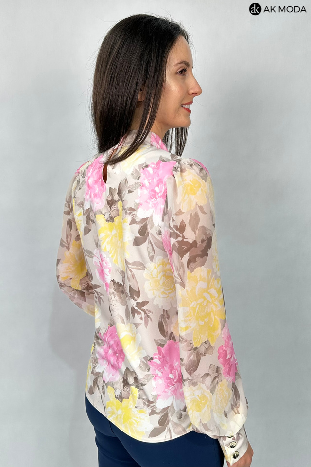Elegancka bluzka w kolorze beżowym z kwiatowym wzorem w odcieniach różu i żółci. Dekolt ze stójką i pęknięciem, długie, transparentne rękawy zakończone mankietami z guzikami.
