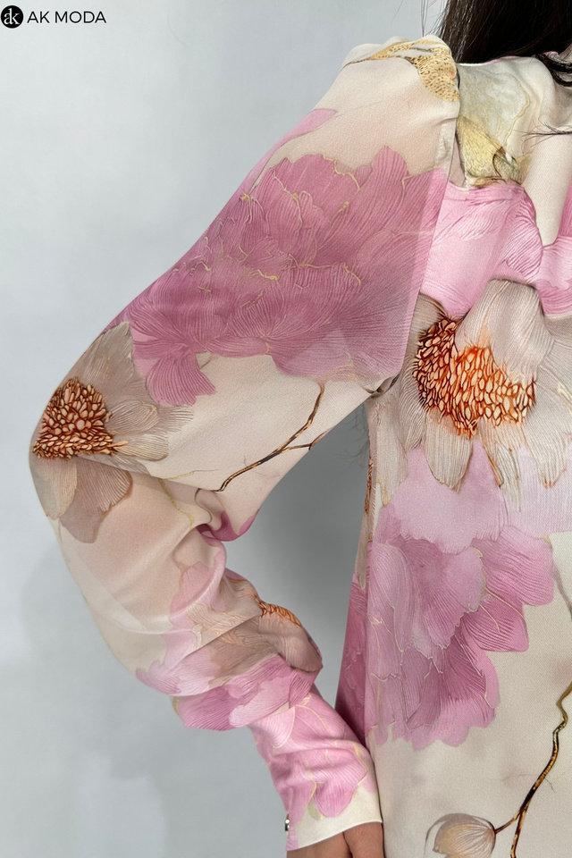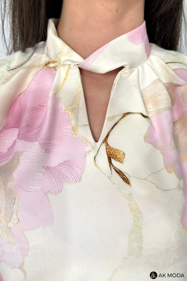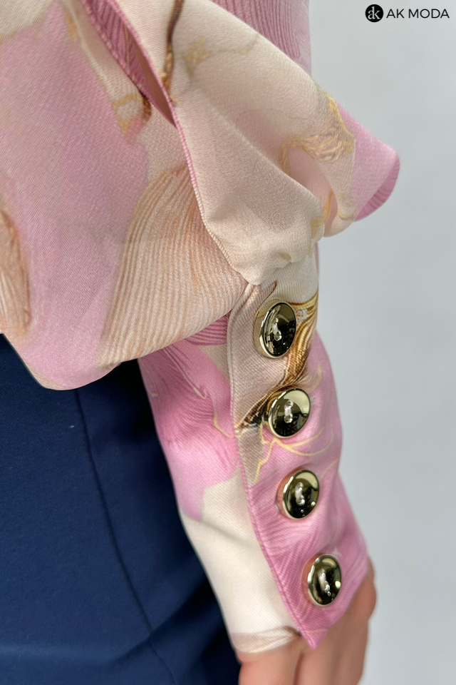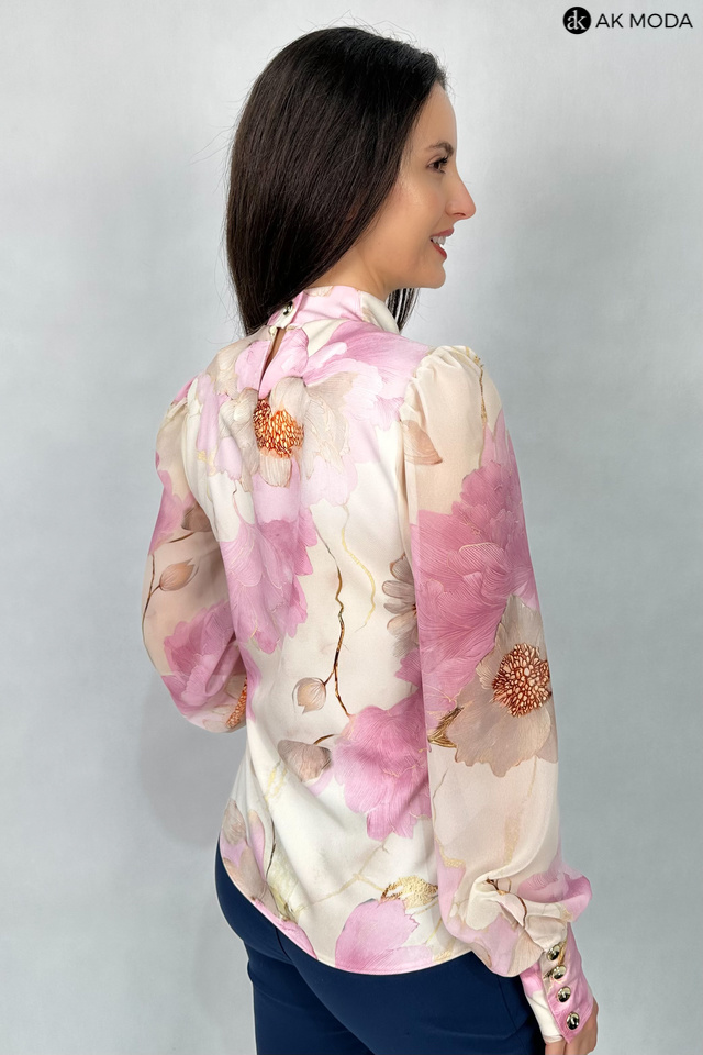 Elegancka bluzka z kwiatowym wzorem, utrzymana w w kolorystyce beżowo-różowej. Dekolt ze stójką i pęknięciem, długie, transparentne rękawy zakończone mankietami z guzikami.