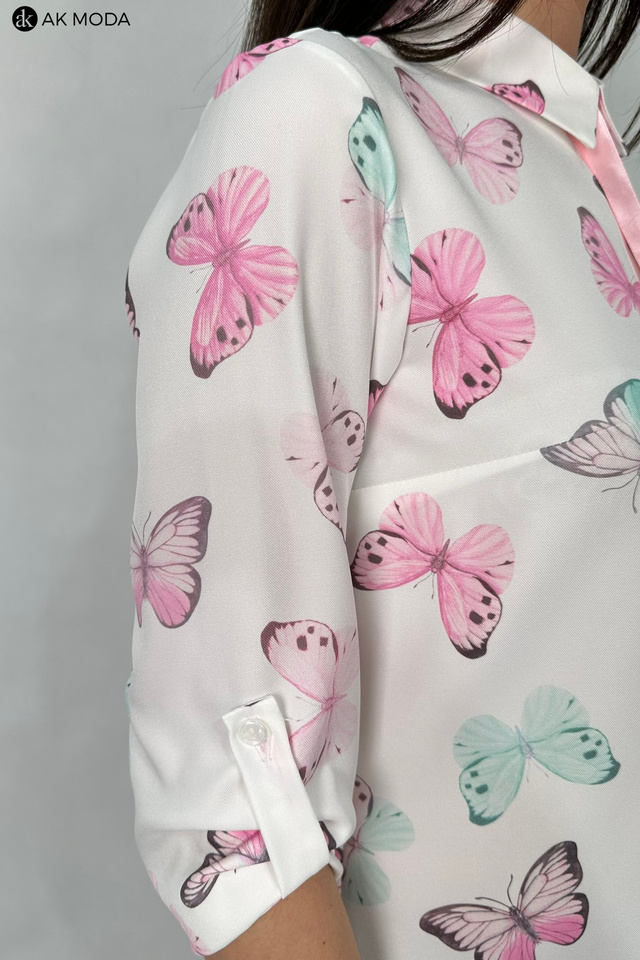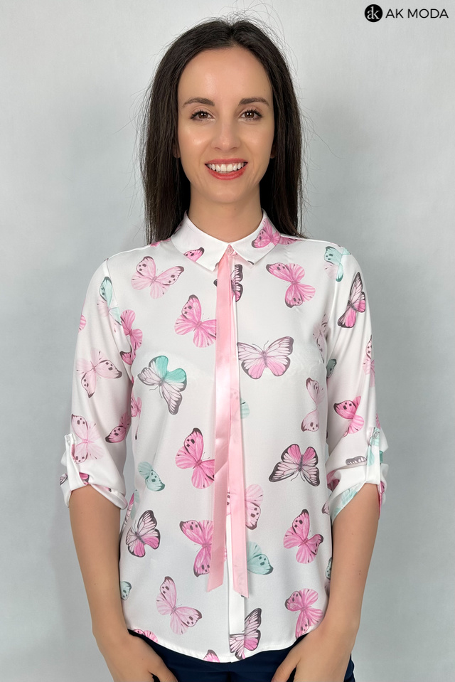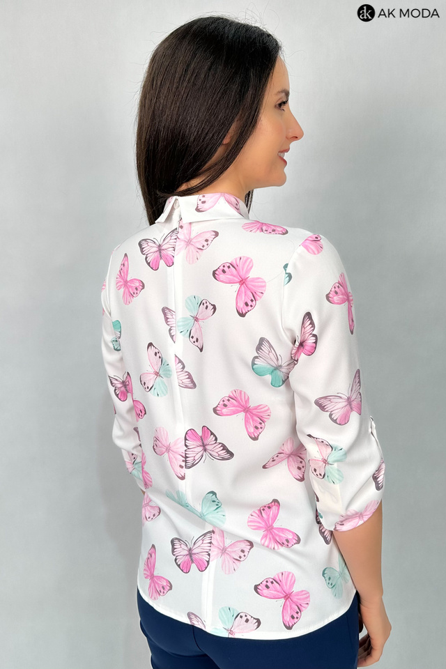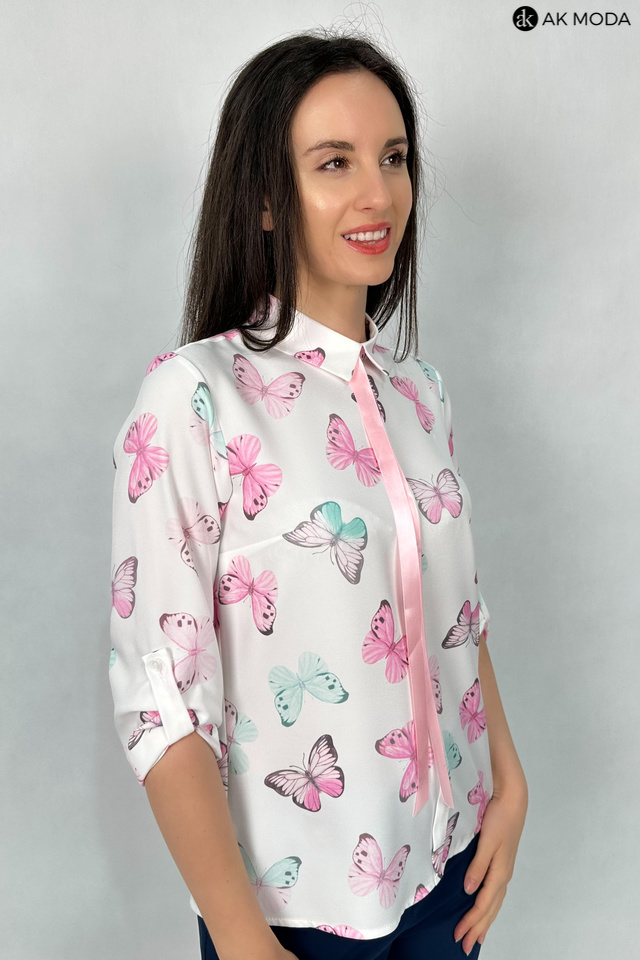 Elegancka bluzkaw kolorze śmietankowym w różowo-miętowe motylki, z kołnierzykiem i plisą na przodzie. Rkawy 3/4 z możliwością podpięcia, pod szyją odpinana wstążka.