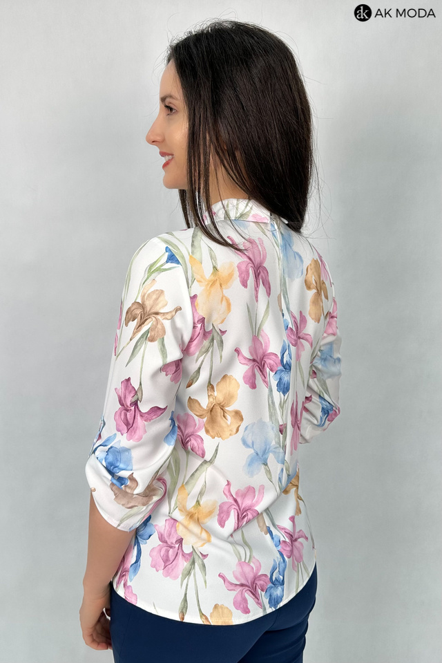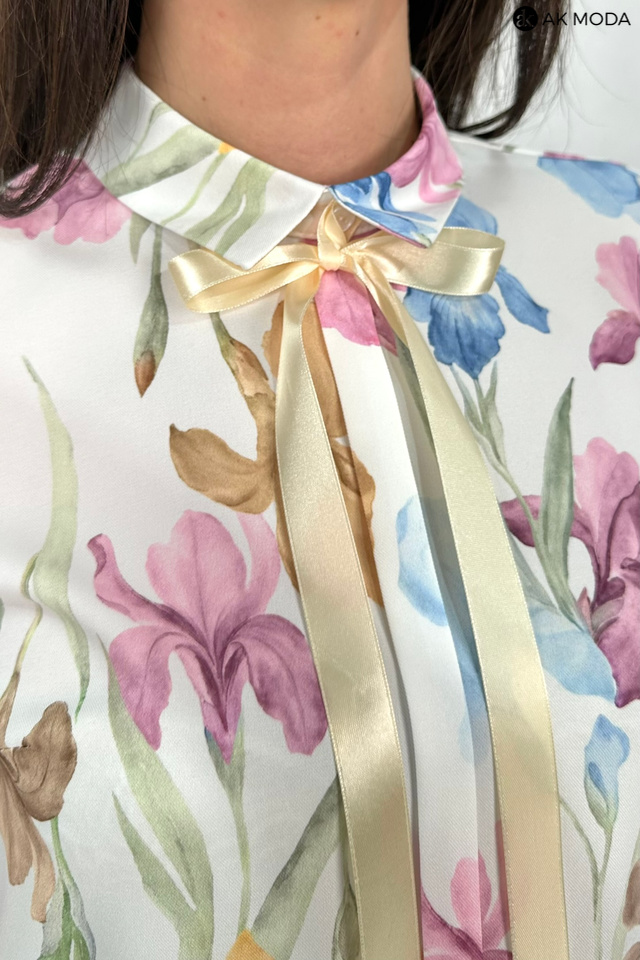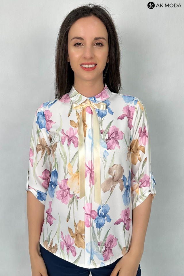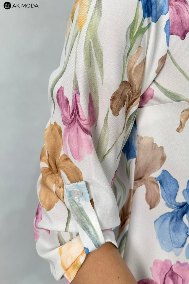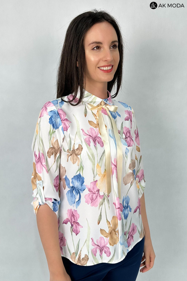 Elegancka bluzkaw kolorze ecru z kwiatowym printem, z kołnierzykiem i plisą na przodzie. Rkawy 3/4 z możliwością podpięcia, pod szyją odpinana wstążka.