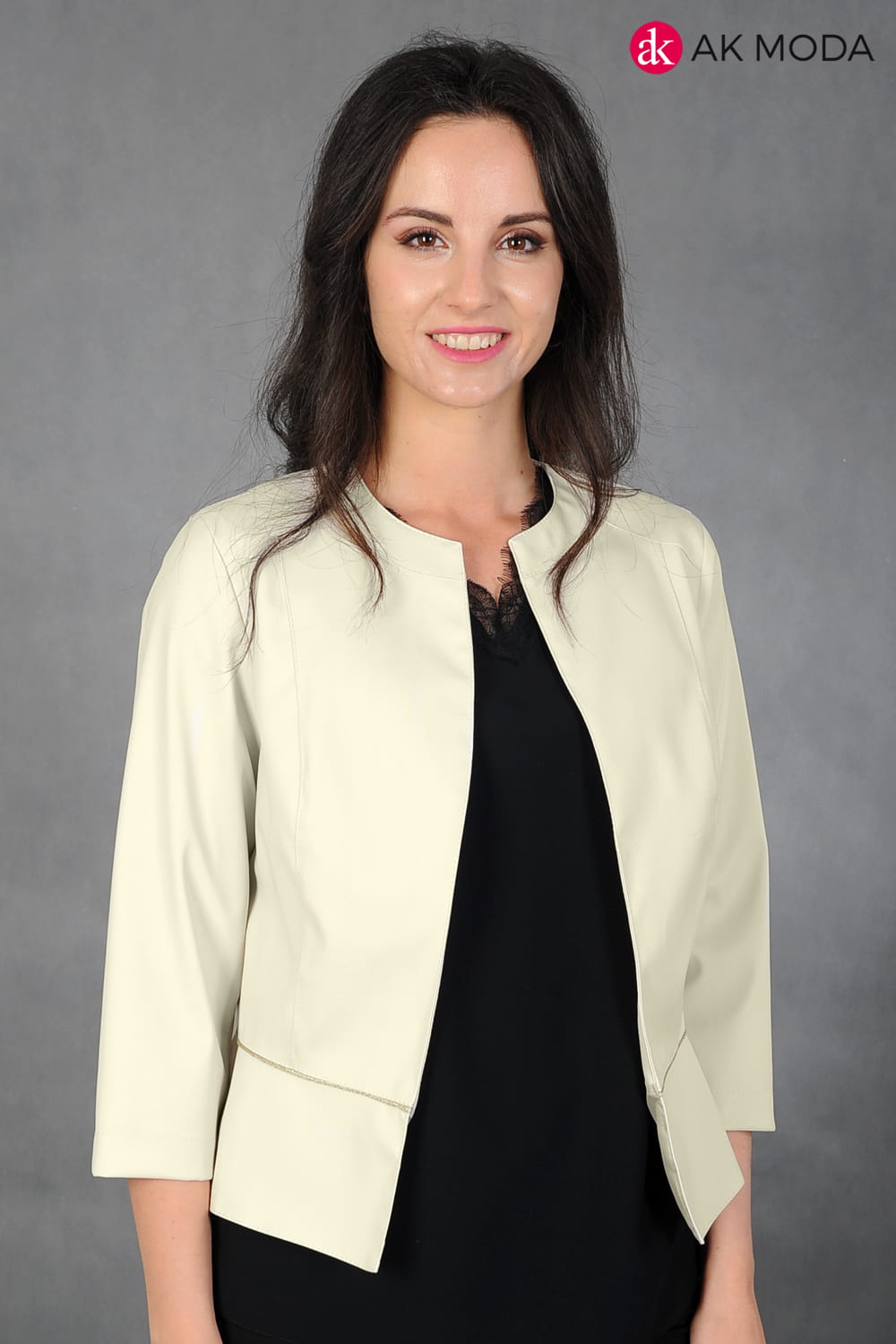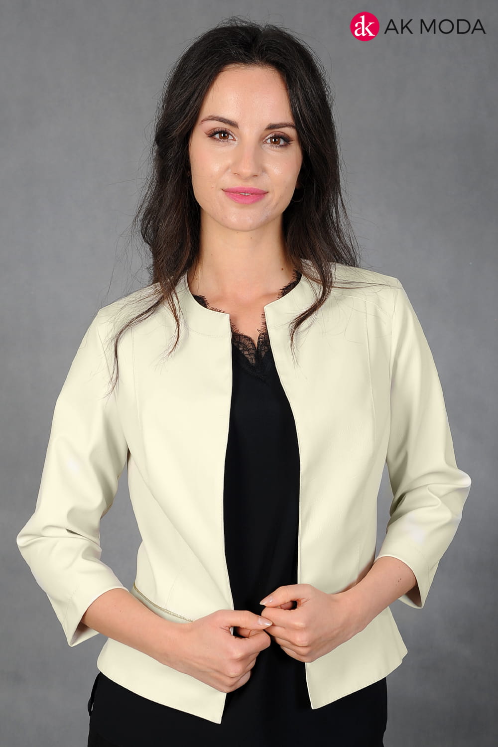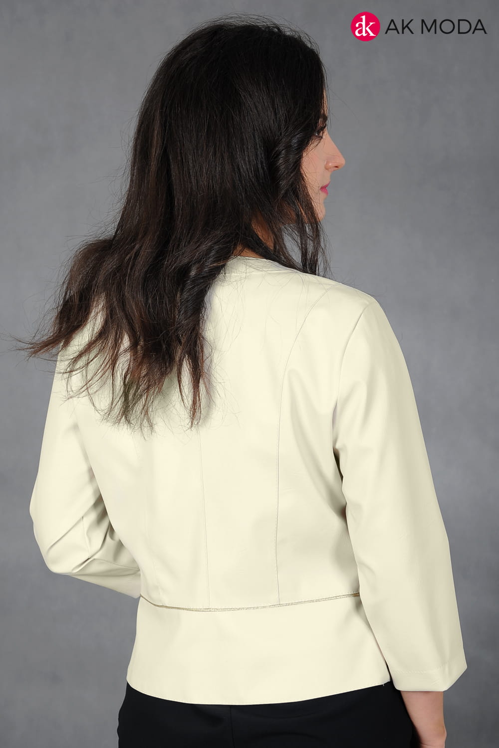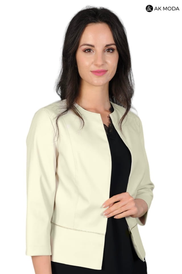 Beżowe bolerko z baskinką i rękawem 3/4, skóra ekologiczna.