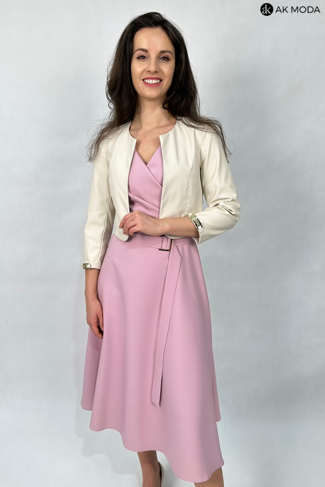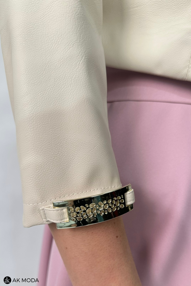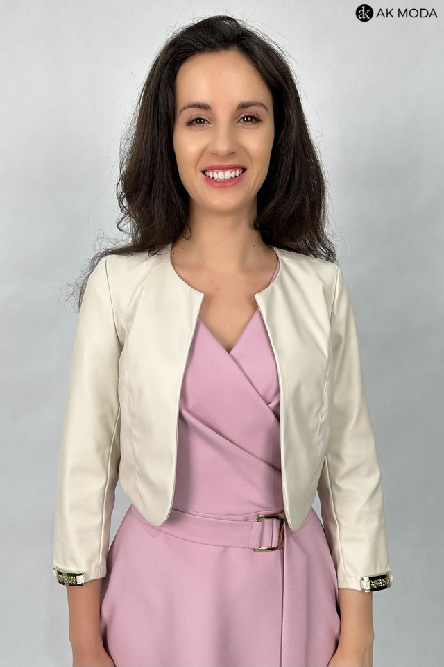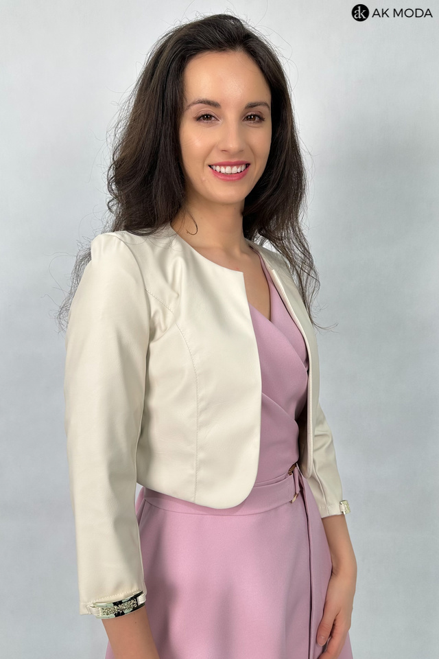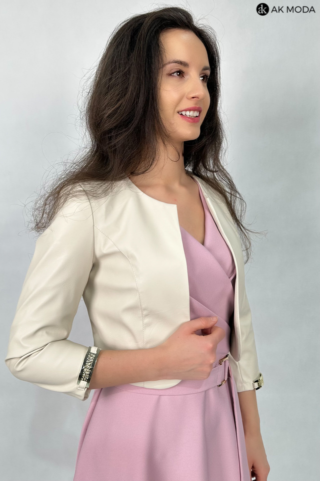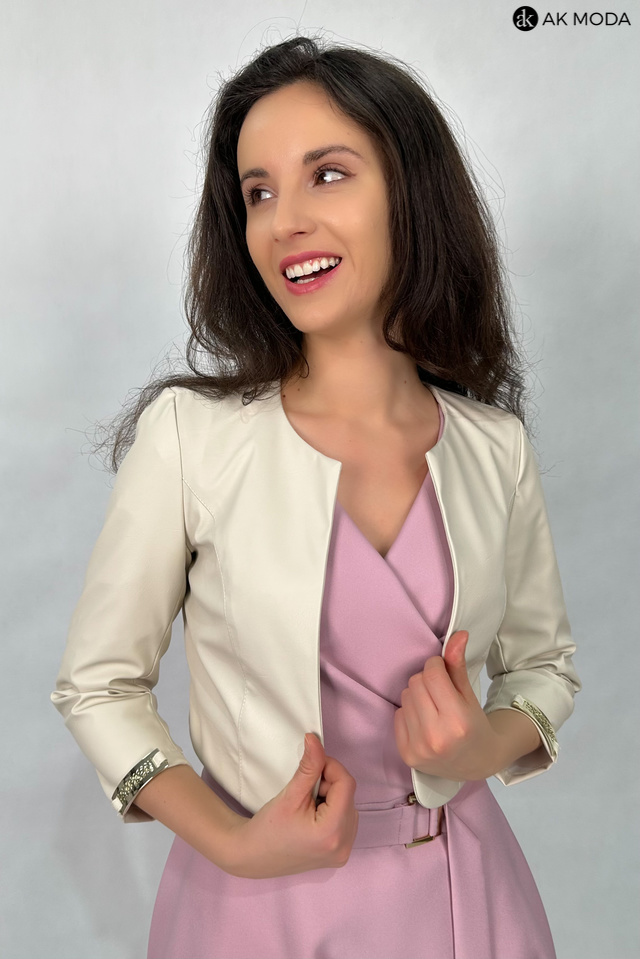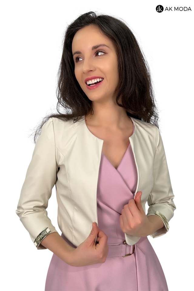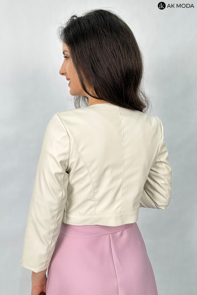 Krótkie bolerko w kolorze jasnego beżu z rękawami 3/4, skóra ekologiczna.