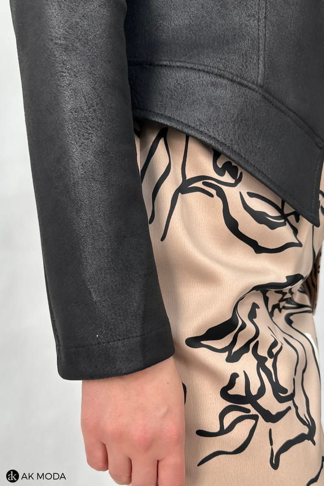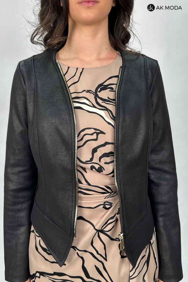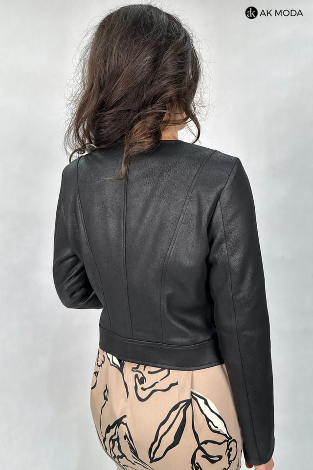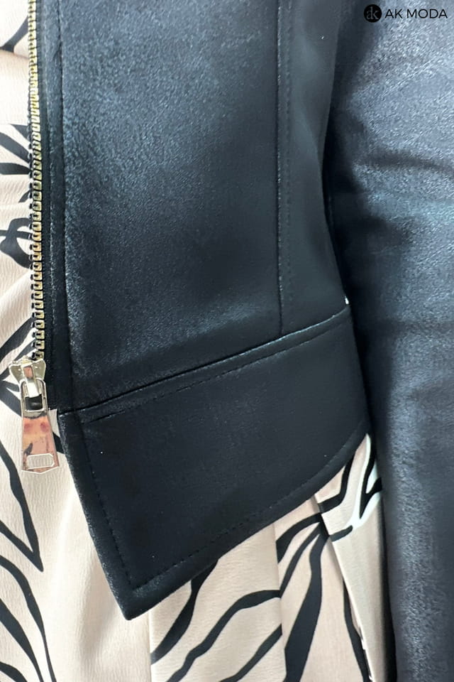Czarny żakiet zapinany na zamek, z długimi rękawami i asymetrycznym dołem. Skóra ekologiczna.