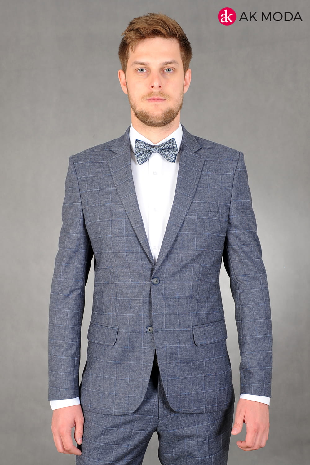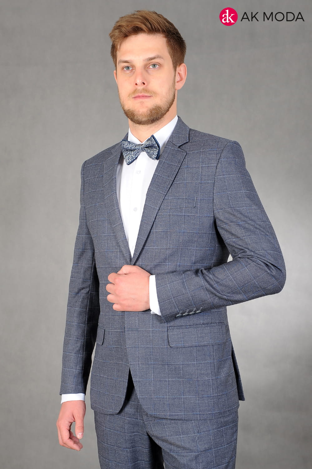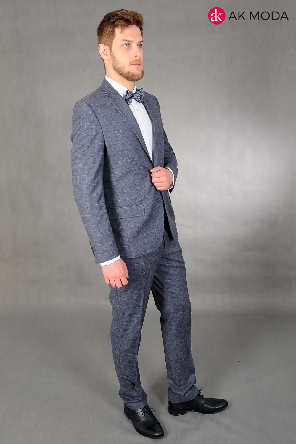 Szary garnitur męski w kratkę. Marynarka jednorzędowa, z tyłu dwa rozcięcia. Nogawki w spodniach zwężane.