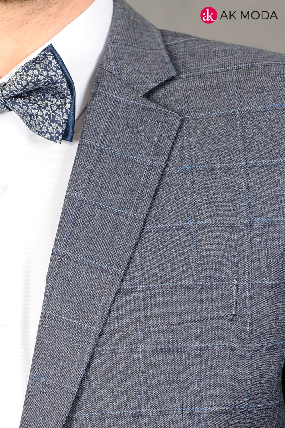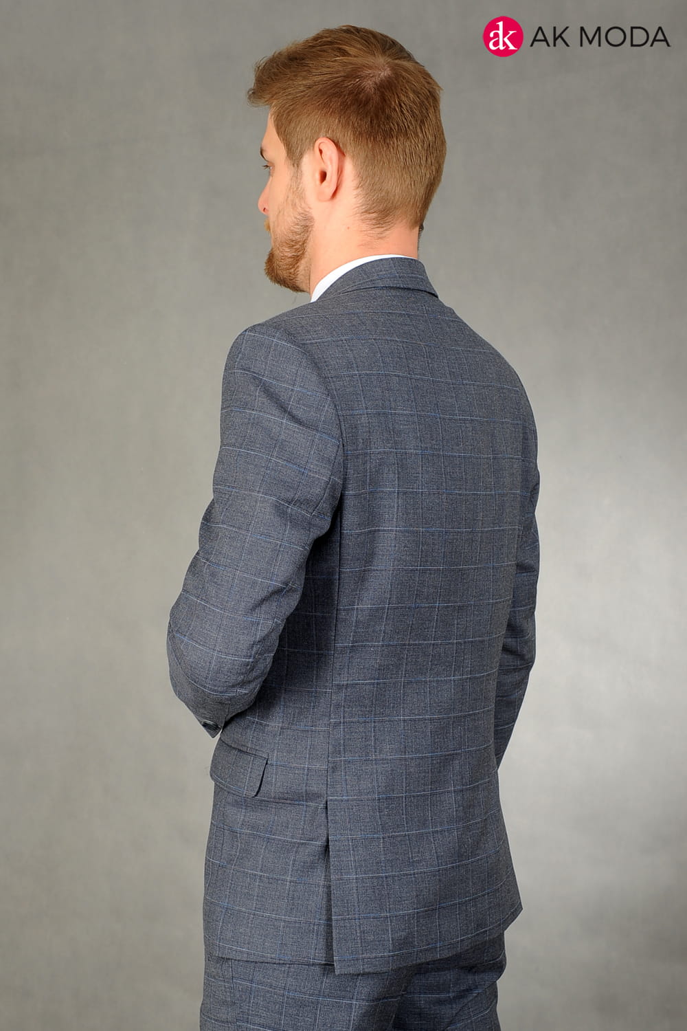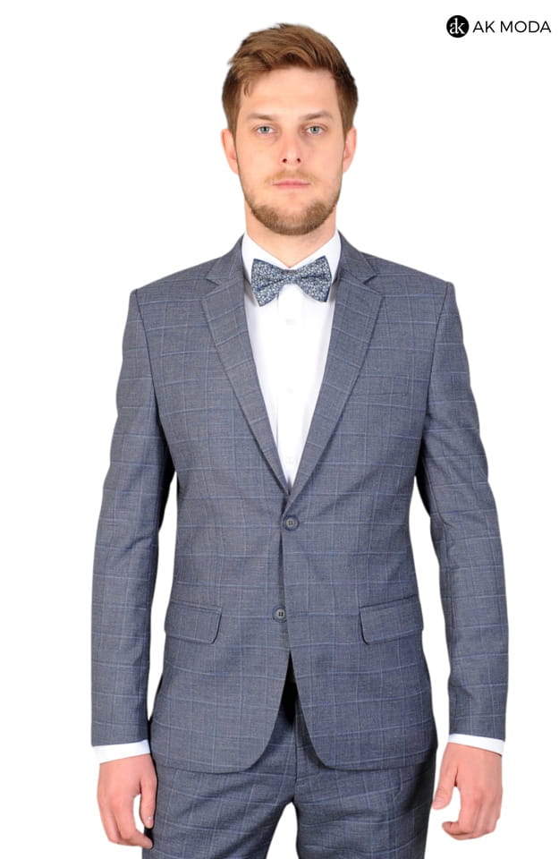 Szary garnitur męski w kratkę. Marynarka jednorzędowa, z tyłu dwa rozcięcia. Nogawki w spodniach zwężane.