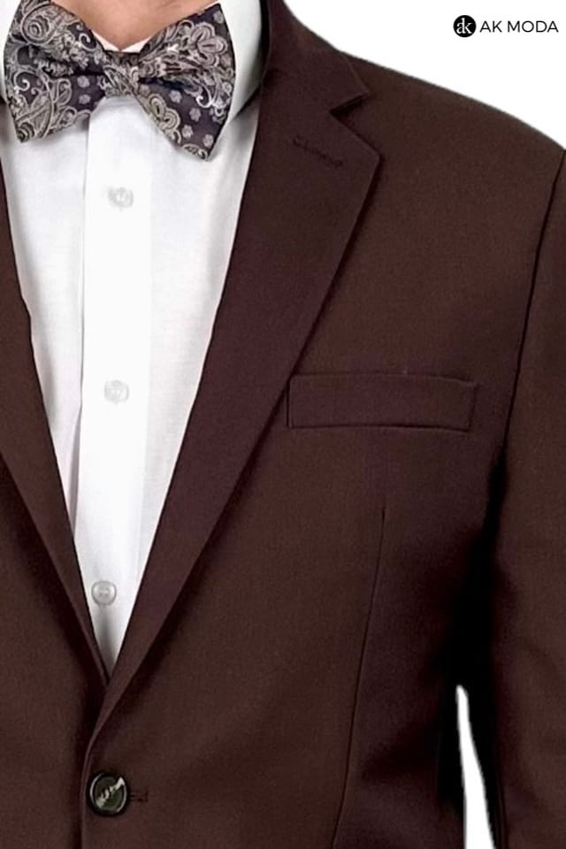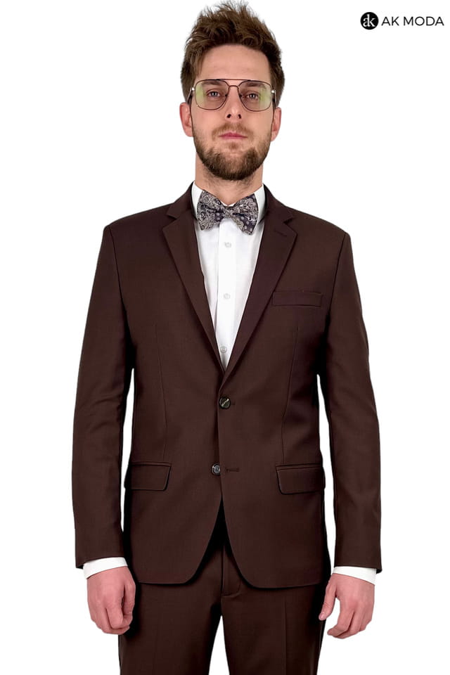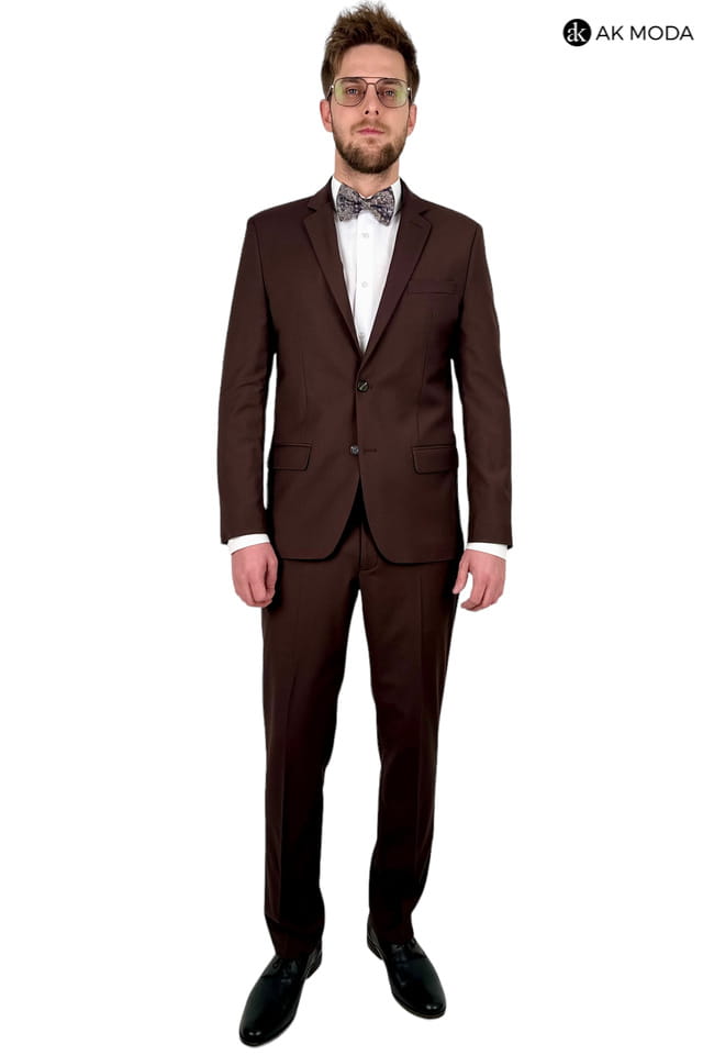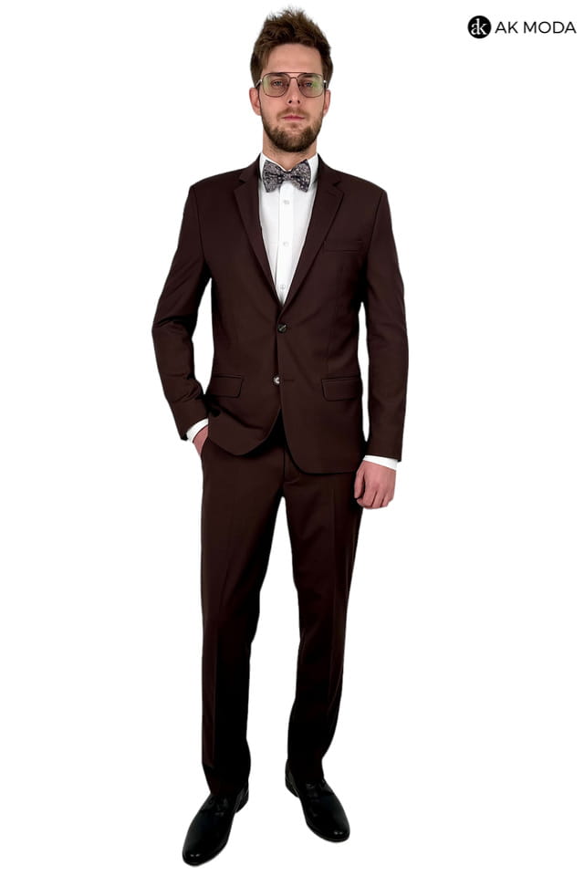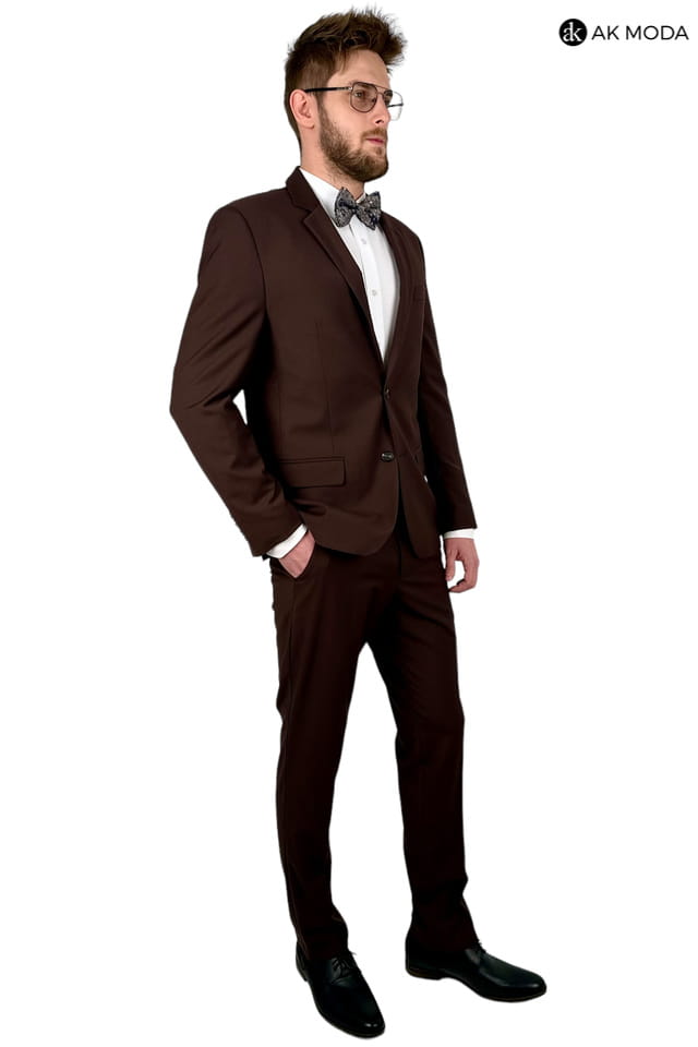 Garnitur męski brązowy. Marynarka jednorzędowa, z tyłu dwa rozcięcia. Nogawki w spodniach zwężane.