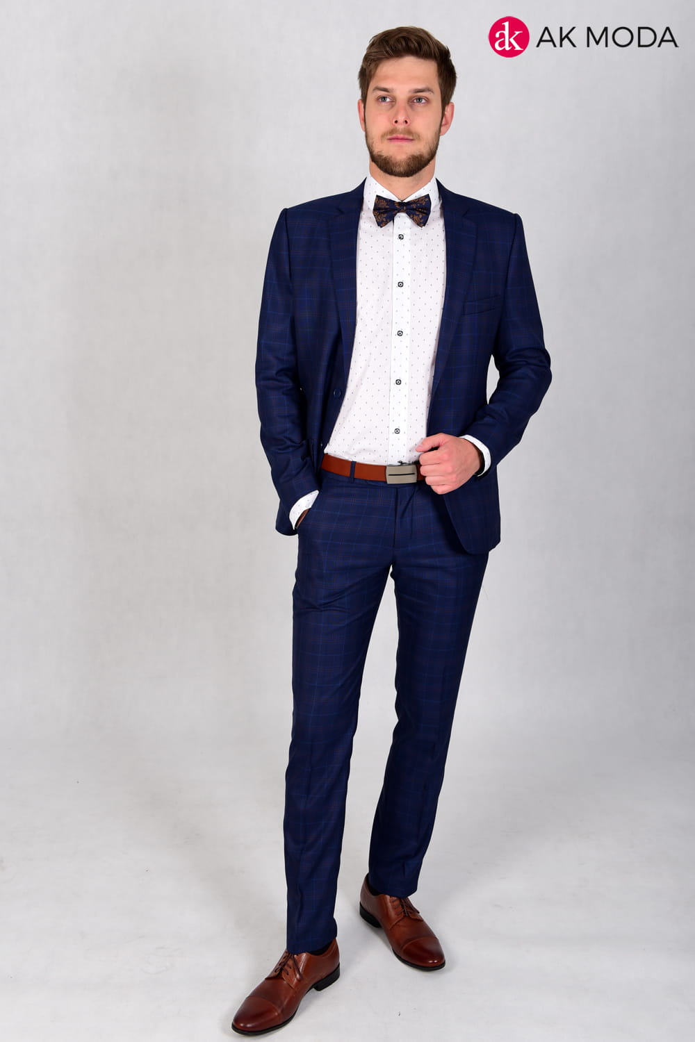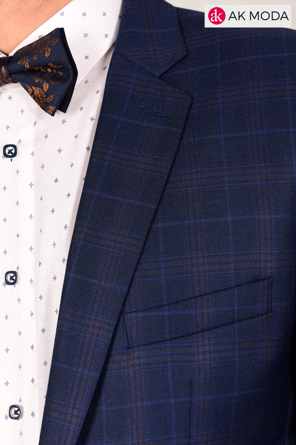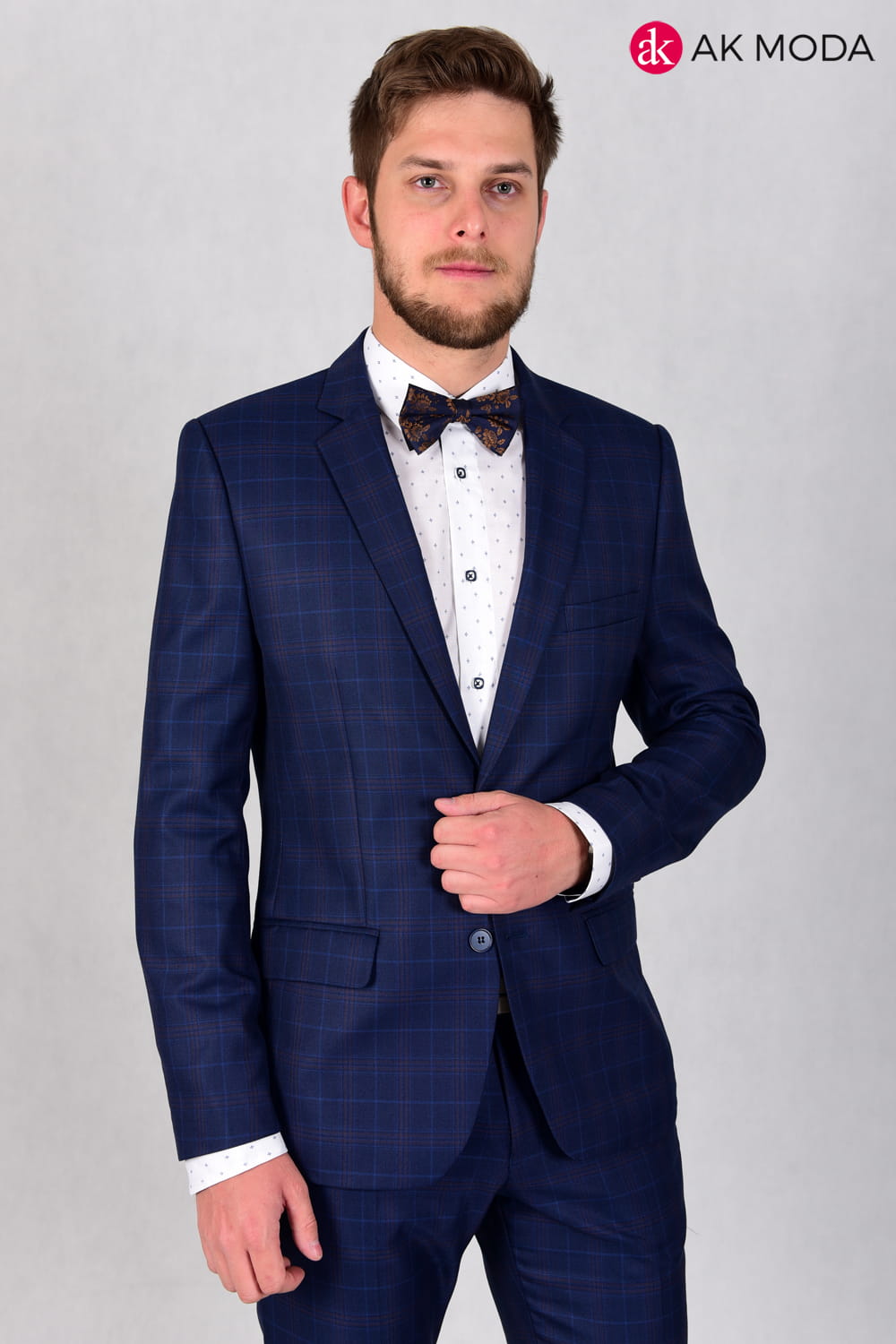 Garnitur męski granatowy w brązową kratkę. Marynarka jednorzędowa, z tyłu dwa rozcięcia. Nogawki w spodniach zwężane.