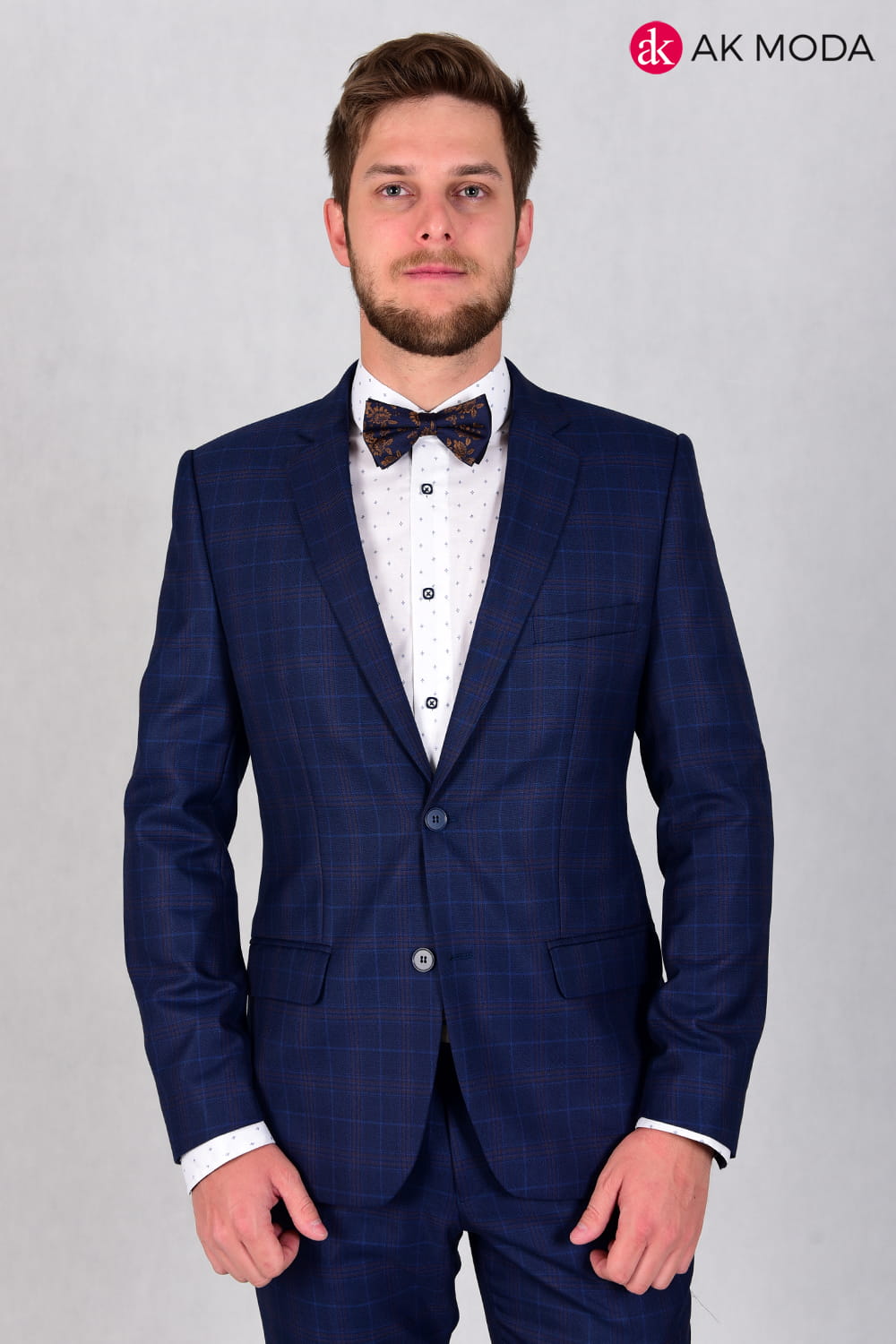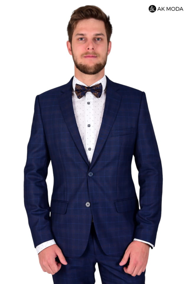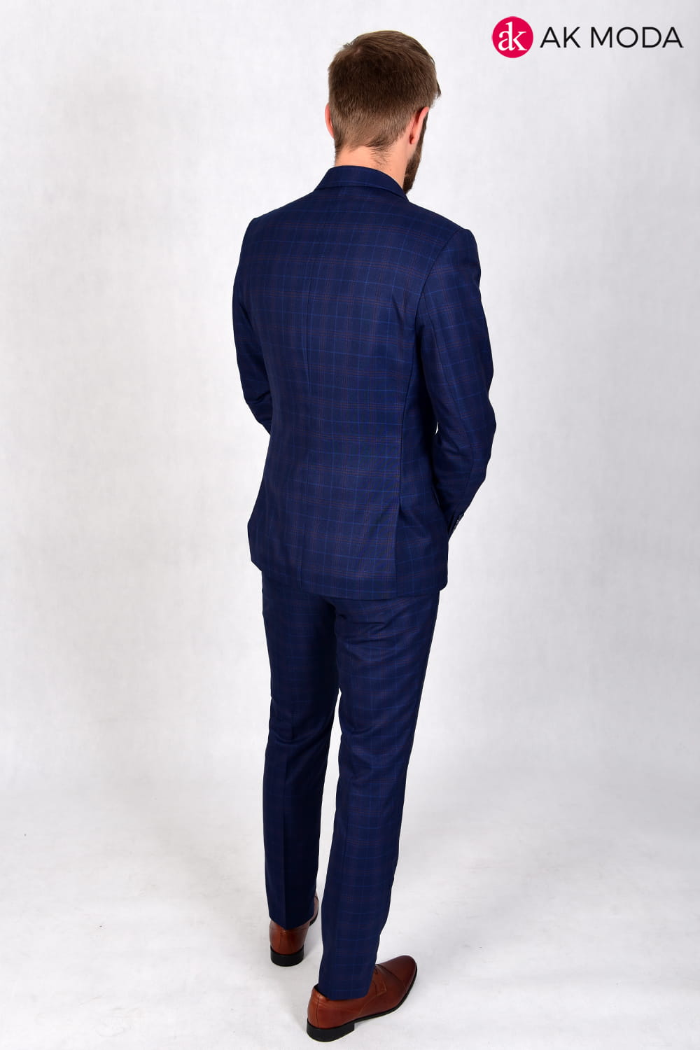 Garnitur męski granatowy w brązową kratkę. Marynarka jednorzędowa, z tyłu dwa rozcięcia. Nogawki w spodniach zwężane.