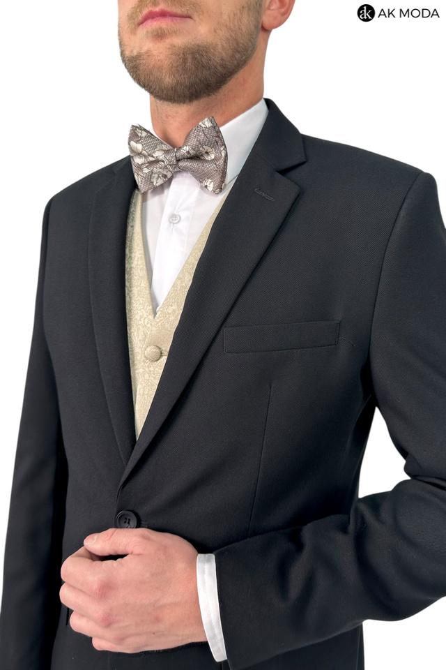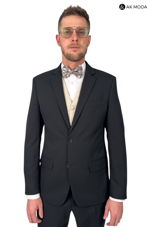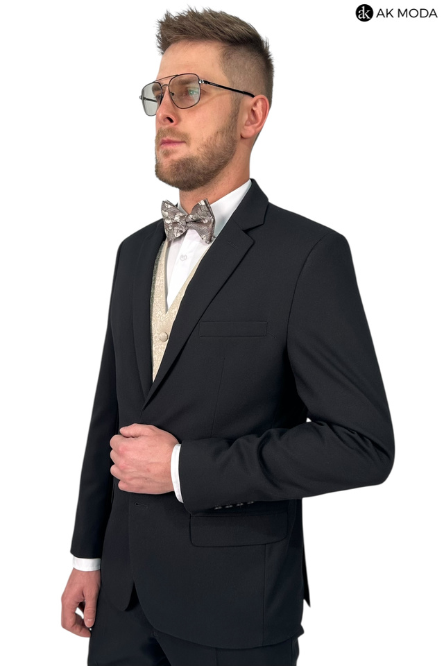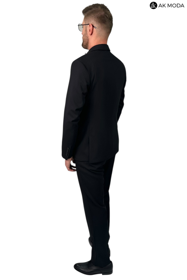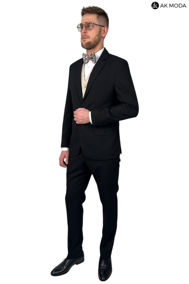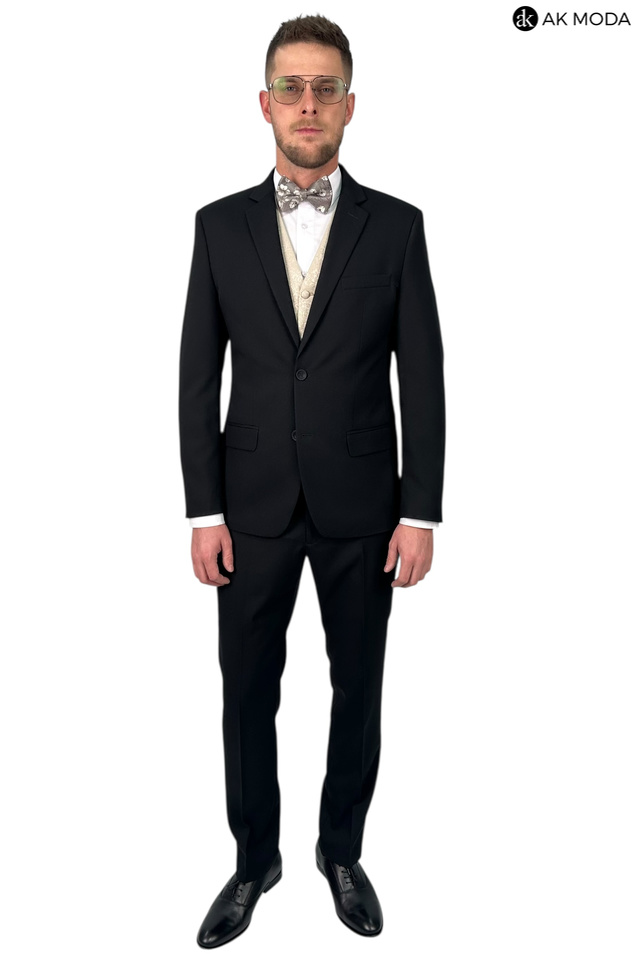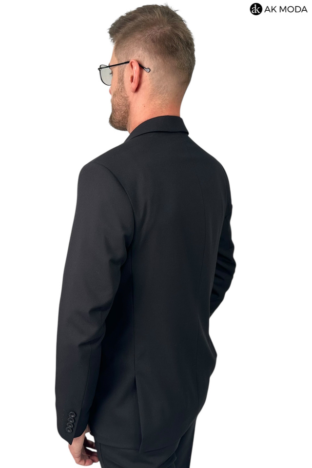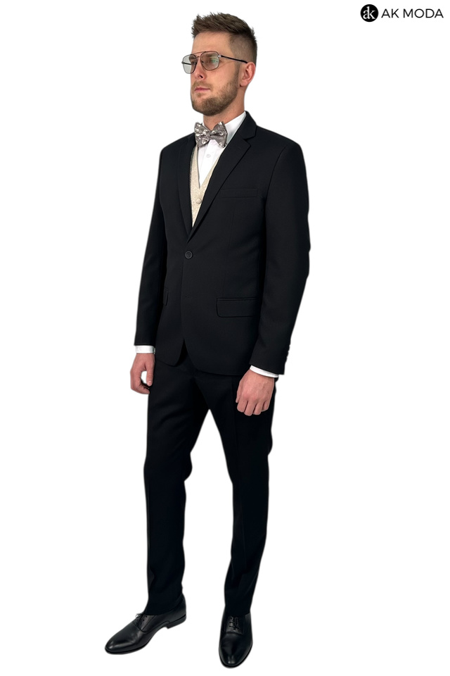 Garnitur męski w kolorze czarnym uszyty z fakturowanego materiału. Marynarka jednorzędowa, zapinana na 2 guziki, z tyłu dwa rozcięcia. Nogawki w spodniach zwężane.