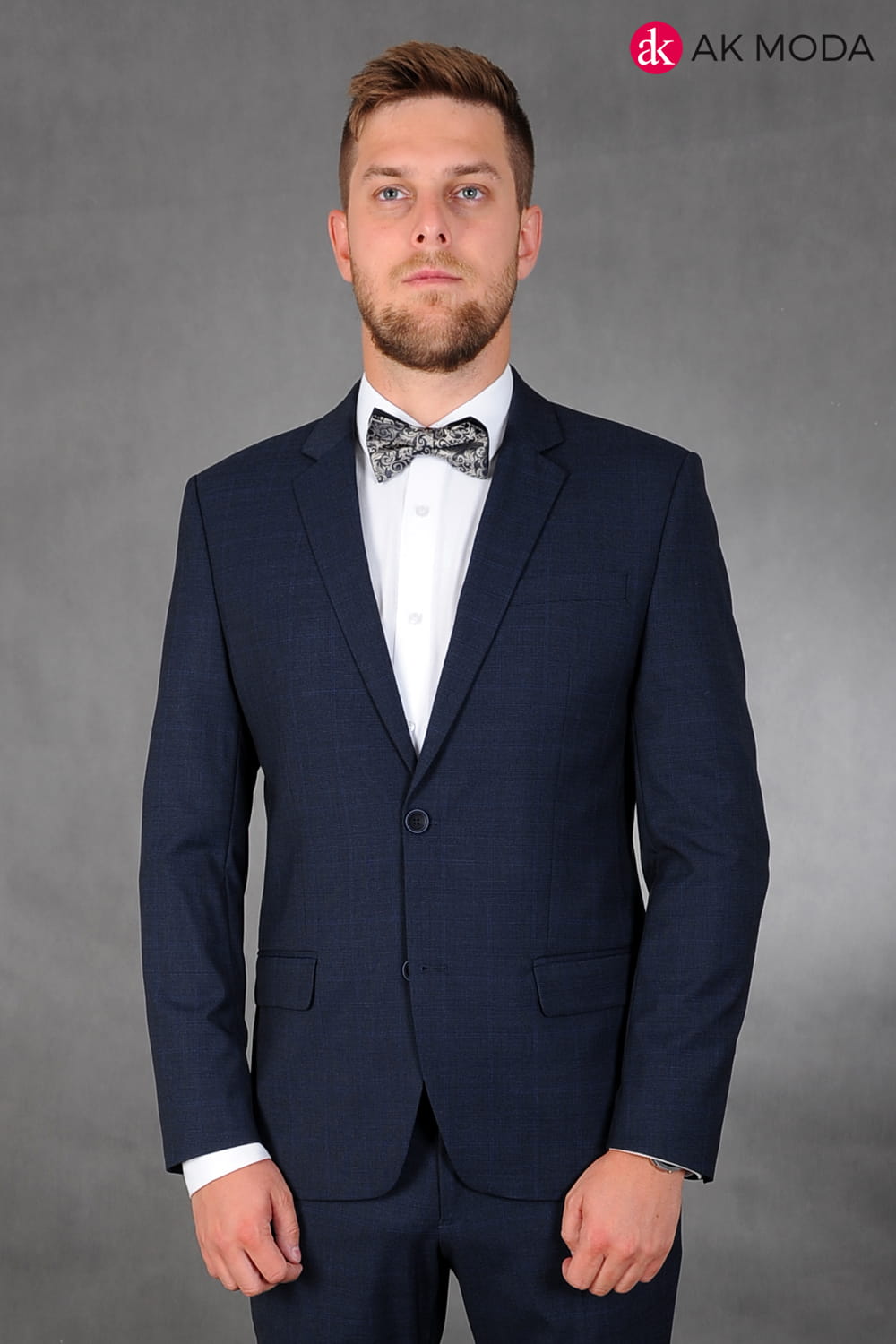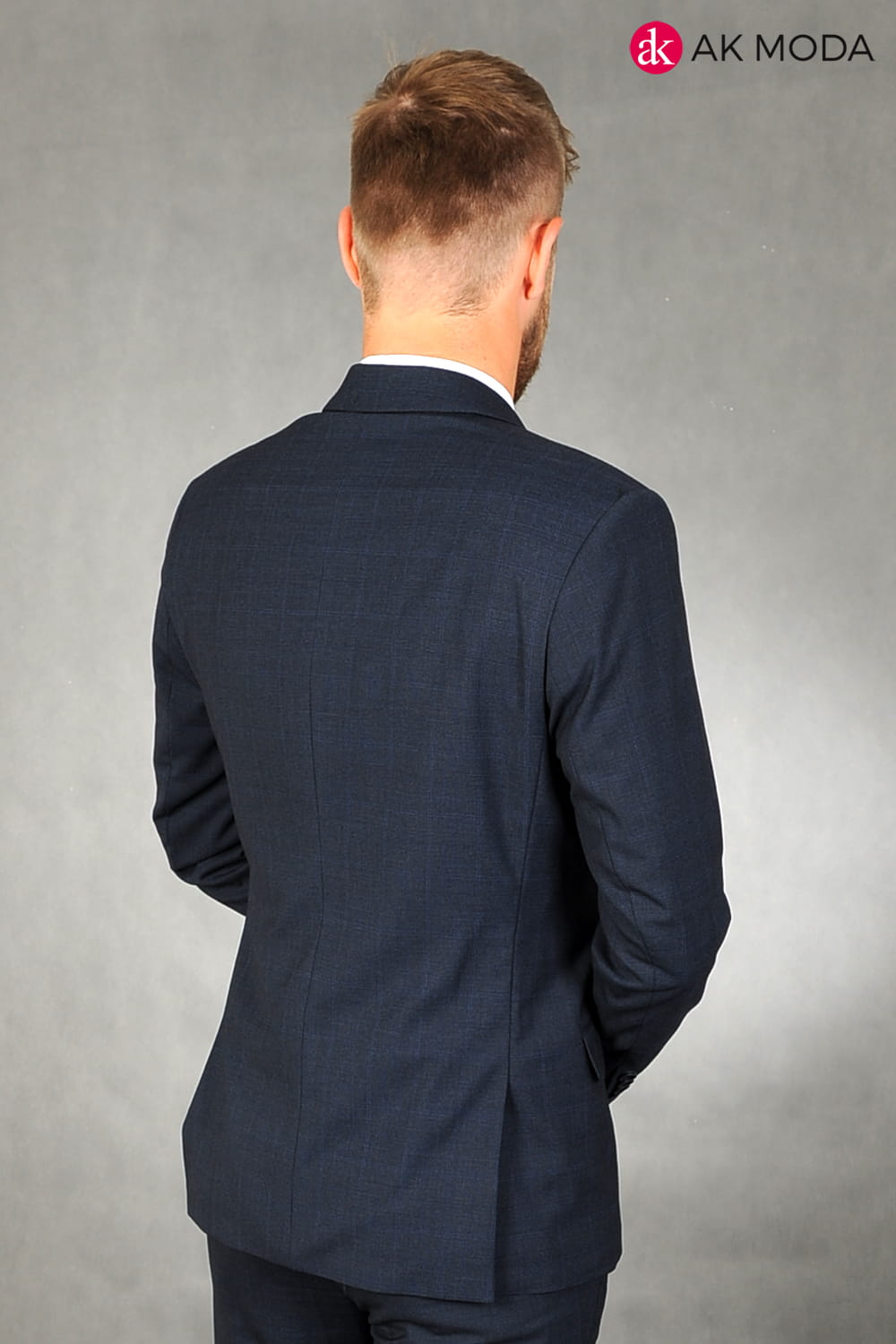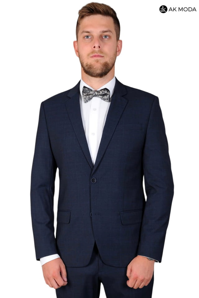 Garnitur męski w kolorze granatowym w kratkę. Marynarka jednorzędowa, z tyłu dwa rozcięcia. Nogawki w spodniach zwężane.