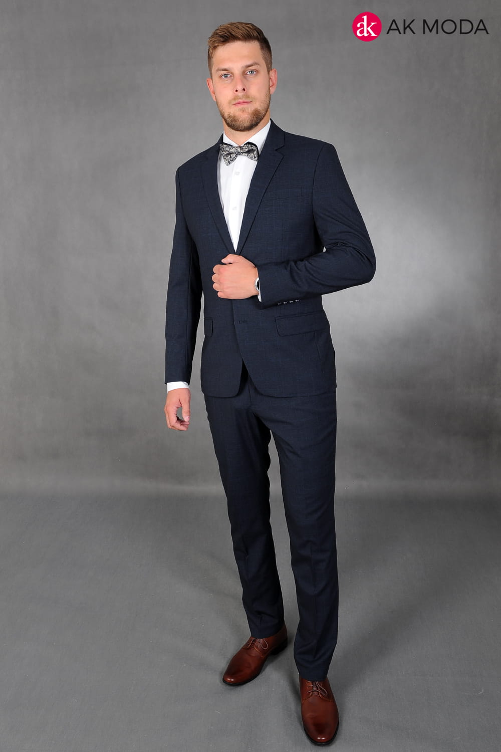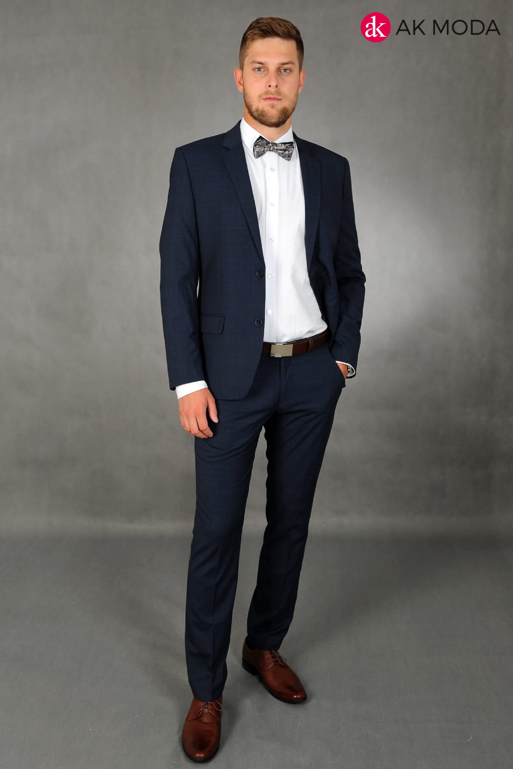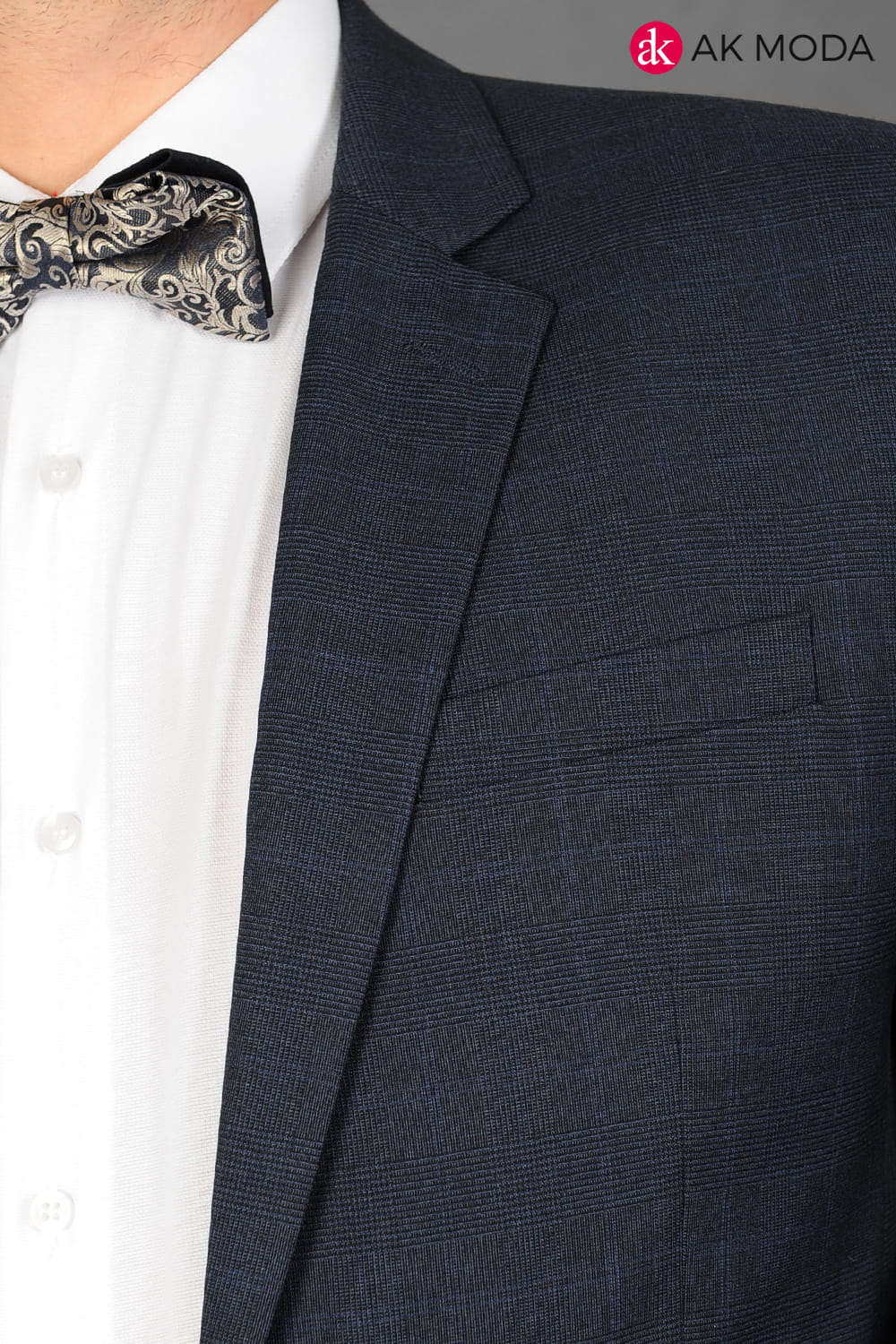 Garnitur męski w kolorze granatowym w kratkę. Marynarka jednorzędowa, z tyłu dwa rozcięcia. Nogawki w spodniach zwężane.