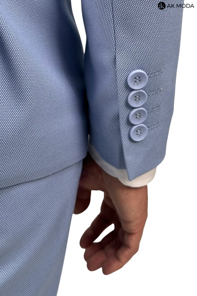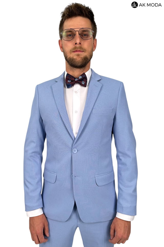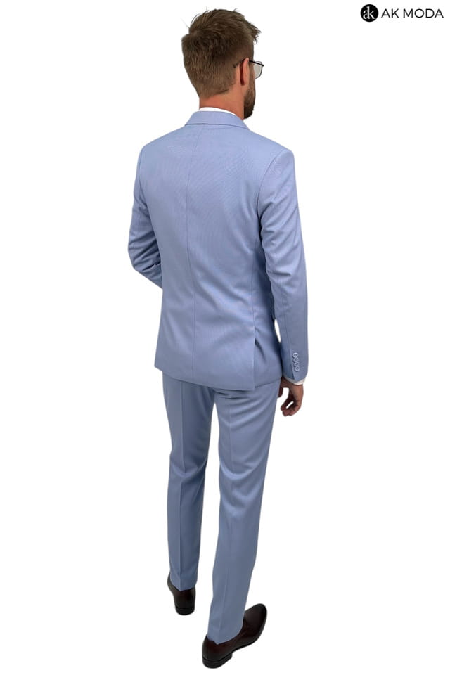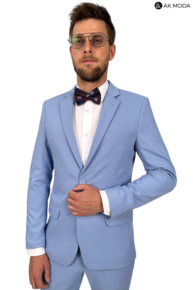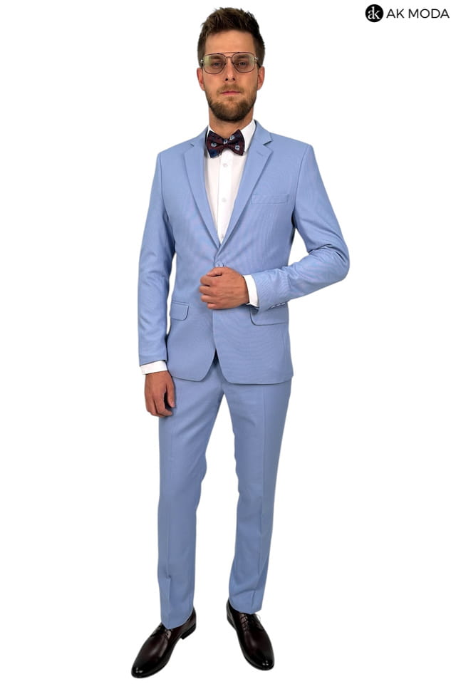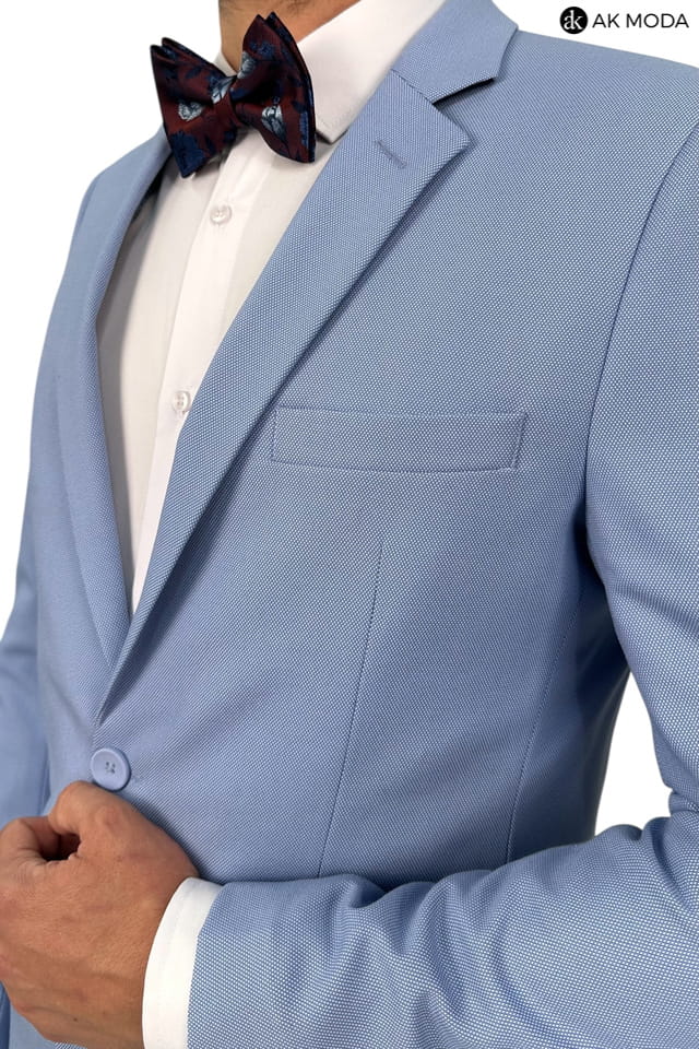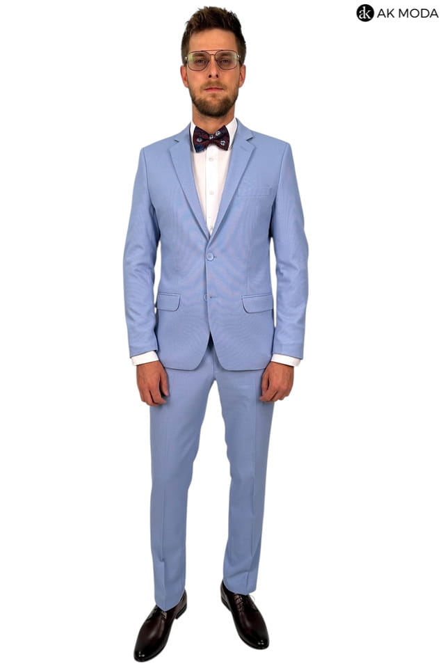 Garnitur męski w kolorze niebieskim uszyty z fakturowanego materiału. Marynarka jednorzędowa, zapinana na 2 guziki, z tyłu dwa rozcięcia. Nogawki w spodniach zwężane.