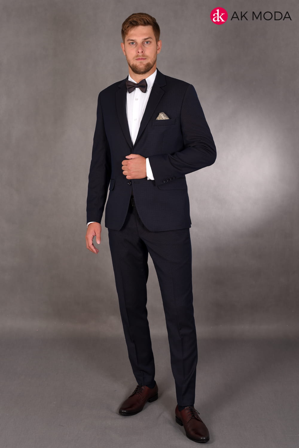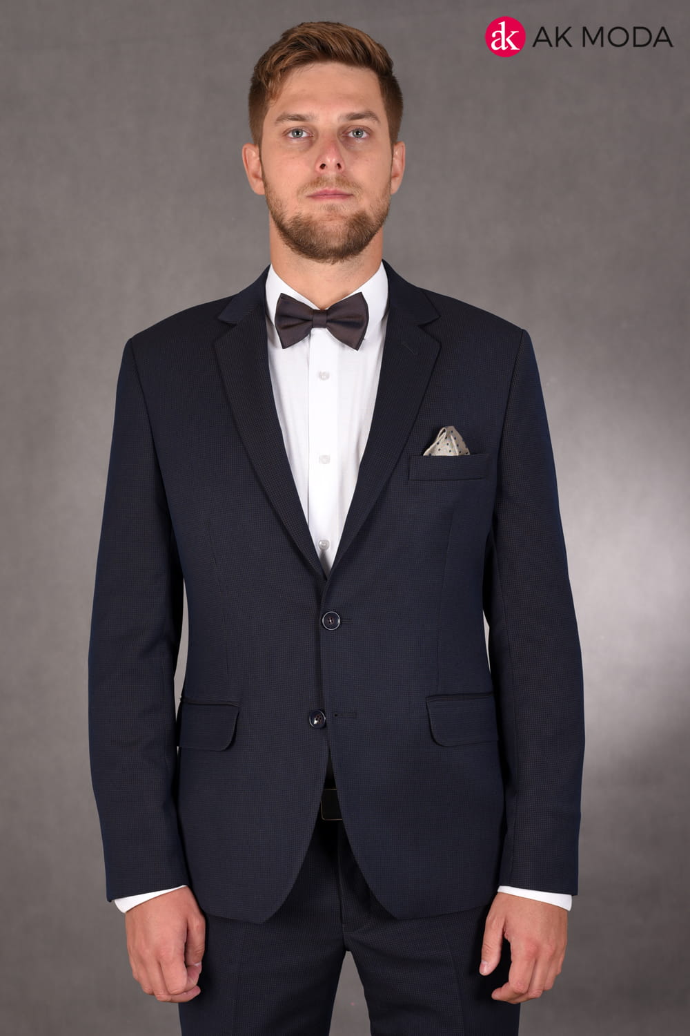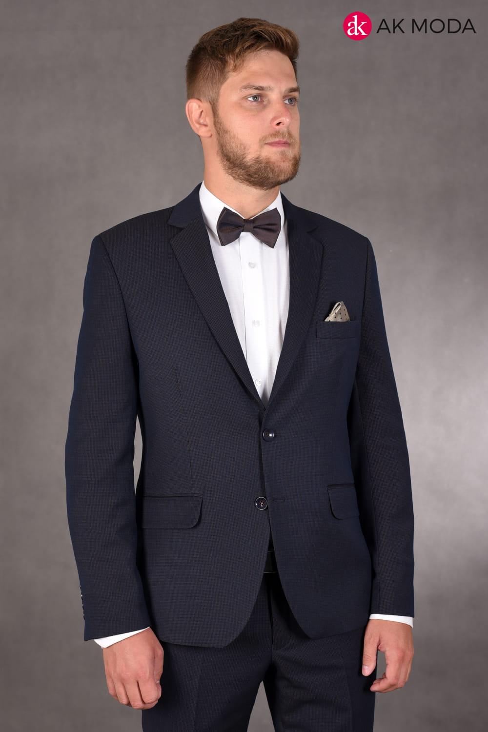 Granatowy garnitur męski w drobny wzorek. Marynarka taliowana, z tyłu dwa rozcięcia. Nogawki w spodniach zwężane.