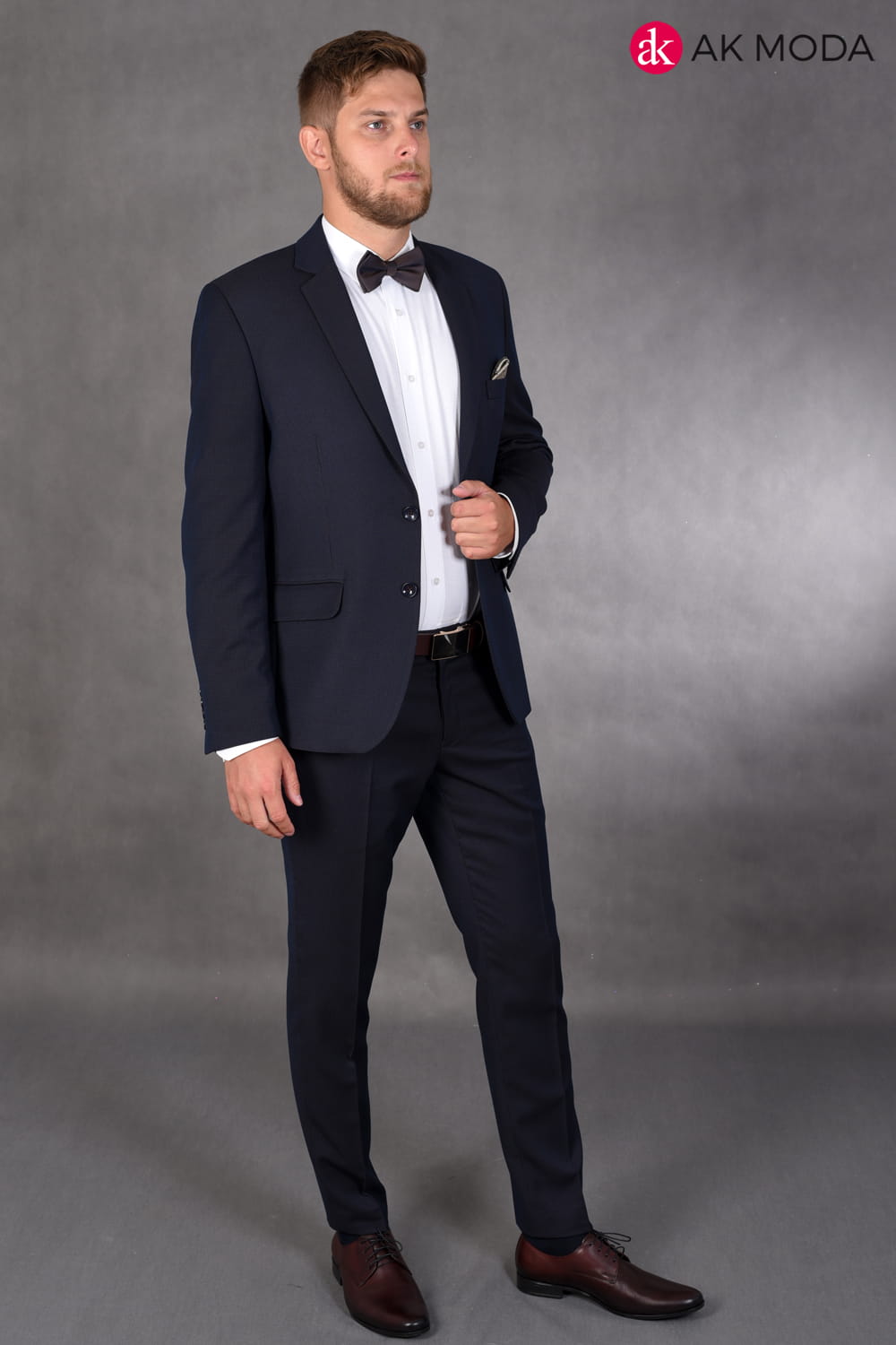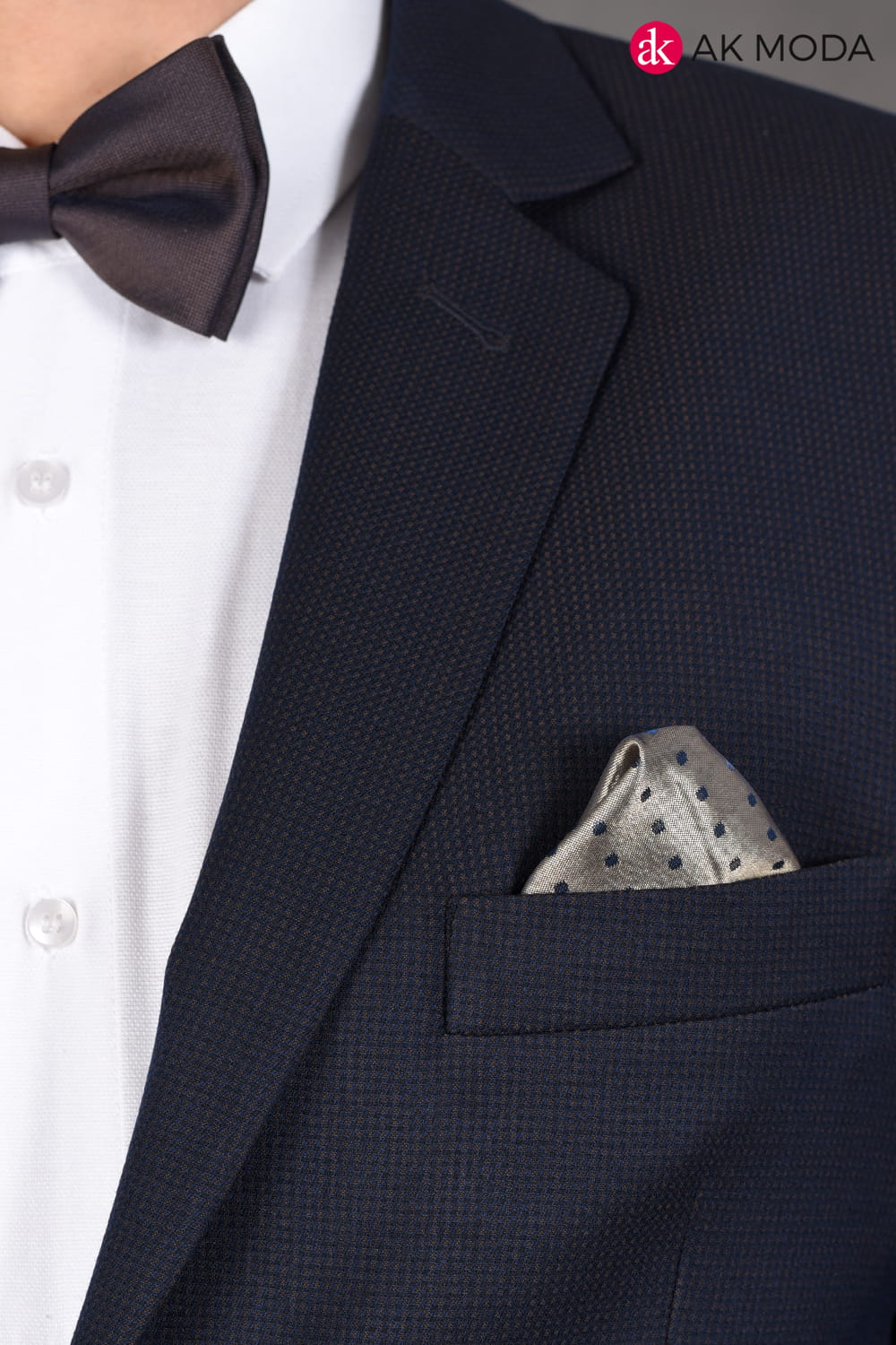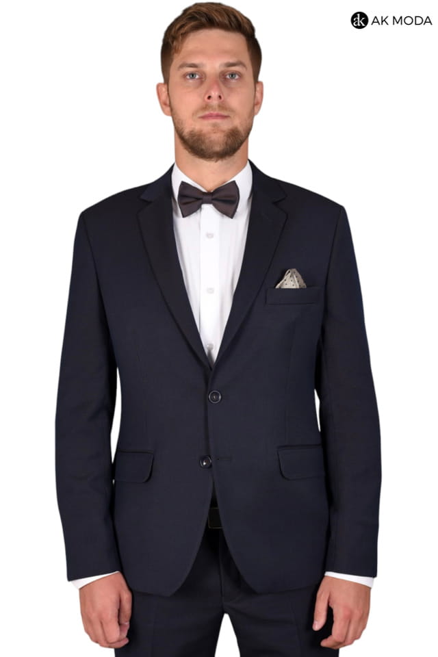 Granatowy garnitur męski w drobny wzorek. Marynarka taliowana, z tyłu dwa rozcięcia. Nogawki w spodniach zwężane.
