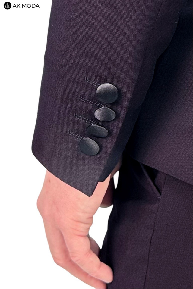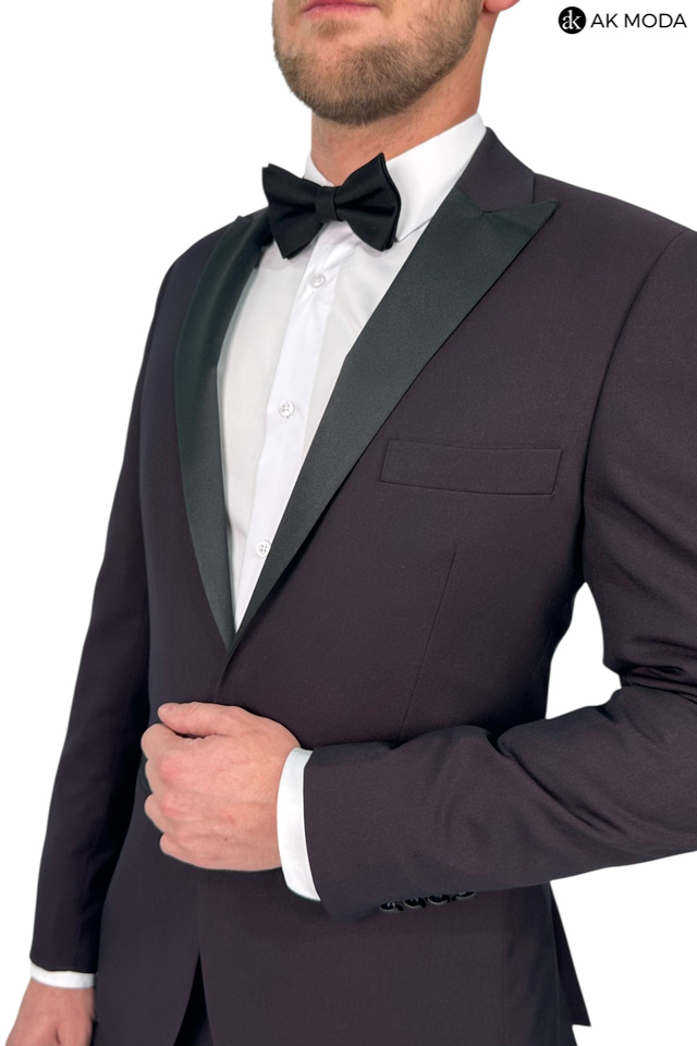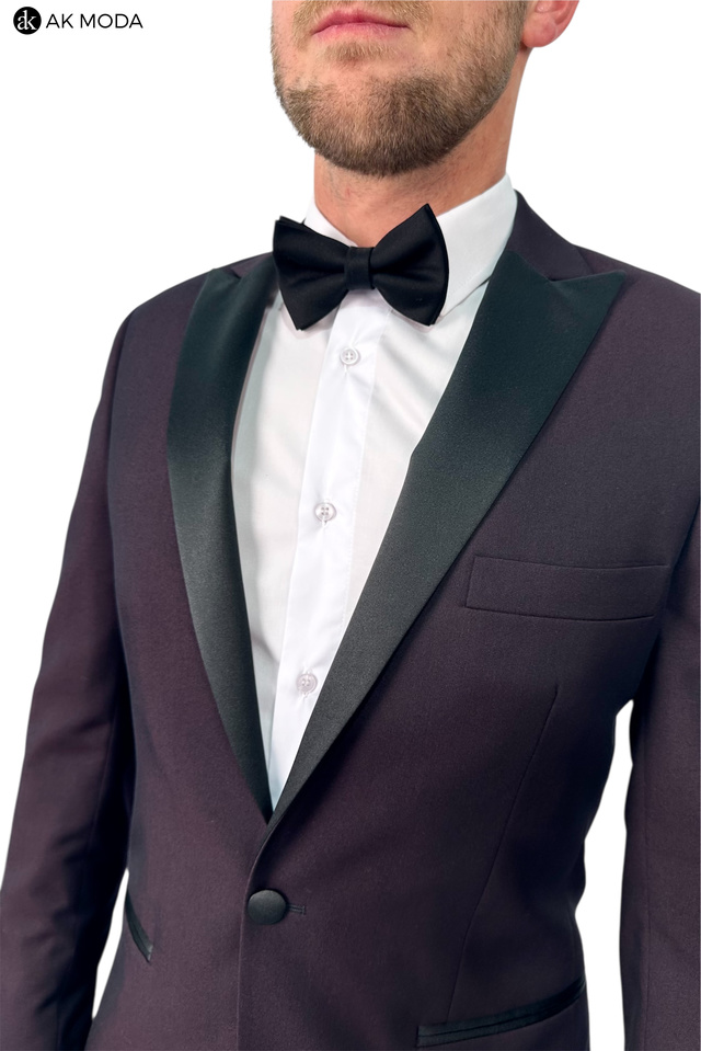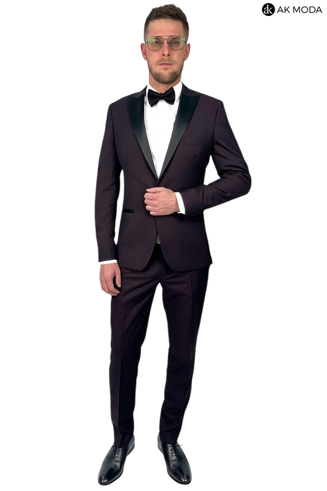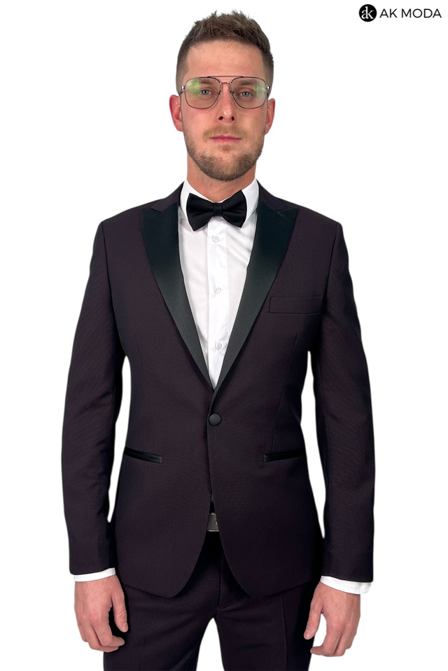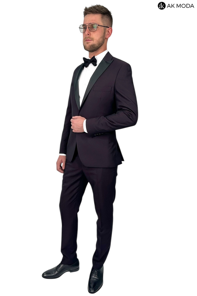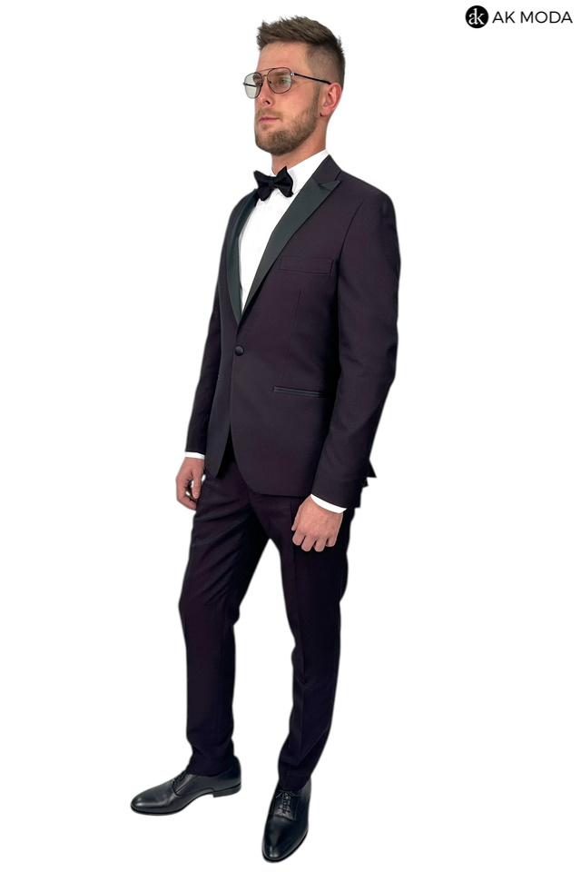 Męski garnitur smokingowy w kolorze bordowym. Marynarka jednorzędowa, z tyłu dwa rozcięcia. Nogawki w spodniach zwężane.