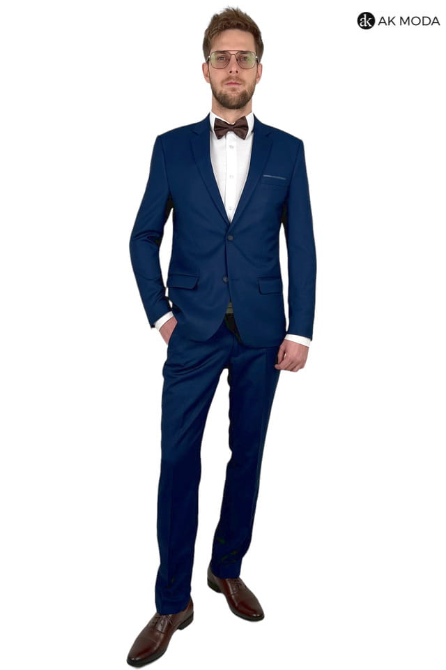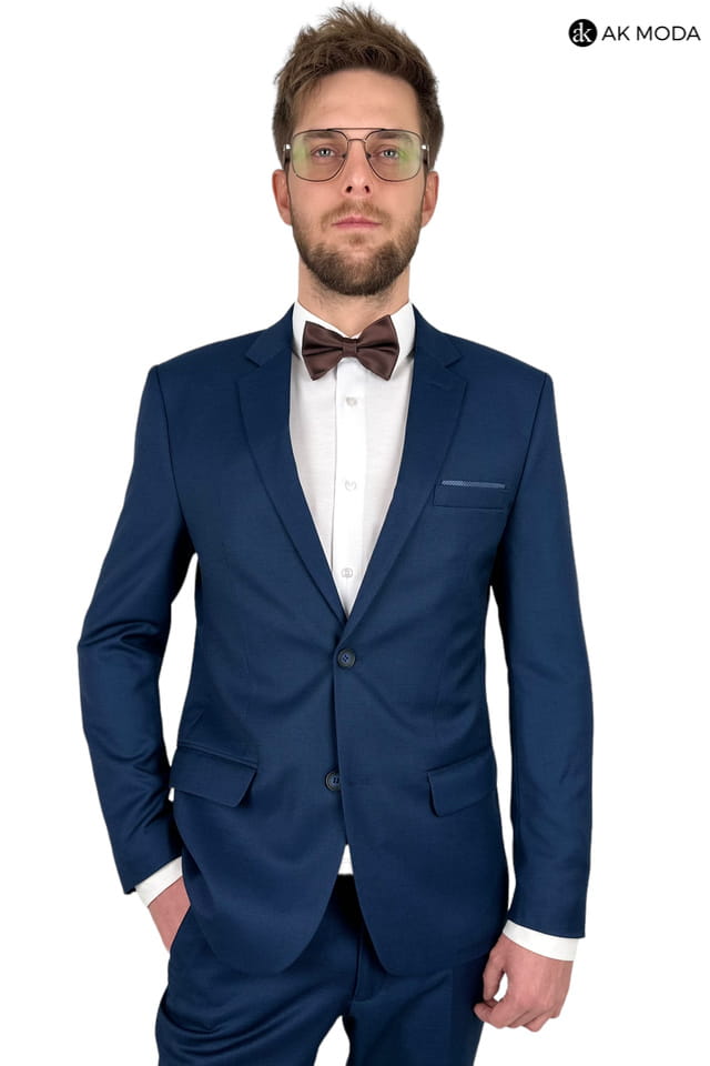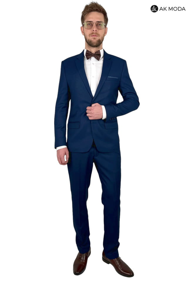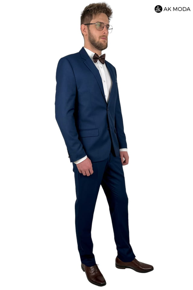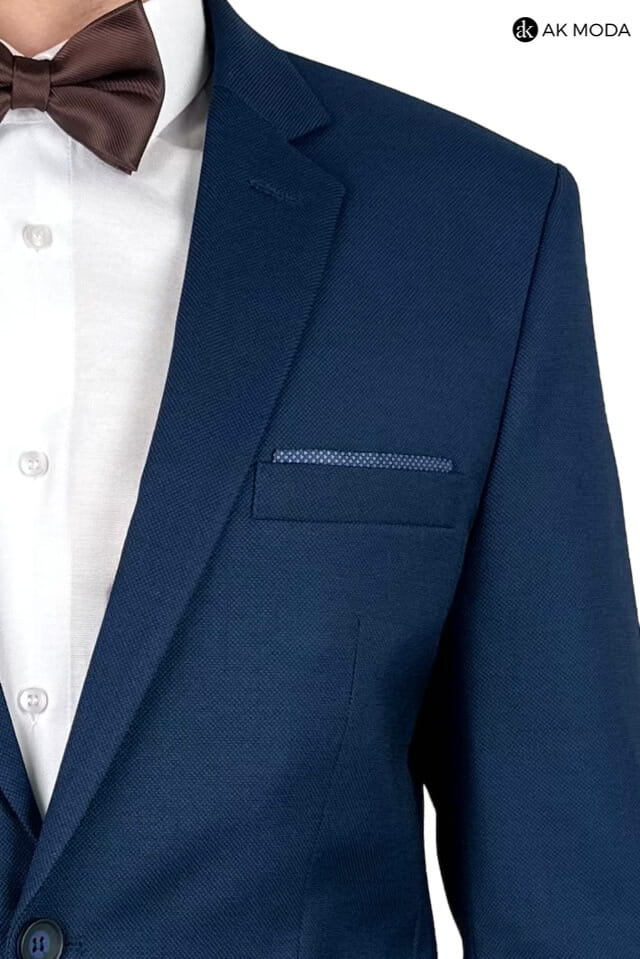 Garnitur męski granatowy, uszyty ze strukturalnej tkaniny. Marynarka jednorzędowa, z tyłu dwa rozcięcia. Nogawki w spodniach zwężane.