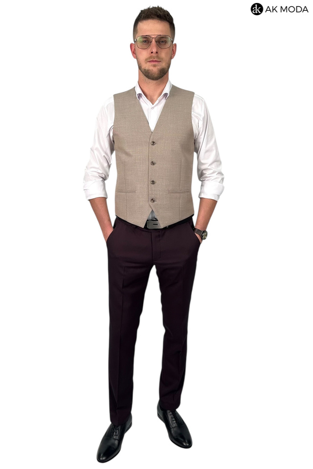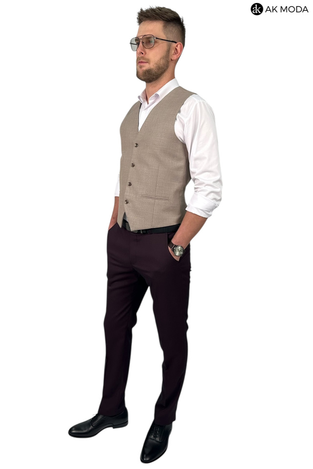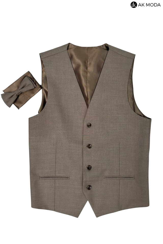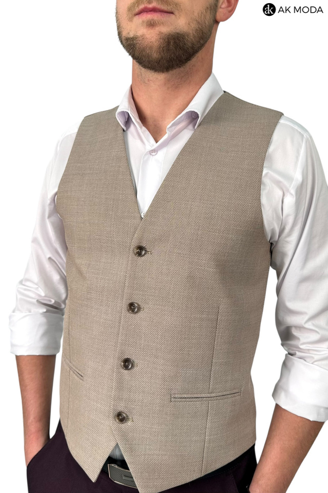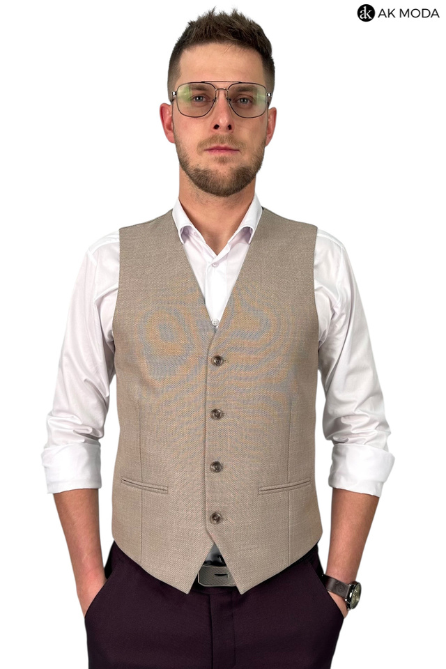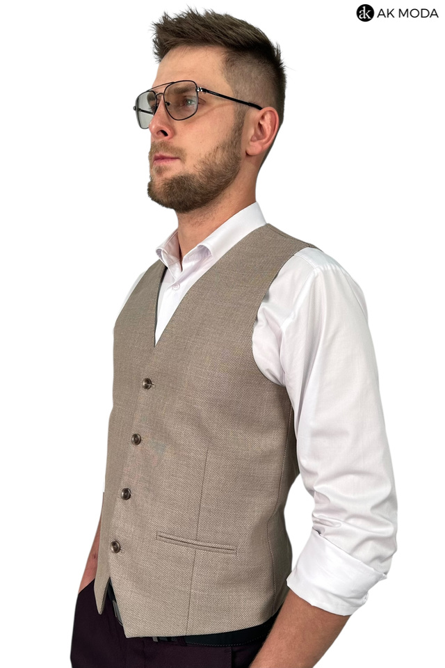 Elegancka kamizelka męska w kolorze jasnobrązowym, uzsyta z fakturowanego materiału.