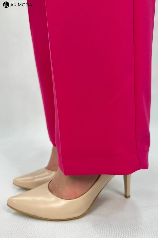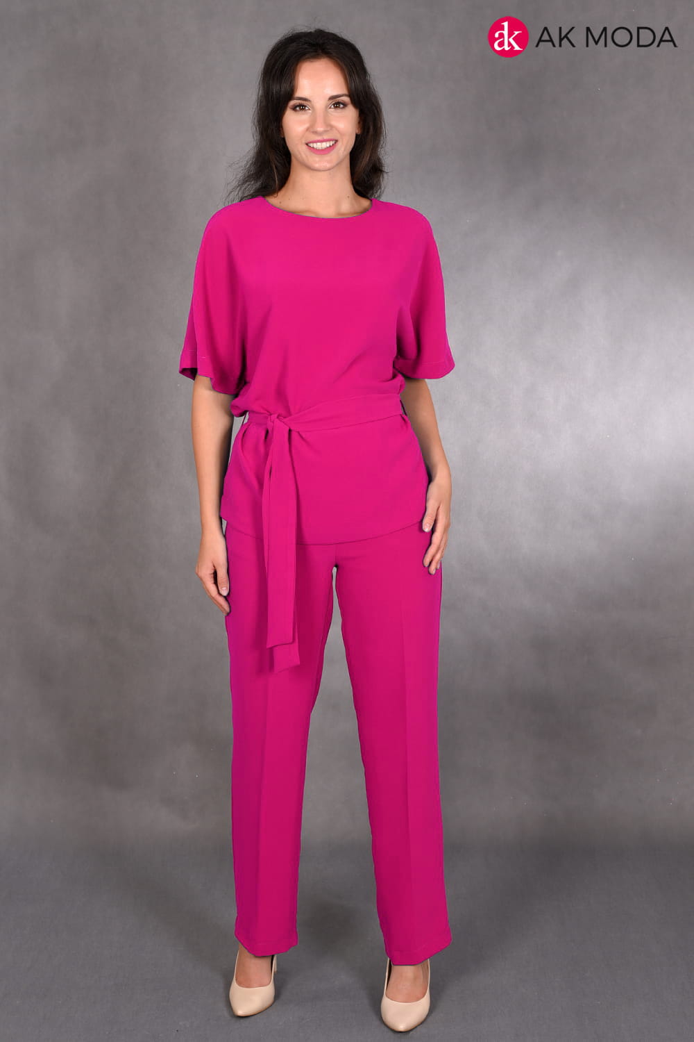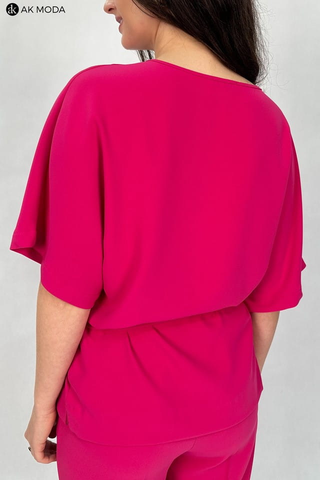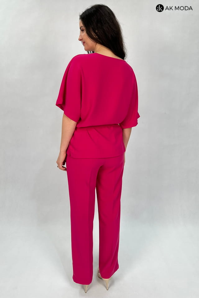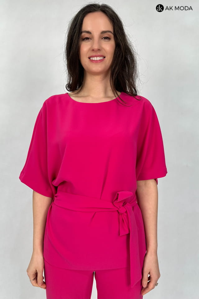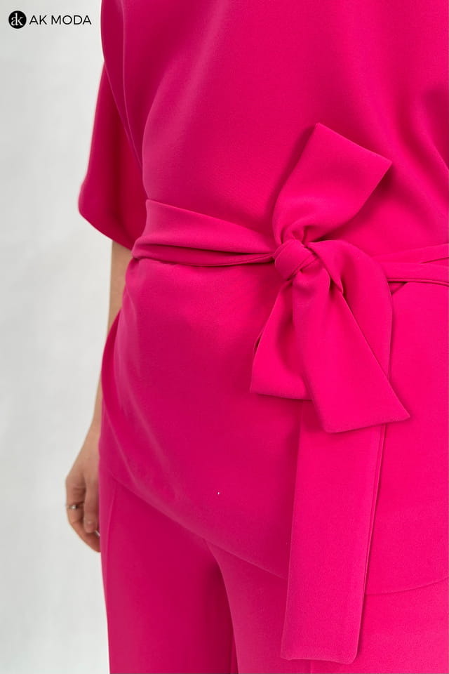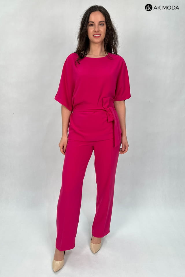 Komplet damski w kolorze fuksjowym. W skład zestawu wchodzi luźna, dłuższa bluzka z wiązanym paskiem oraz spodnie z szerszymi nogawkami.