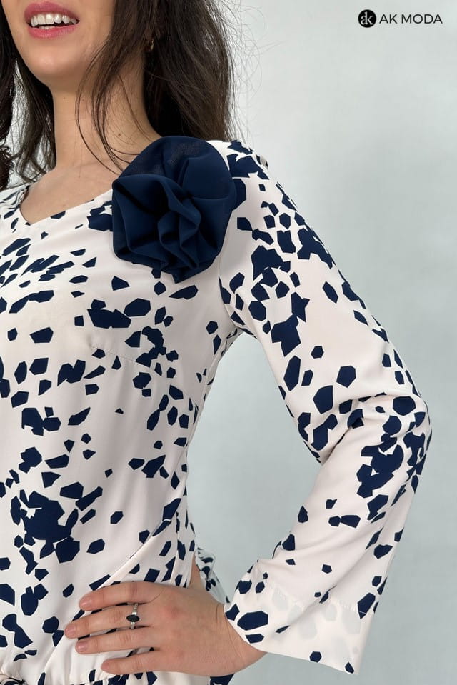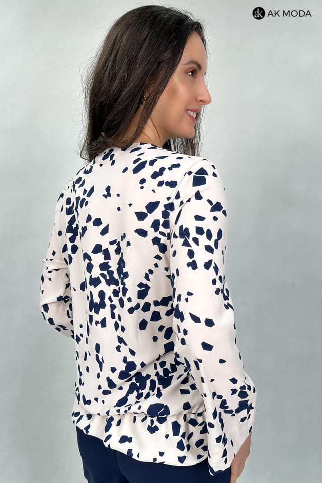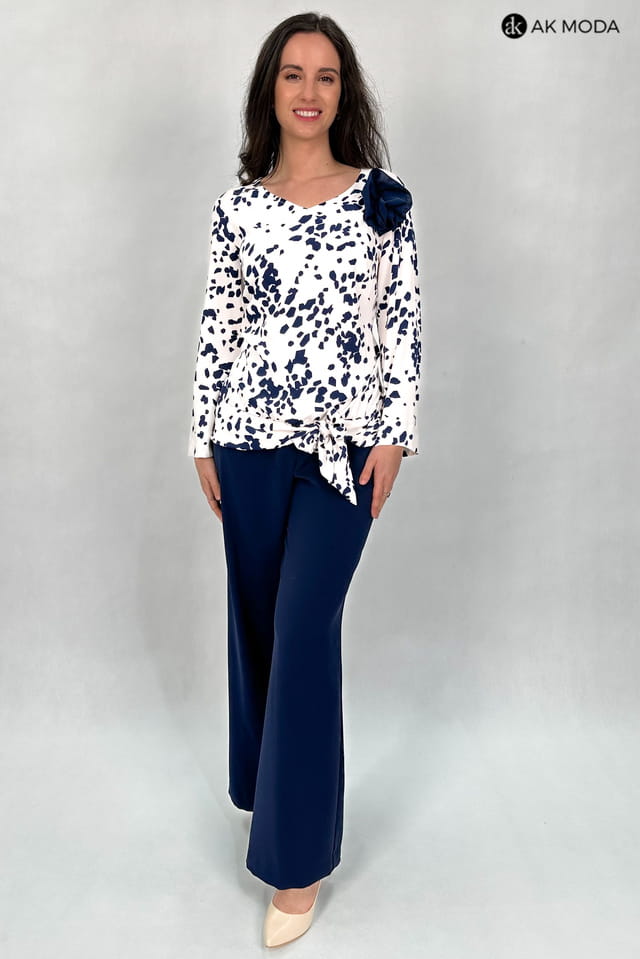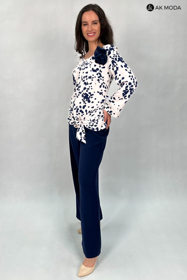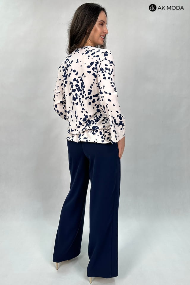 Komplet damski składający się z luźnej, dłuższej bluzki z gumką i wiązaniem w pasie oraz spodni z szerszymi nogawkami i gumkami w talii. Góra kompletu w kolorze beżowym w granatowy wzorek, dół gładki, granatowy.