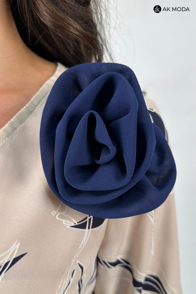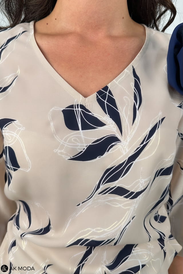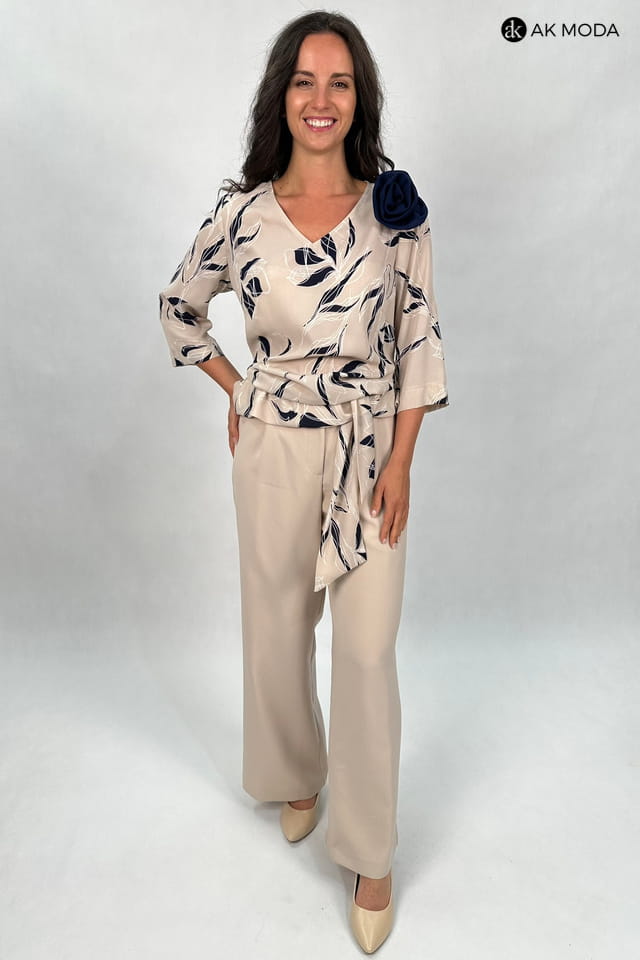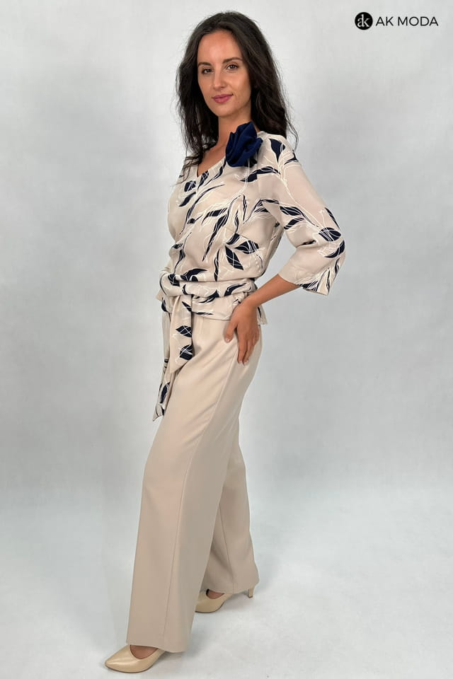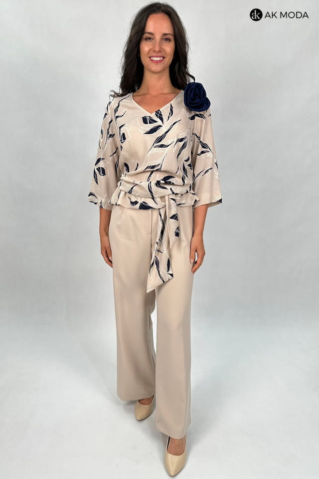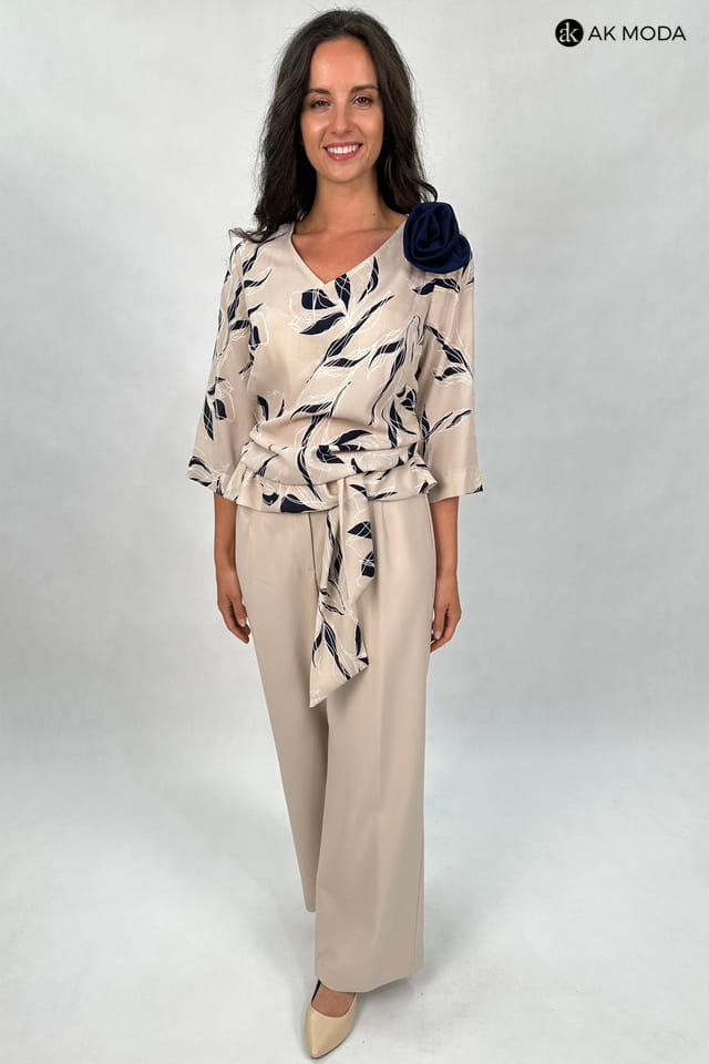 Komplet damski w kolorze beżowym - dół gładki, góra wzorzysta. W skład zestawu wchodzi luźna, dłuższa bluzka z gumką i wiązaniem w pasie oraz spodnie z szerszymi nogawkami i gumkami w talii. Przy bluzce ozdobny, odpinany kwiatek
