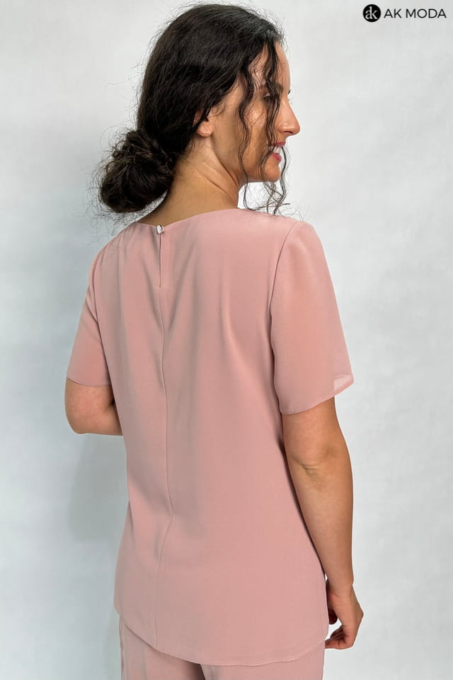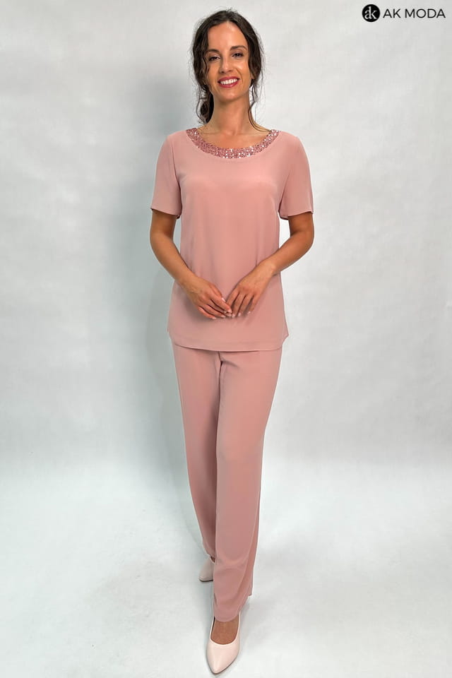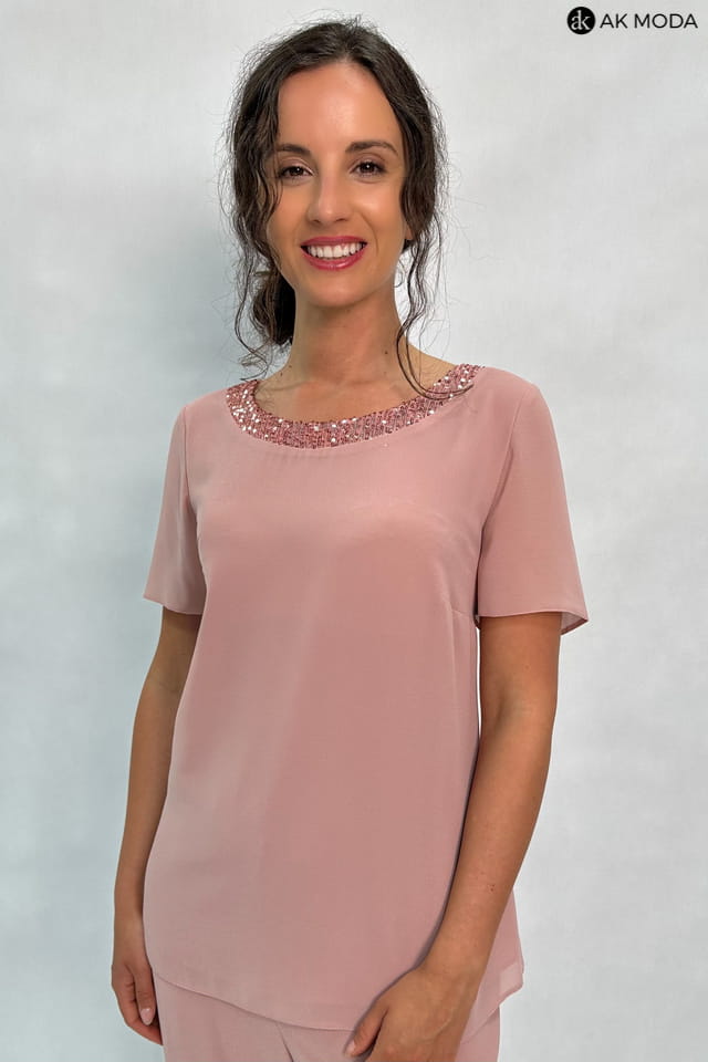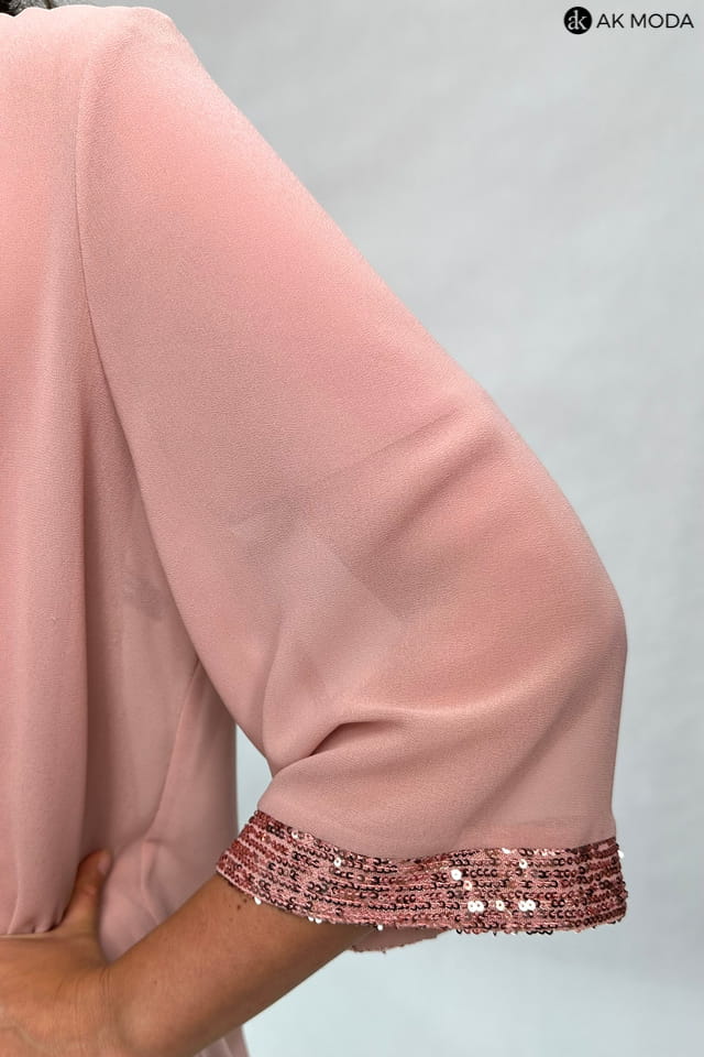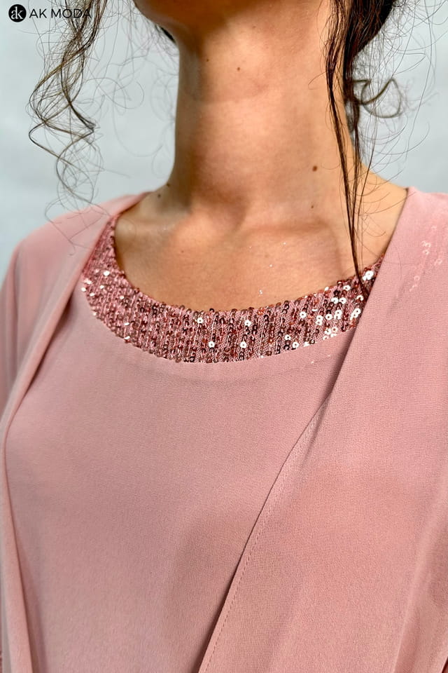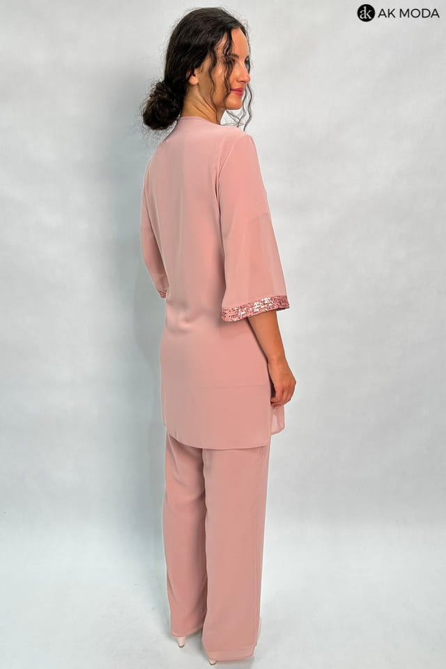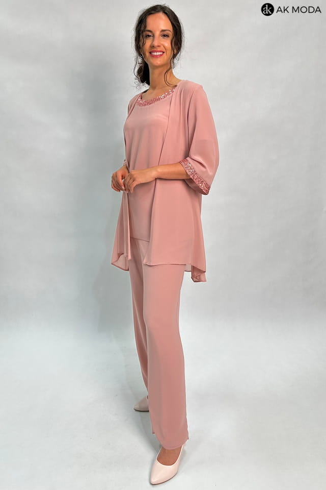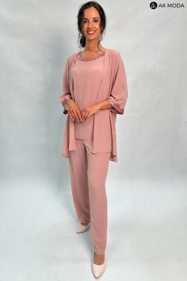 Trzyczęściowy komplet damski w kolorze brudnego pudrowego różu, uszyty z dwóch warstw tiulu. W skład zestawu wchodzi luźna, dłuższa bluzka z okragłym dekoltem ozdobionym cekinami, spodnie z szerszymi nogawkami i gumkami w pasie oraz zwiewna narzutka z rękawami do łokcia.