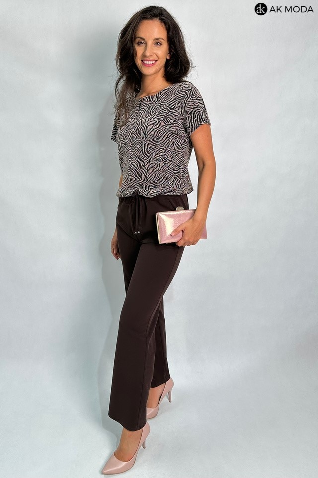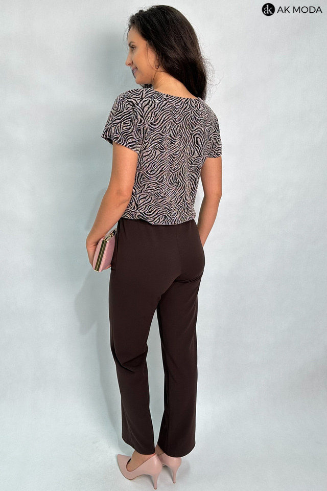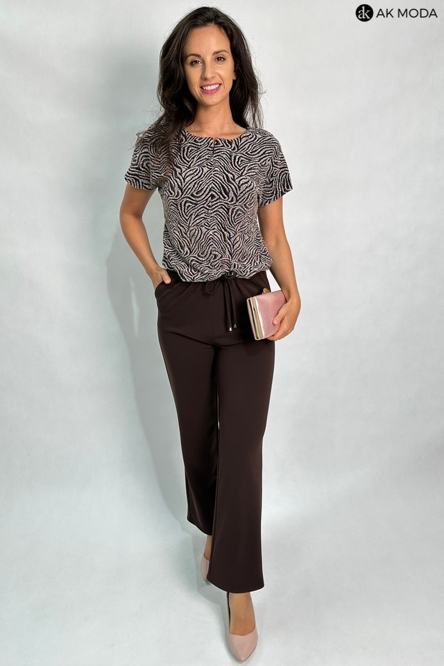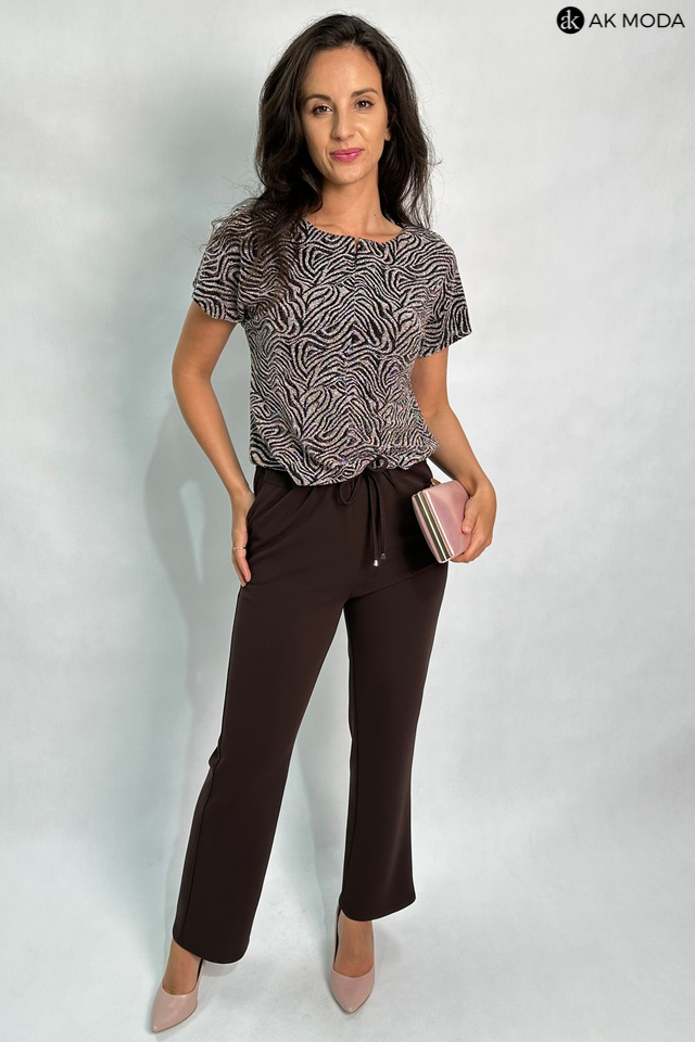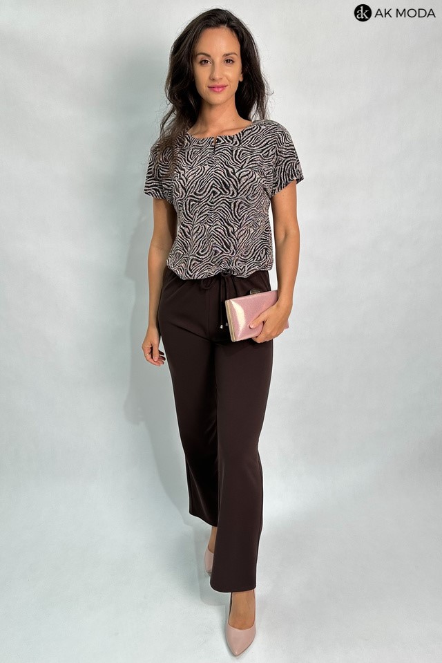 Kombinezon damski o luźnym kroju, w kolorze brązowo-złotym z elastyczną górą. Fason zapinany z przodu na zamek, w talii gumka oraz troczek do wiązania, wszyty w tunel.