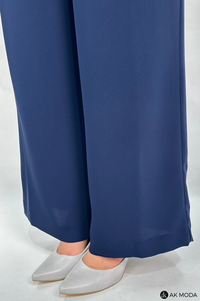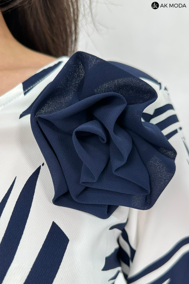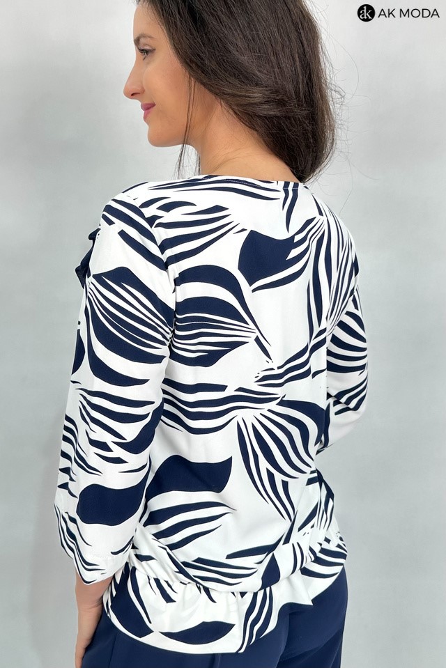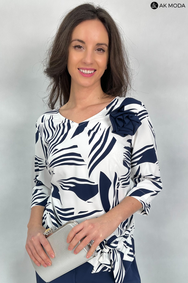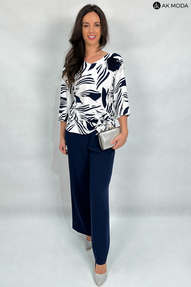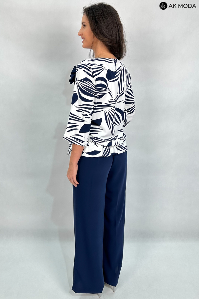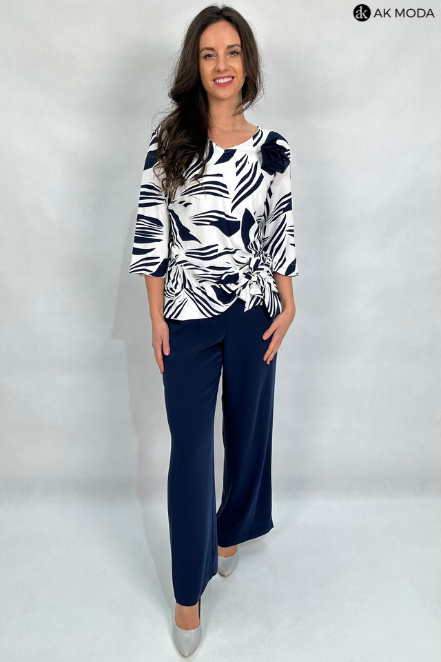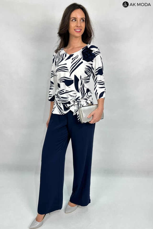 Komplet damski w kolorze granatowo-śmietankowym z gładkim dołem i wzorzystą górą. W skład zestawu wchodzi luźna, dłuższa bluzka z gumką i wiązaniem w pasie oraz spodnie z szerszymi nogawkami i gumką w talii. Przy bluzce odpinany ozdobny kwiatek.