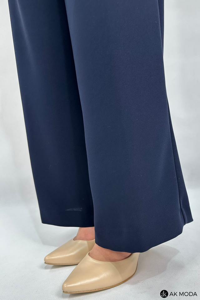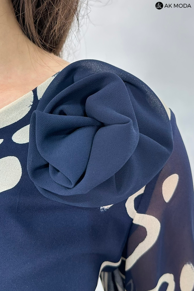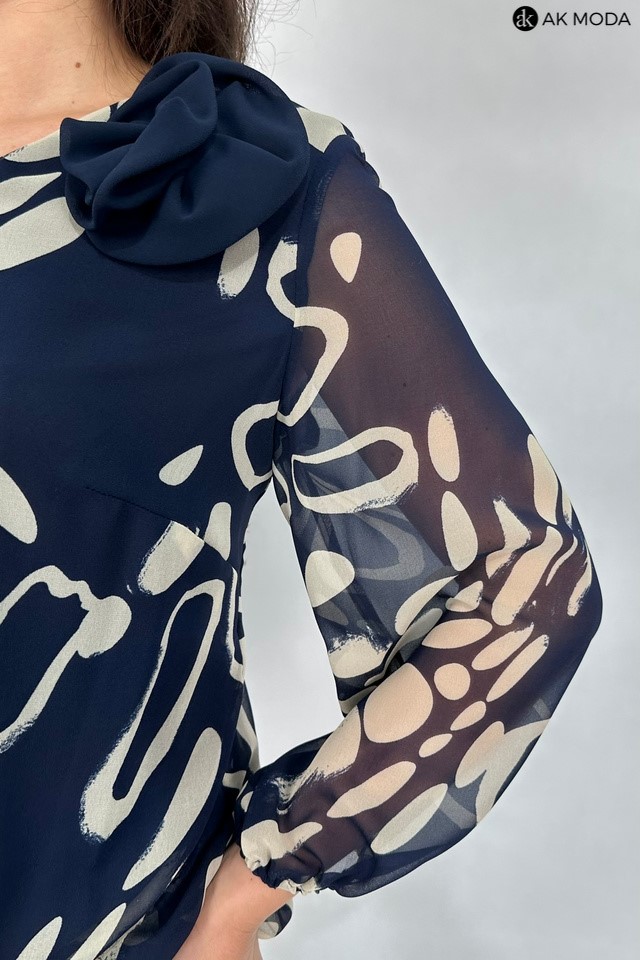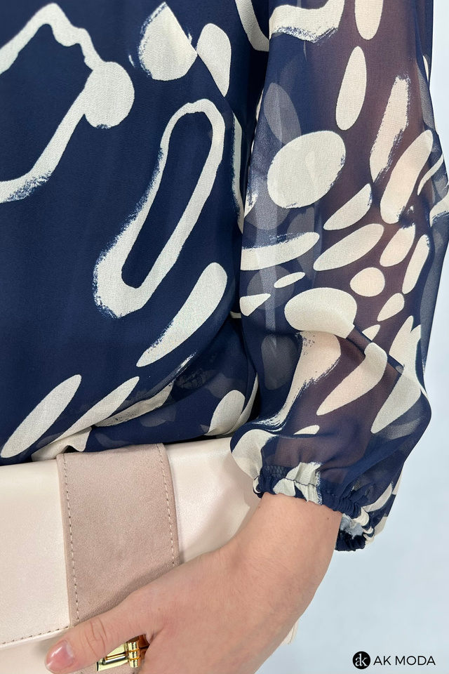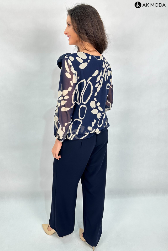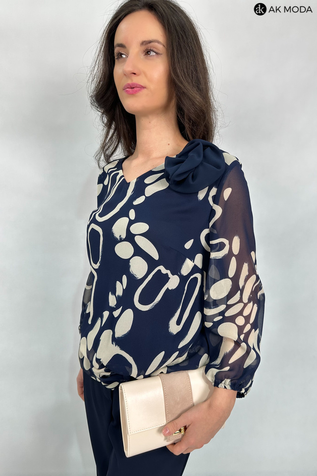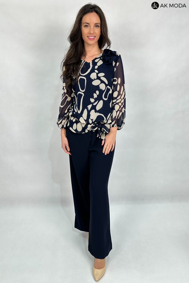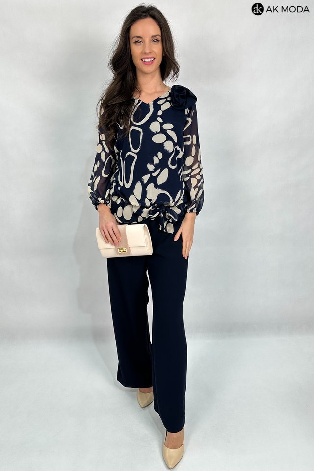 Komplet damski w kolorze beżowo-granatowym, z gładkim dołem i wzorzystą górą. W skład zestawu wchodzi luźna, dłuższa bluzka z gumką i wiązaniem w pasie oraz spodnie z szerszymi nogawkami i gumką w talii. Przy bluzce odpinany ozdobny kwiatek.