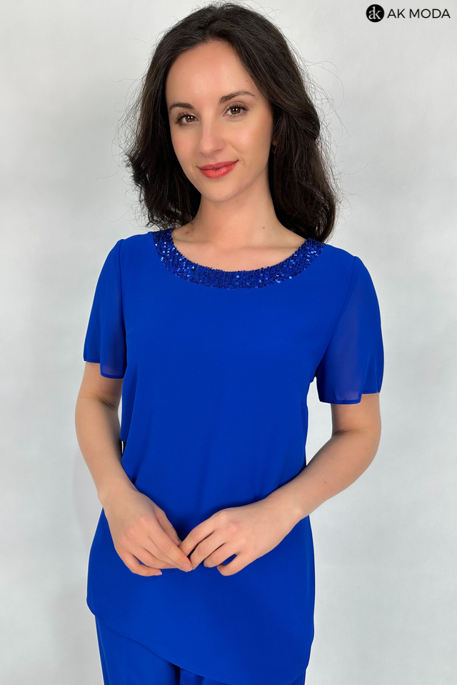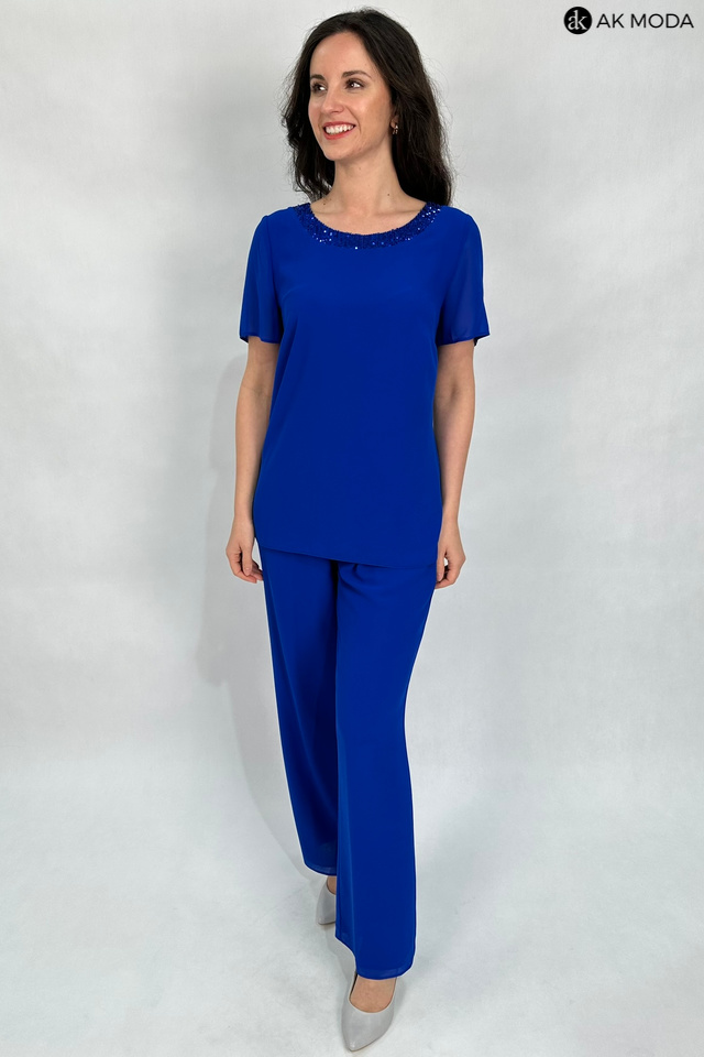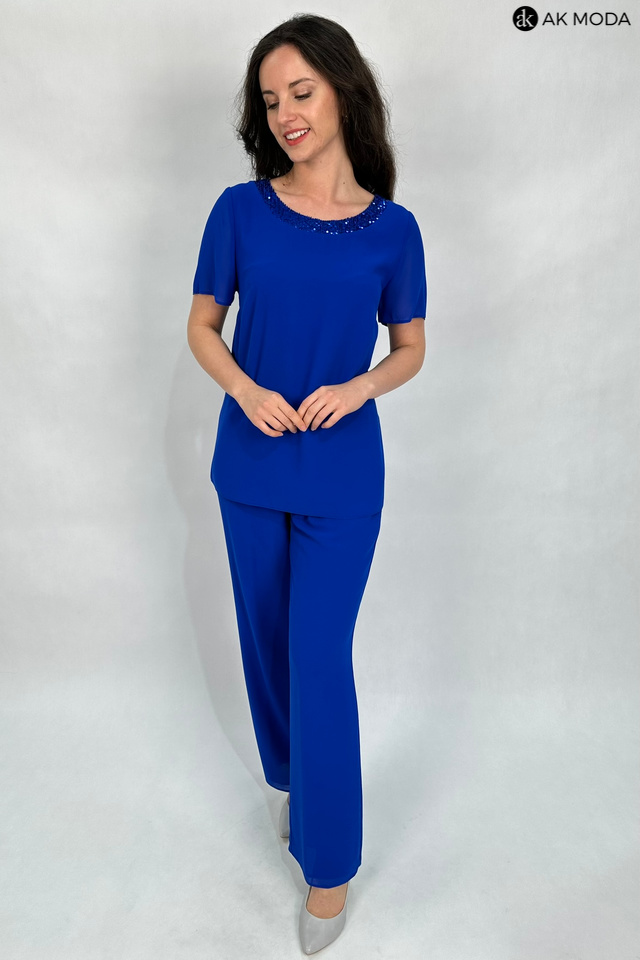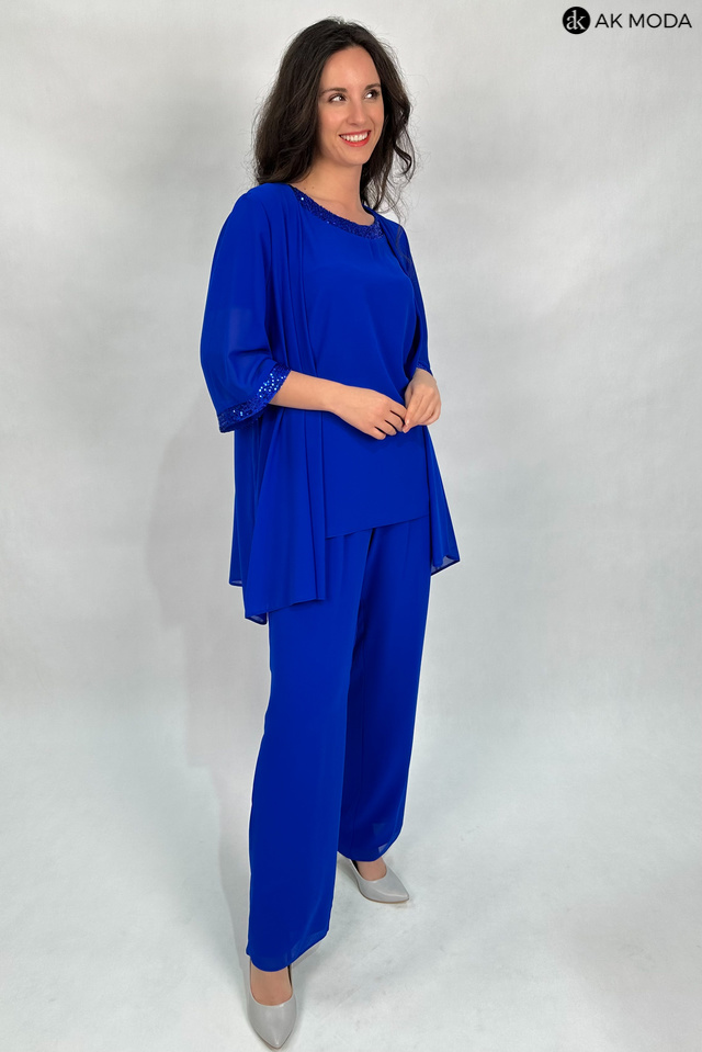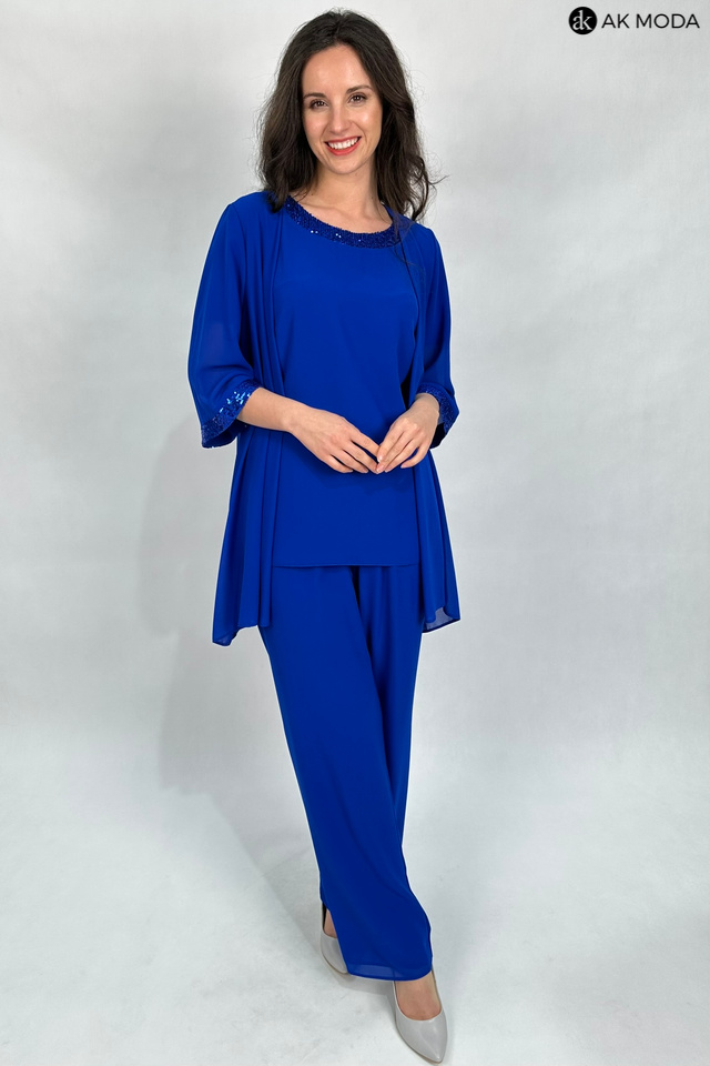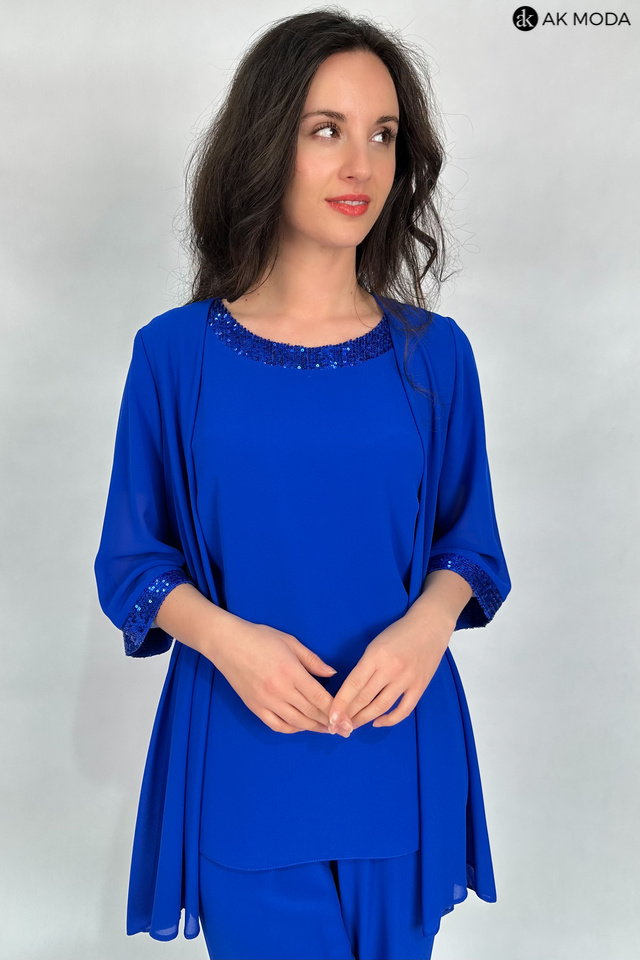 Trzyczęściowy komplet damski w kolorze chabrowym, uszyty z dwóch warstw tiulu. W skład zestawu wchodzi luźna, dłuższa bluzka z okrągłym dekoltem ozdobionym cekinami, spodnie z szerszymi nogawkami i gumkami w pasie oraz zwiewna narzutka z rękawami do łokcia.