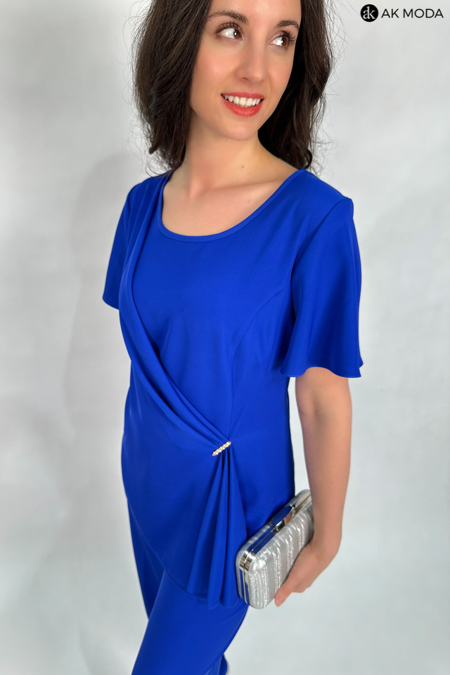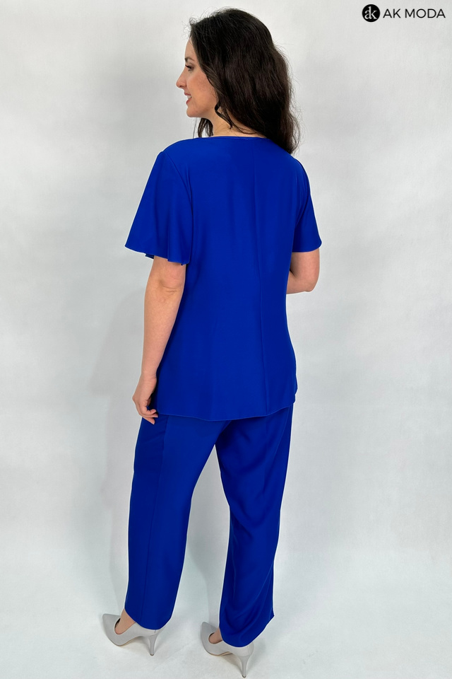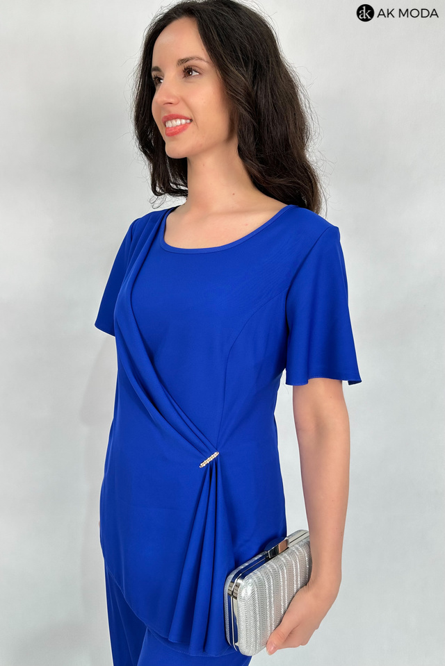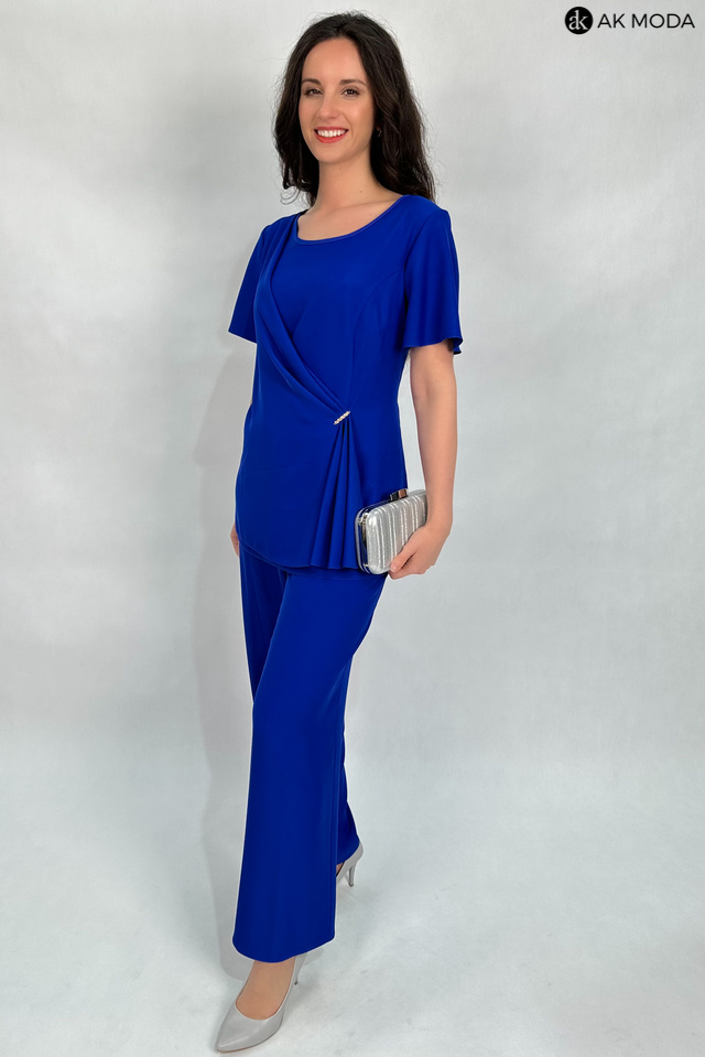 Elegancki komplet damski w kolorze chabrowym. W skład zestawu wchodzi luźna, dłuższa bluzka z okragłym dekoltem i ozdobnie upietą warstwą materiału oraz spodnie z szerszymi nogawkami i gumką w pasie.
