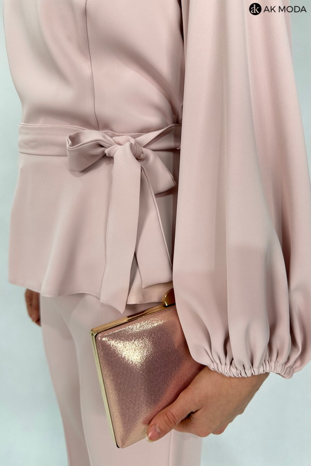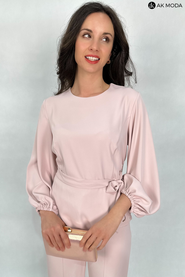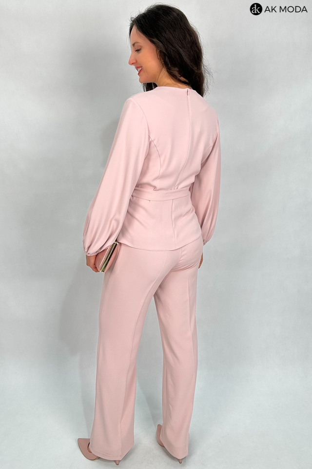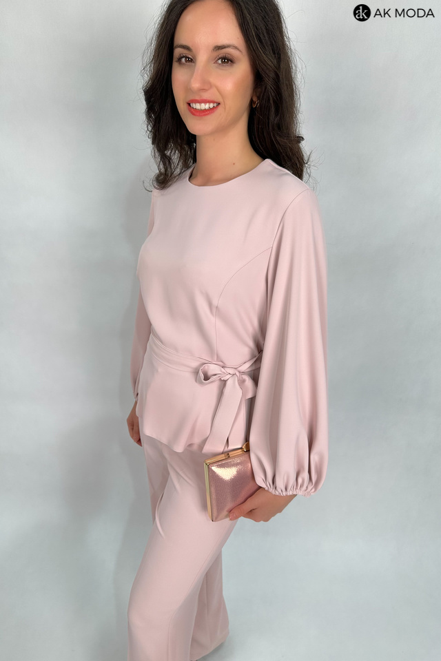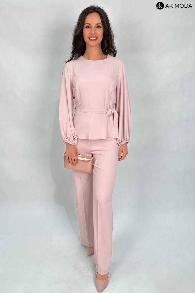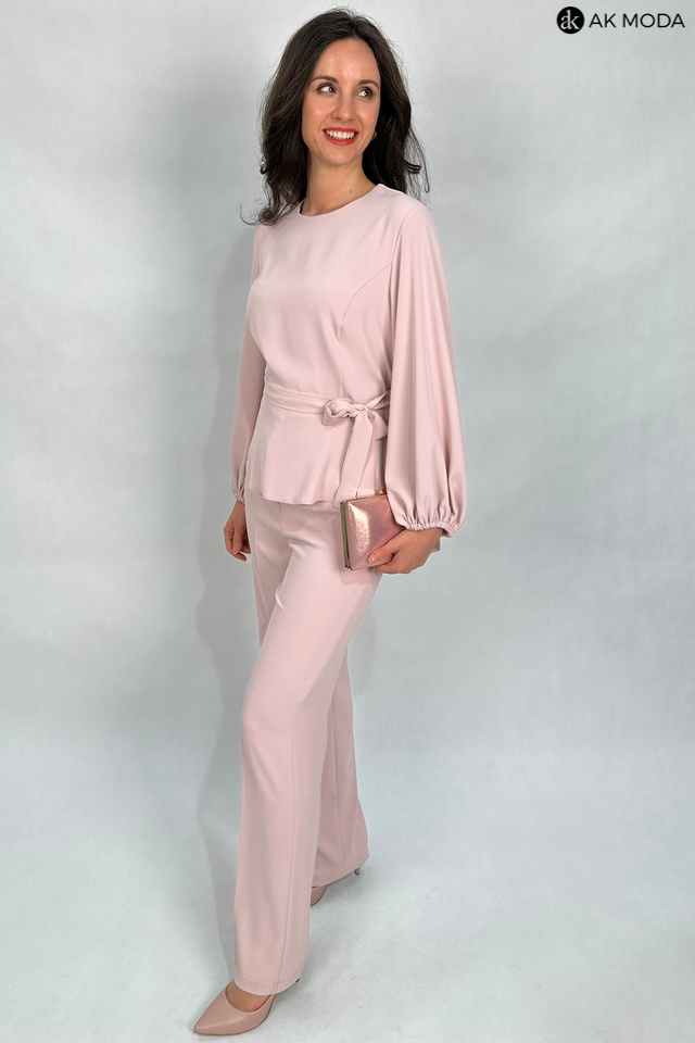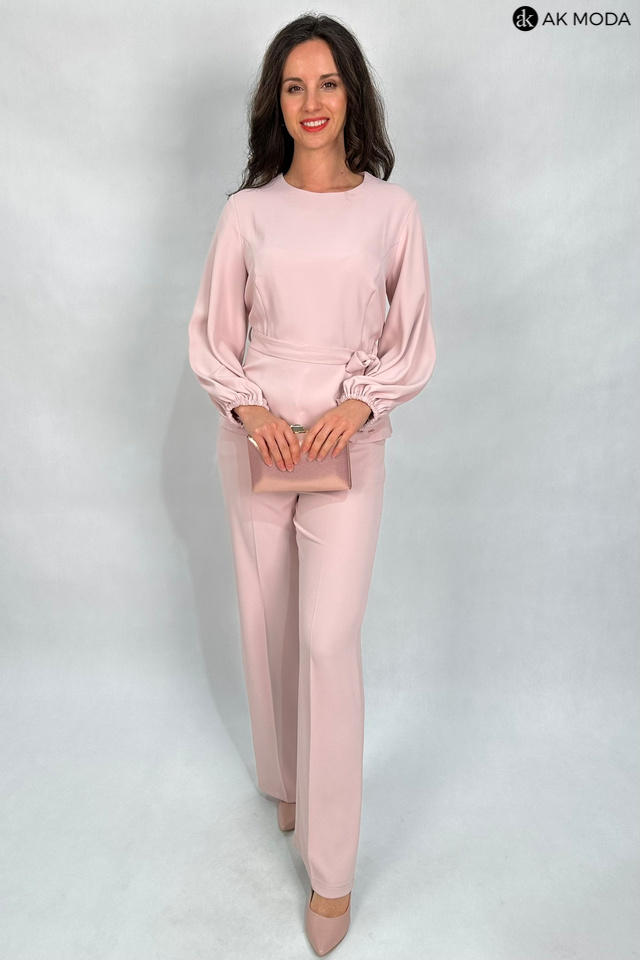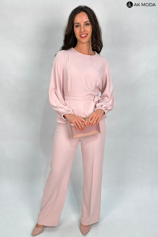 Elegancki komplet damski w kolorze pudrowego różu. W skład zestawu wchodzi bluzka z długimi, bufiastymi rękawami i okrągłym dekoltem oraz spodnie z szerszymi nogawkami. Spodnie posiadają kieszenie.