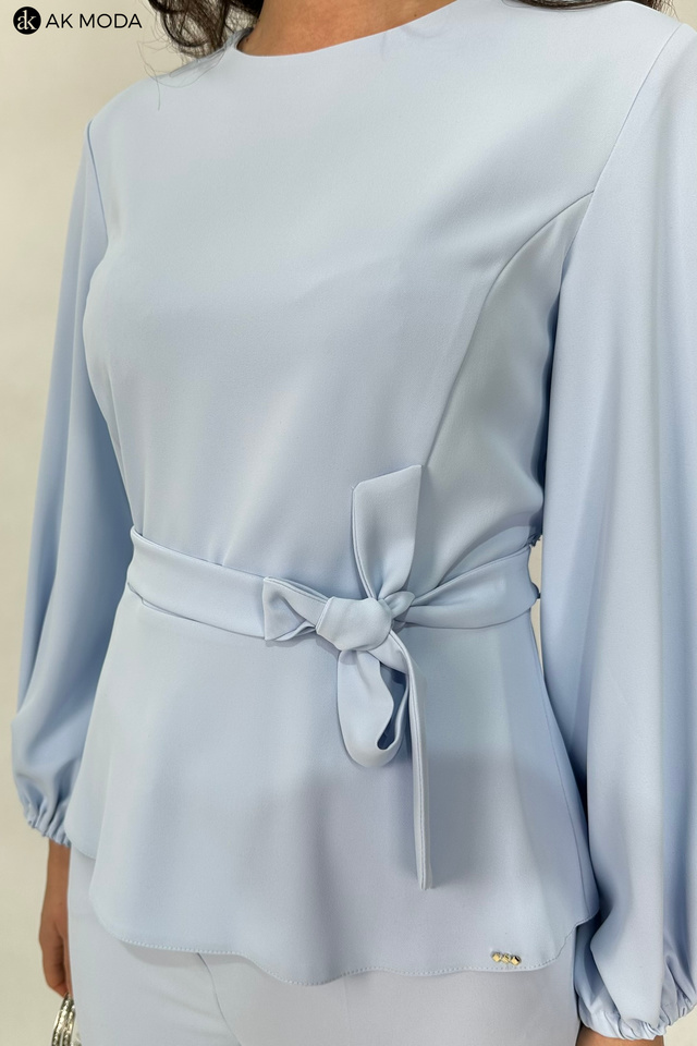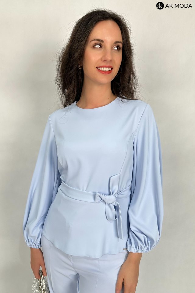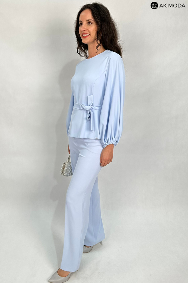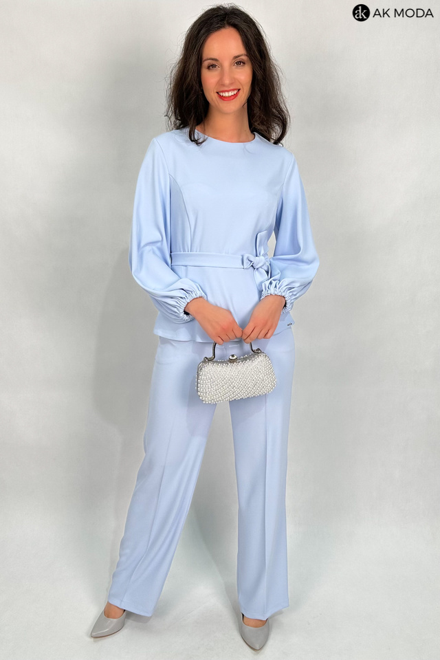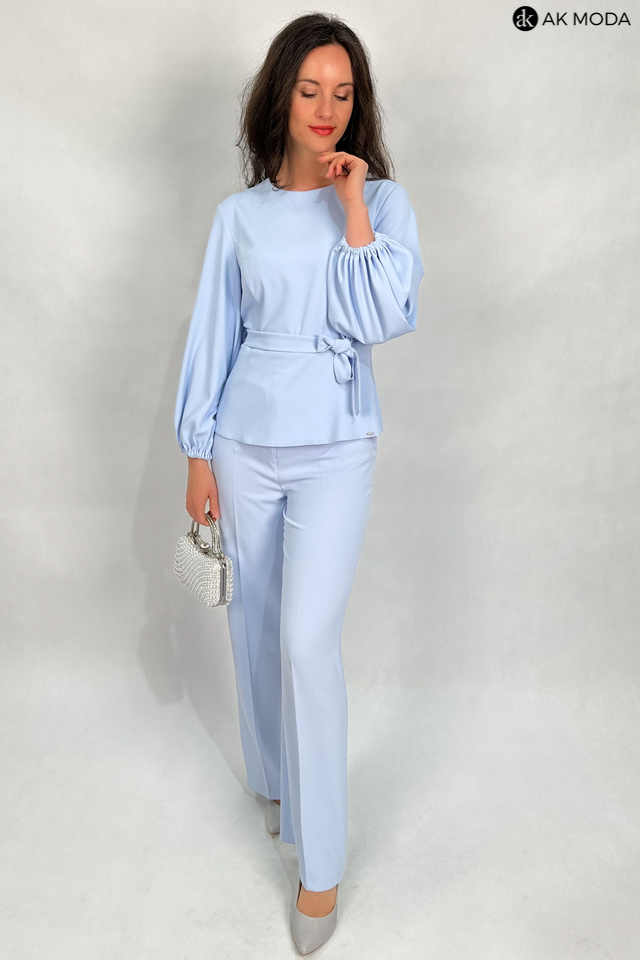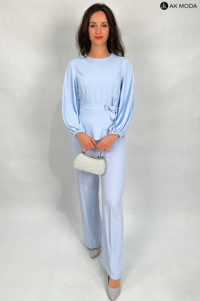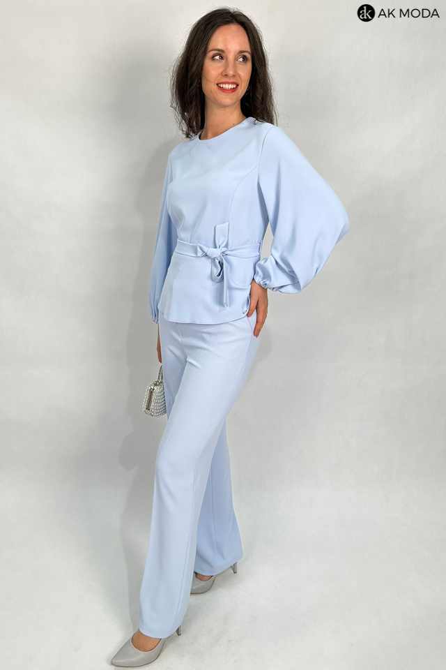 Elegancki komplet damski w kolorze błękitnym. W skład zestawu wchodzi bluzka z długimi, bufiastymi rękawami i okrągłym dekoltem oraz spodnie z szerszymi nogawkami. Spodnie posiadają kieszenie.