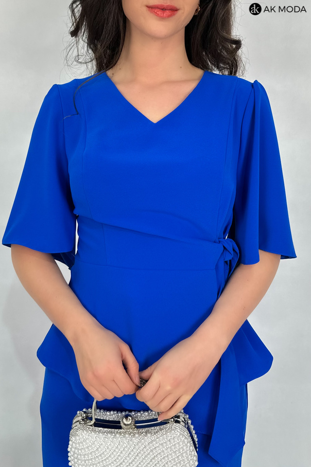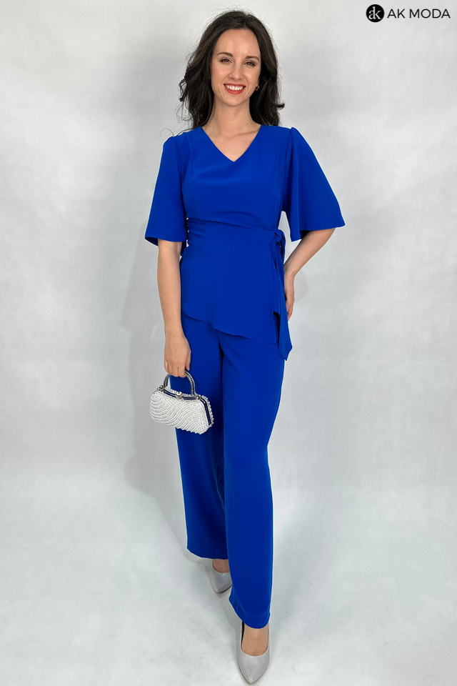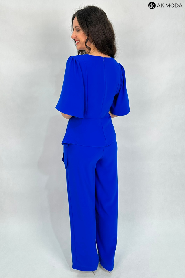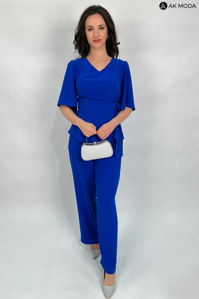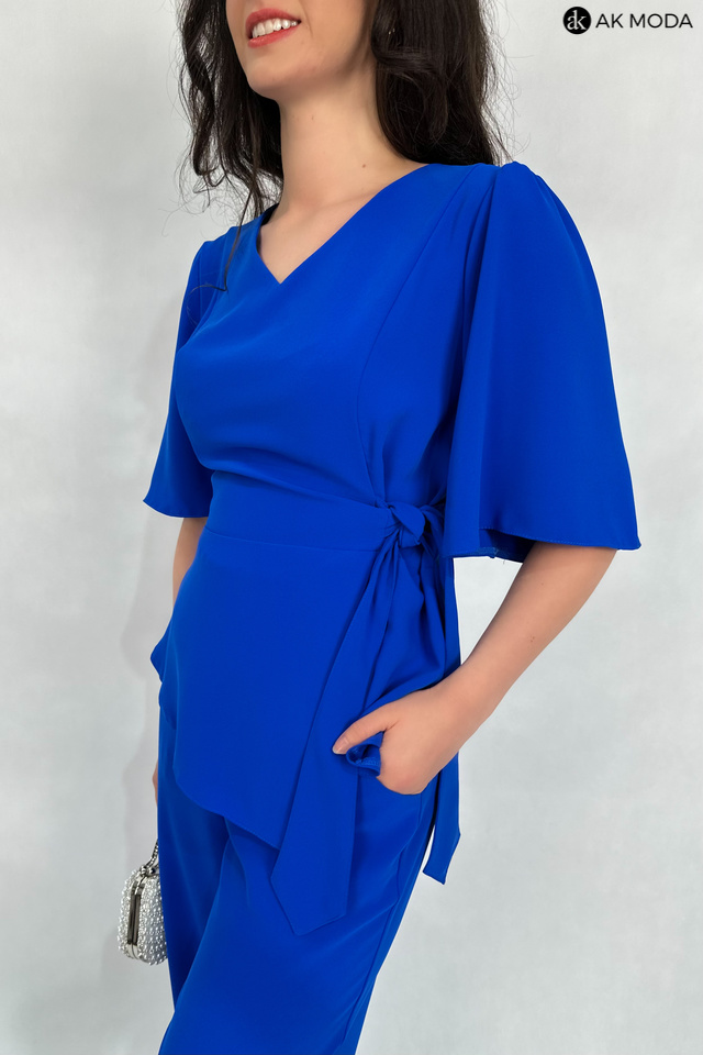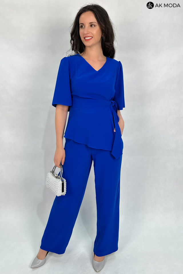 E;egancki komplet damski w kolorze chabrowym. W skład zestawu wchodzi dłuższa, luźna bluzka z dekoltem w szpic i wiązaniem w talii oraz spodnie z szerszymi nogawkami i gumką w pasie. Spodnie posiadają kieszenie.