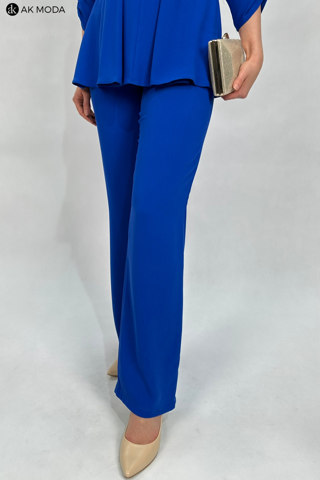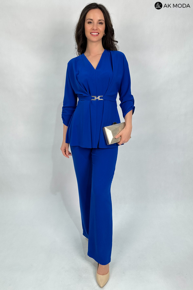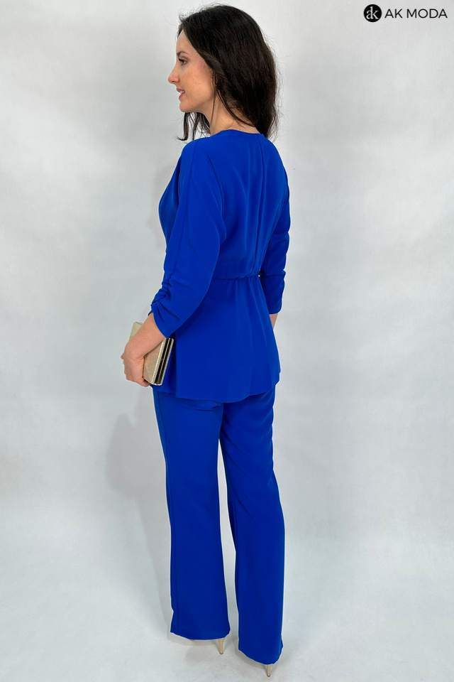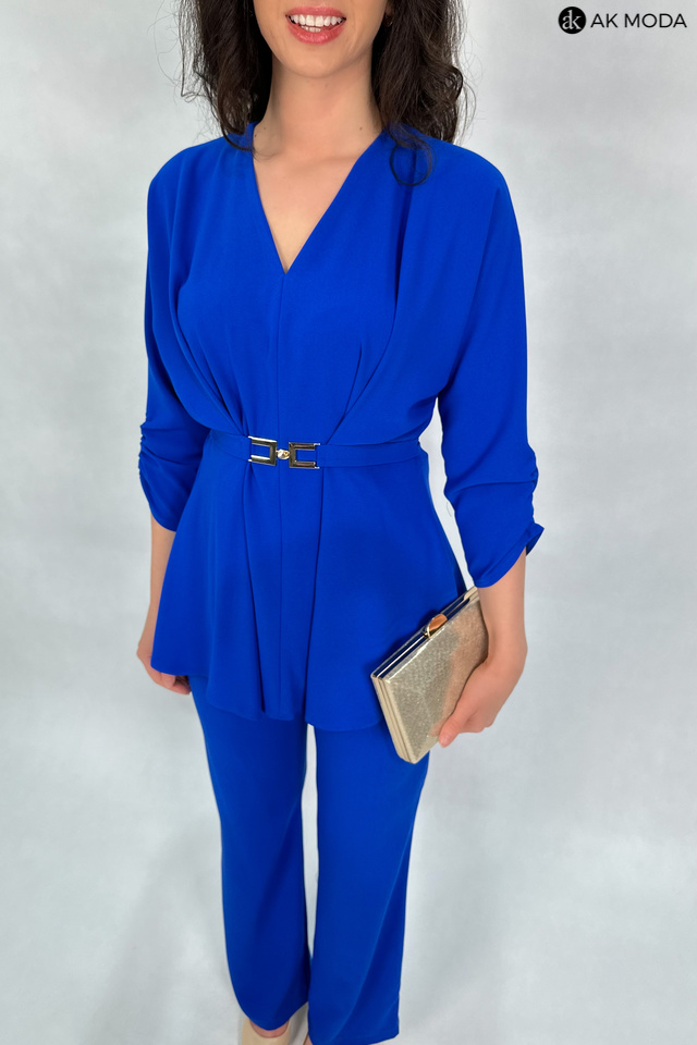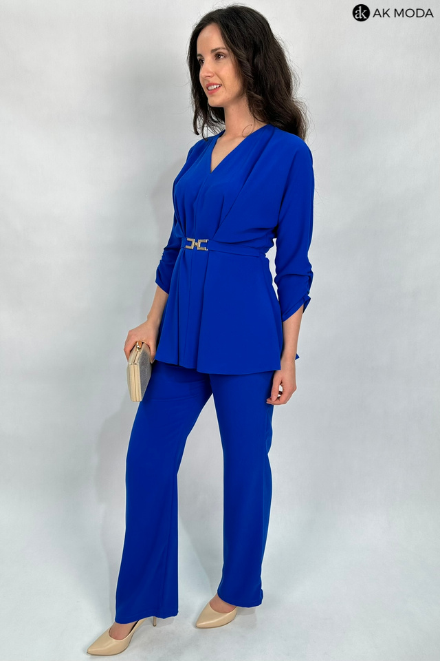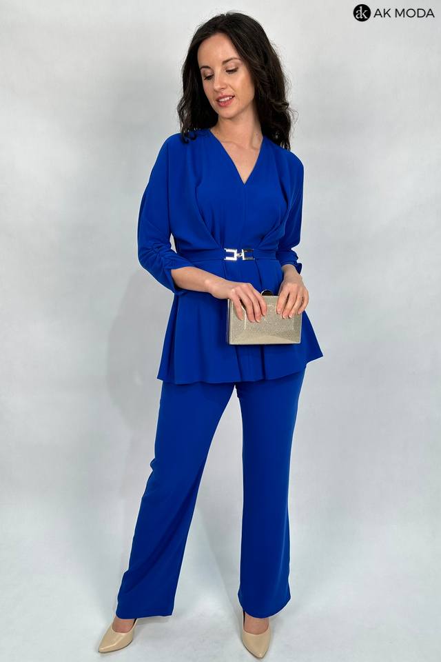 Elegancki komplet damski w kolorze chabrowym. W skład zestawu wchodzi spinana klamrą dłuższa bluzka z gumką na plecach oraz spodnie z szerszymi nogawkami i gumką w pasie. Spodnie posiadają kieszenie.