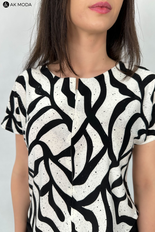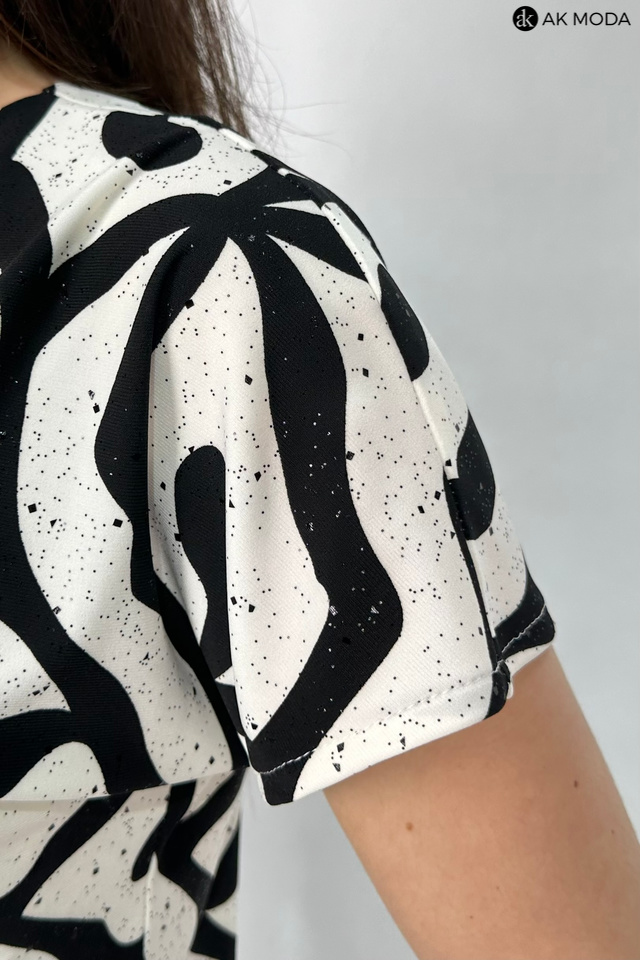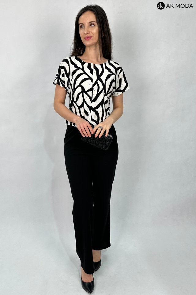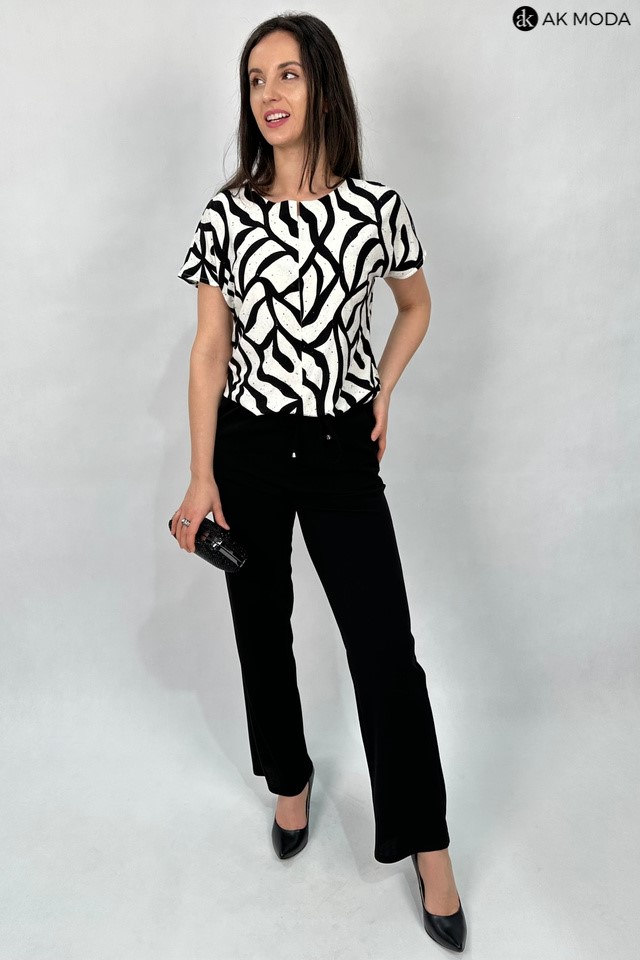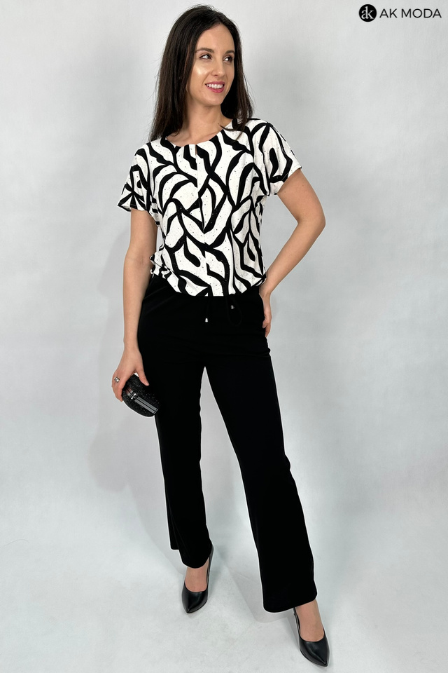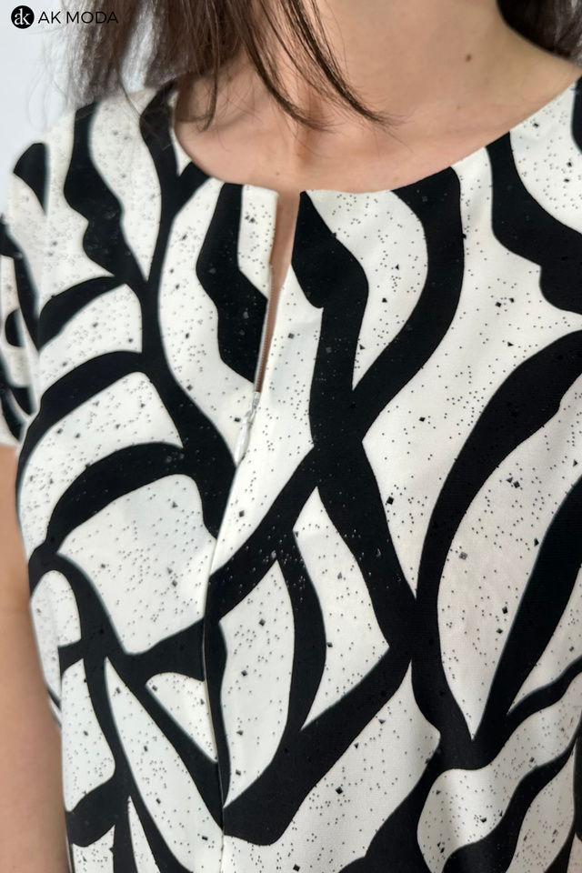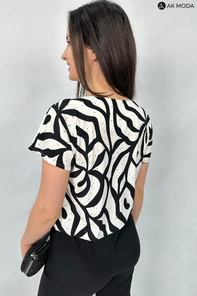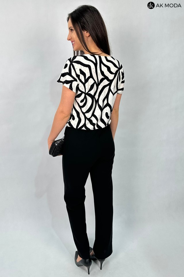 Elegancki kombinezon damski o luźnym kroju, zapinany z przodu na zamek. W talii gumka oraz troczek do wiązania wszyty w tunel. Góra w kolorze czarno-śmietankowym z delikatnie błyszczącymi akcentami, dół gładki w kolorze czarnym.